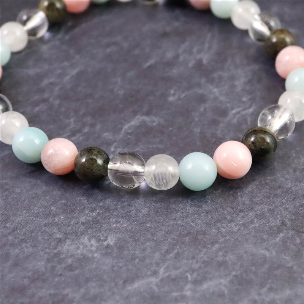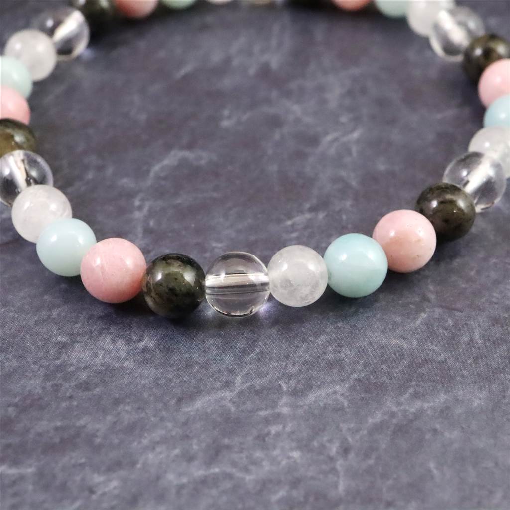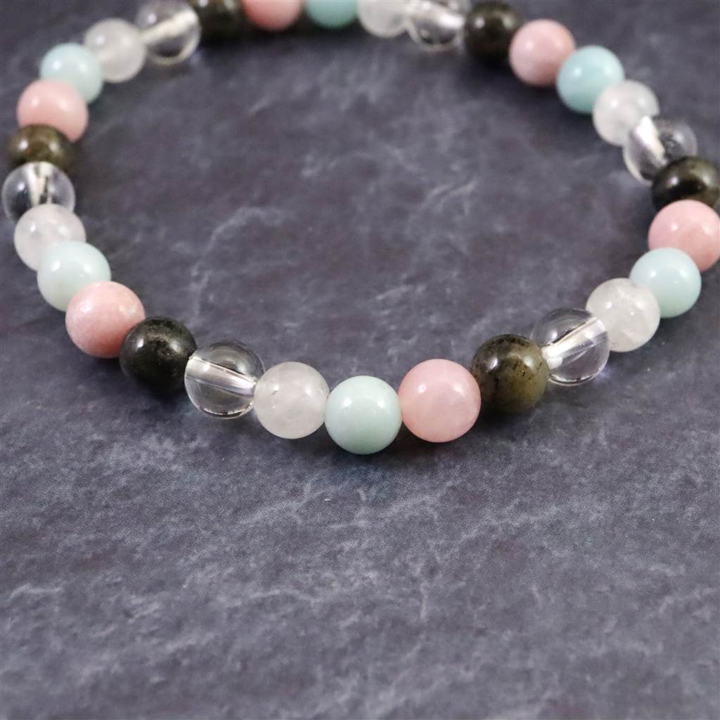 ◆ H&E社が提唱するシナジーブレスレットの【フェナカイト Joy, Love&Light (喜び、愛と光) 】です。ノルウェー産フェナカイト(黒)、サチャロカクリアアゼツライト(透明)、アゼツライト(白)、アズマー(青)、ピンクペタライトの5種類のパワーストーンを組み合わせとなります。