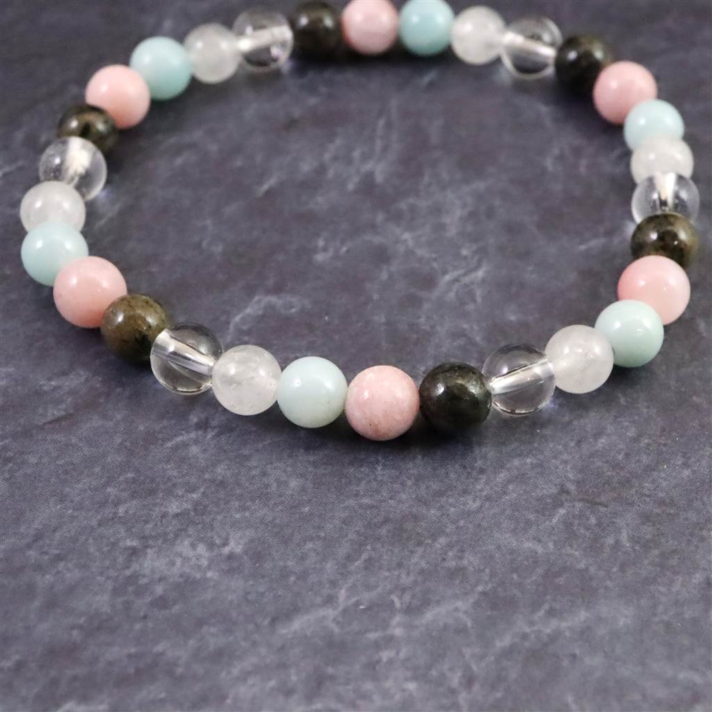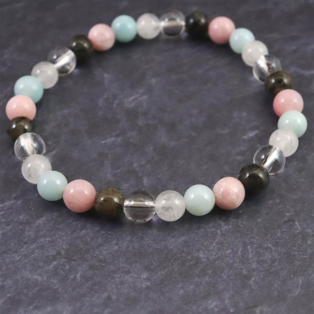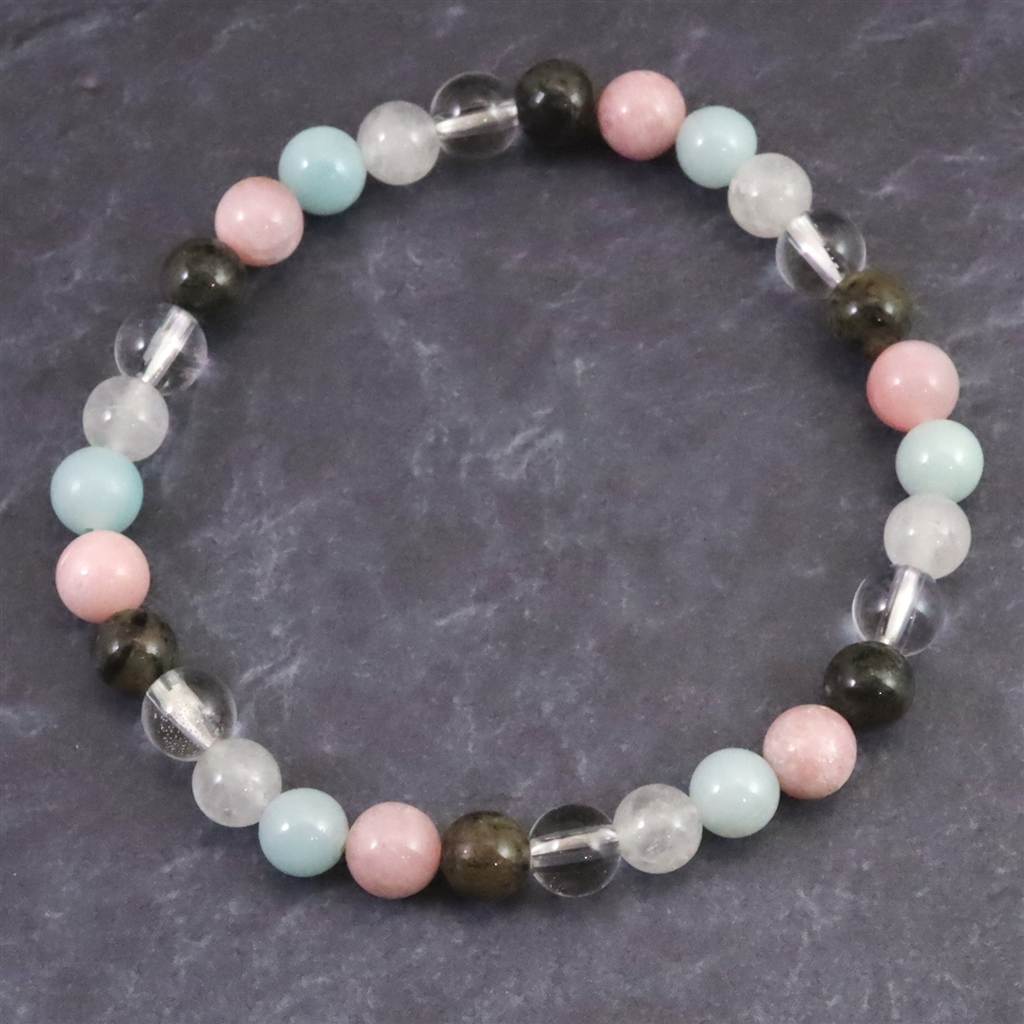 ◆ H&E社が提唱するシナジーブレスレットの【フェナカイト Joy, Love&Light (喜び、愛と光) 】です。ノルウェー産フェナカイト(黒)、サチャロカクリアアゼツライト(透明)、アゼツライト(白)、アズマー(青)、ピンクペタライトの5種類のパワーストーンを組み合わせとなります。
