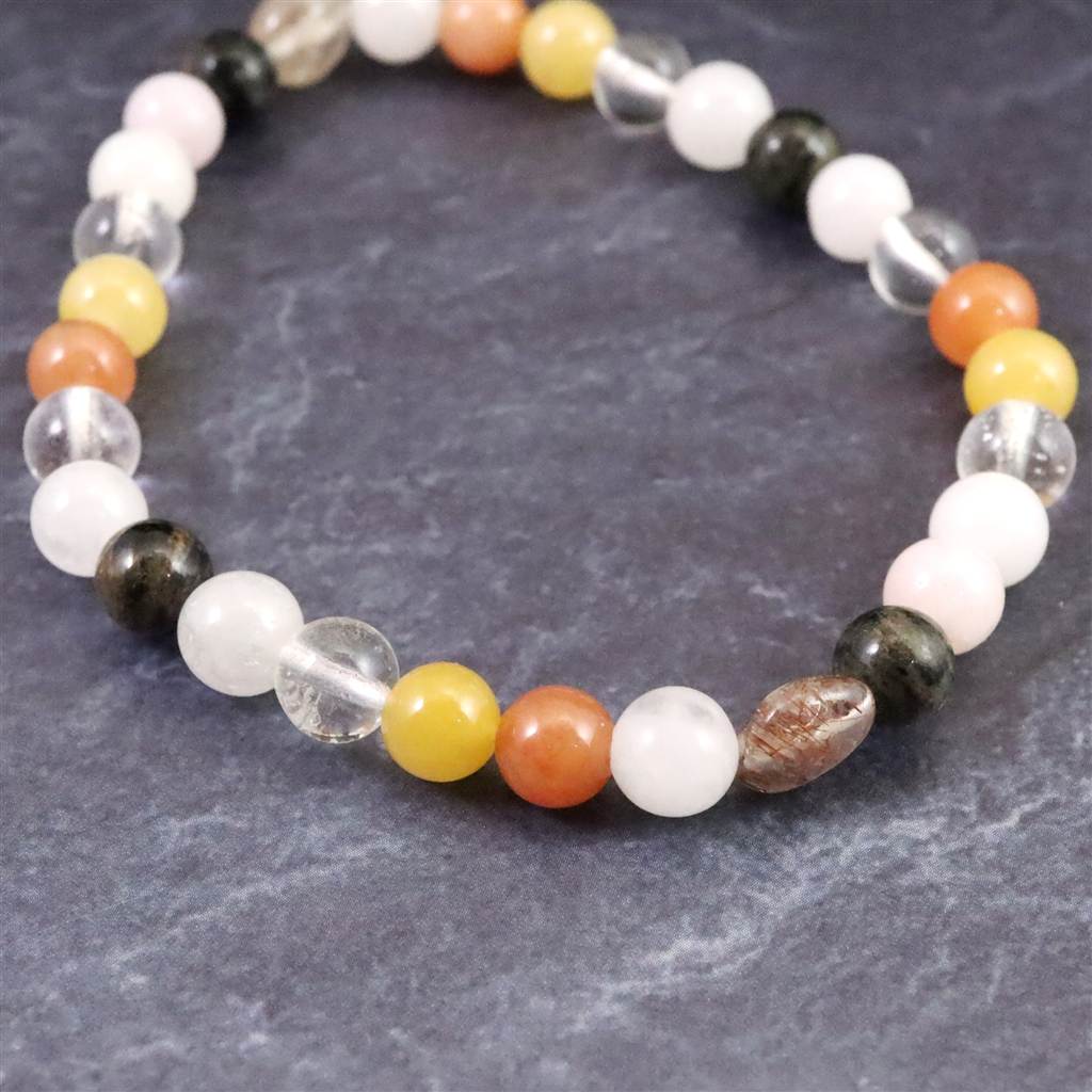 ◆ H&E社が提唱するシナジーブレスレットの【フェナカイトアセンション 】です。同社のノルウェー産フェナカイト(黒)、サチャロカクリアアゼツライト(透明)、アゼツライト(白)、ブルッカイト(フリーフォームビーズ)、ピンクペタライト、サチャロカイエローアゼツライト、サチャロカローズアゼツライトの7種類のパワーストーンを組み合わせとなります。