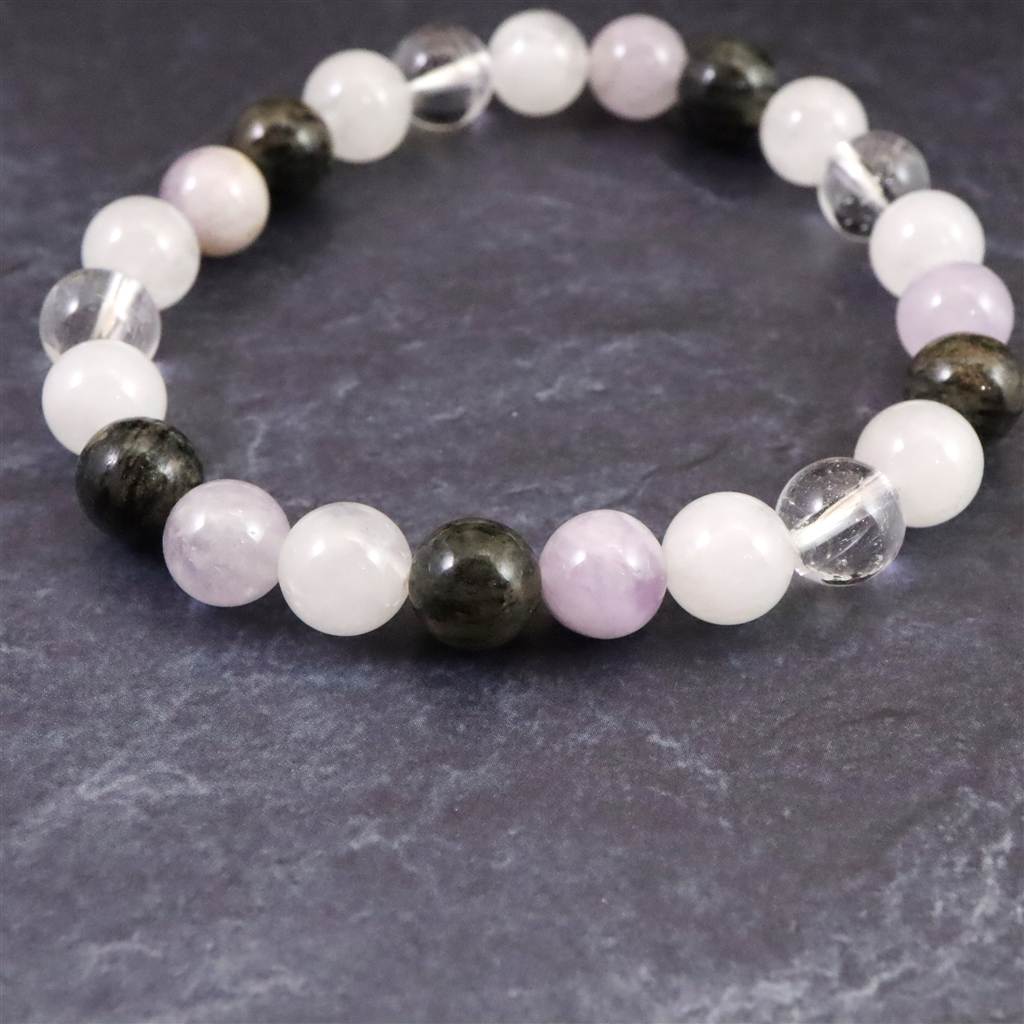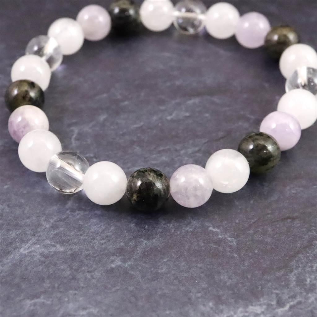 ◆ H&E社が提唱するシナジーブレスレットの【フェナカイトクリアライト(純粋な光) 】です。同社のノルウェー産フェナカイト(黒)、アマゼツ(紫)、アゼツライト(白)、NZアゼツライト(白)、サチャロカクリアアゼツライト(透明)の5種類のパワーストーンを組み合わせとなります。