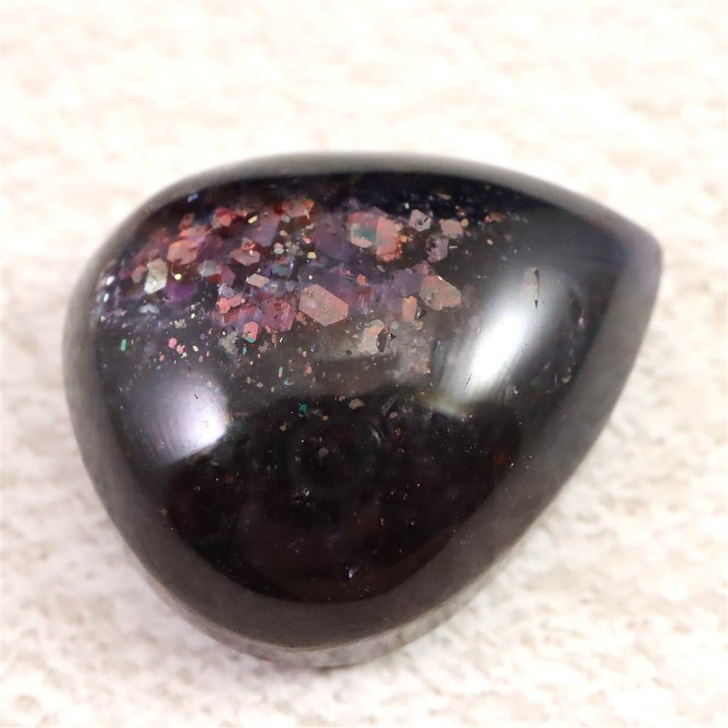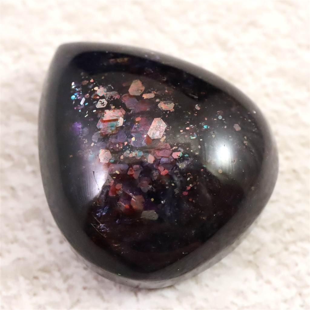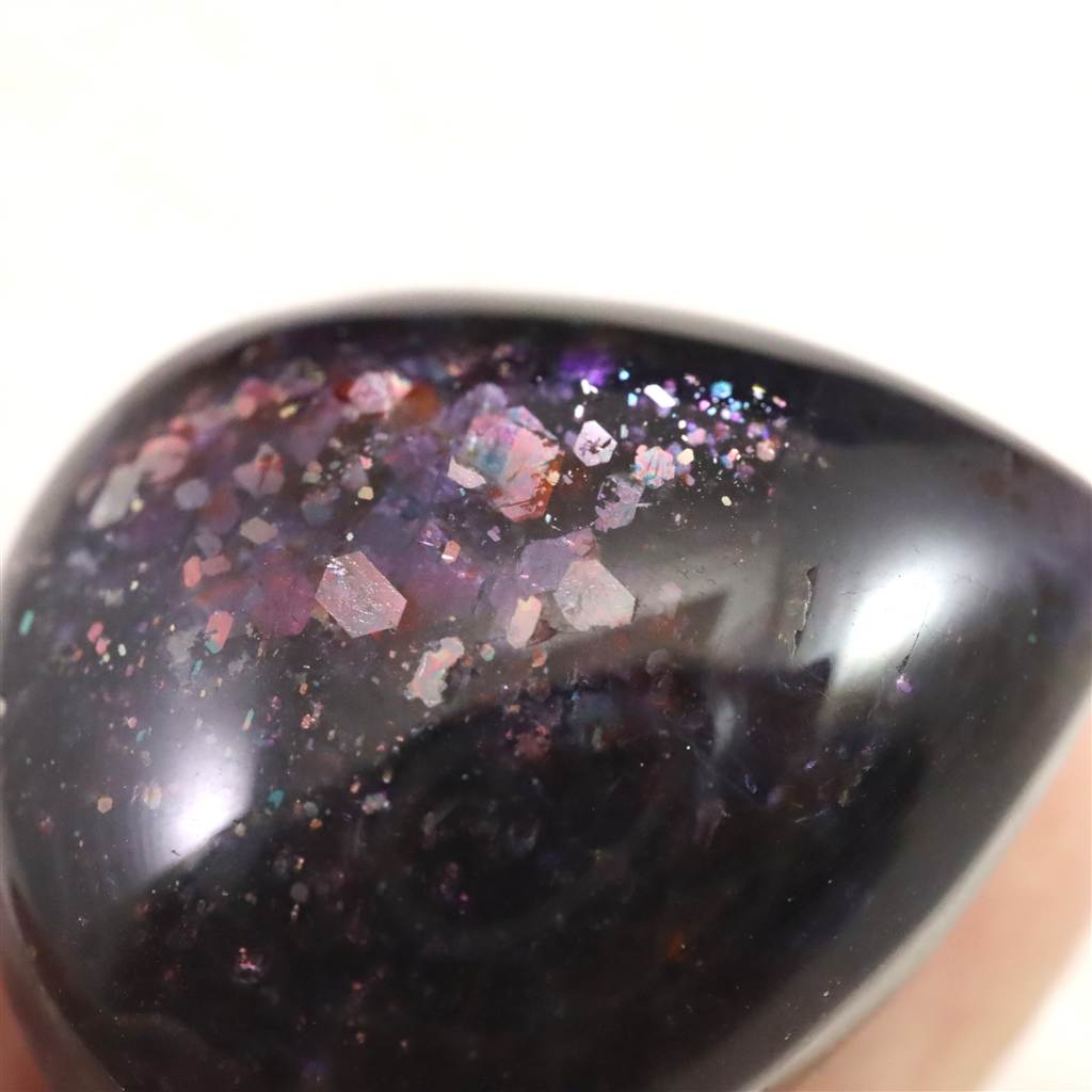 ◆ 鉱物名はコーディエライト。静謐な菫色を持つアイオライトの中に、ヘマタイトやレピドクロサイトなどの赤い鉱物が内包された希少な変種です。アイオライト特有の多色性と、内包物が光を反射して輝くアベンチュレッセンスが同居し、その名の通り「血潮」や「夕暮れの宇宙」を思わせる独創的な美しさを放ちます。