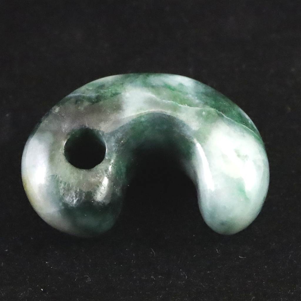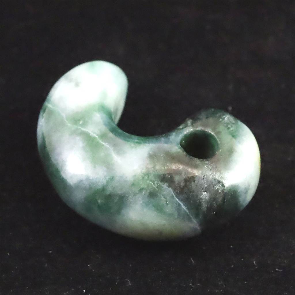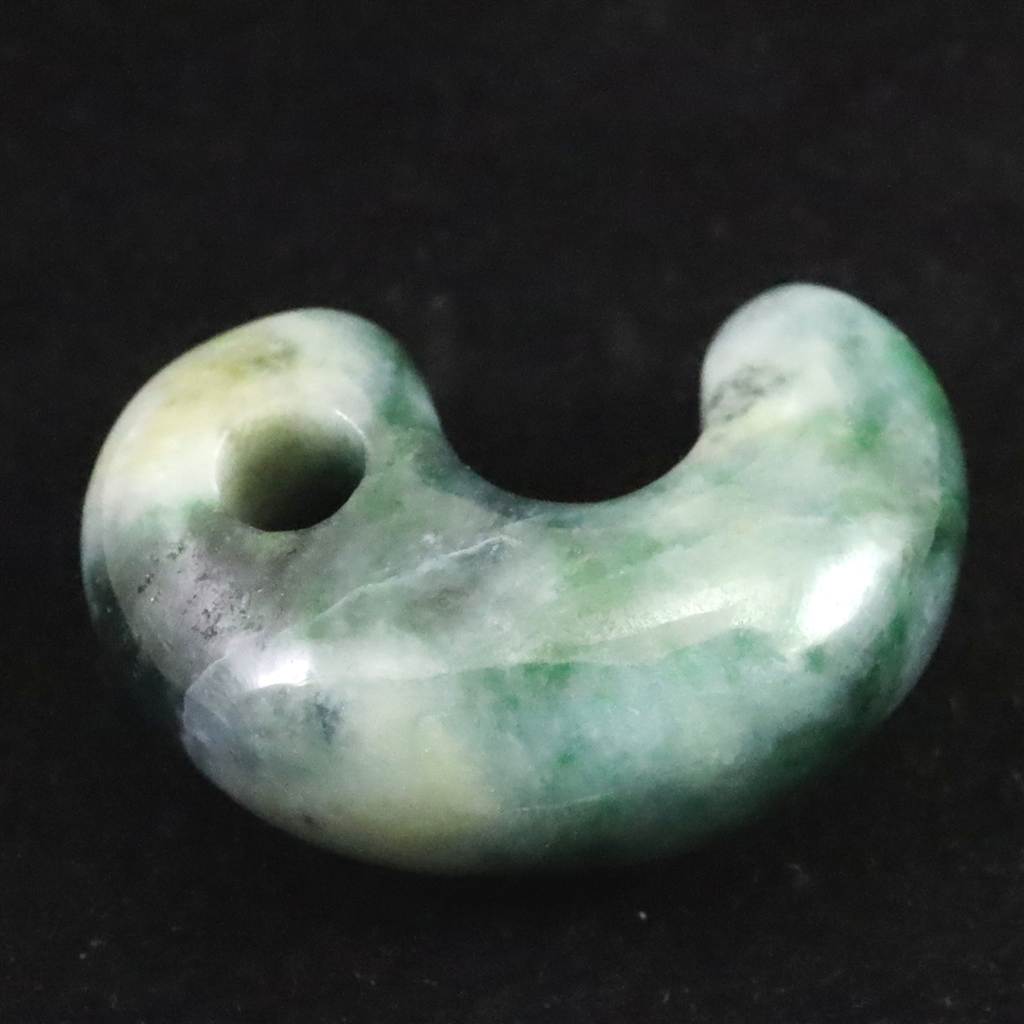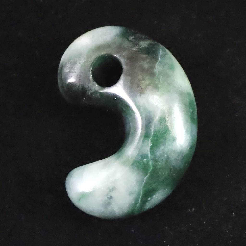 ◆ 新潟県糸魚川市で産出される糸魚川翡翠は、日本国内で唯一の本翡翠の産地として知られ、古くから勾玉や装飾品に重用されてきました。本品は、その貴重な糸魚川翡翠を用いた勾玉です。翡翠は古来、魔除けや守護の石として親しまれ、持ち主の心身を守る存在とされています。小滝川の清流で洗われ、日本海の荒波に磨かれた糸魚川翡翠は、ミャンマー産翡翠に見られる風化皮膜を持たず、半艶のなめらかな質感と、結晶面の煌めきが魅力です。