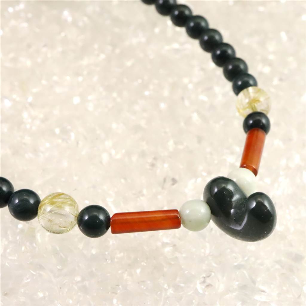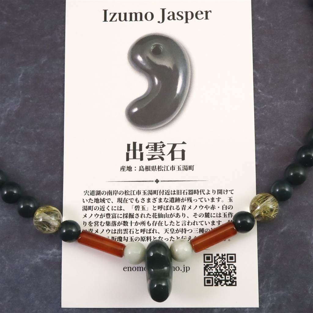 ◆ 本商品写真は現物のものです。写真の商品をお届けします。画像のディレクトリーカードをお付けいたします。緑色の勾玉、丸玉ビーズは、ともにすべて出雲石でできております。そのほか赤い管玉はブラジル産カーネリアン、ゴールドルチル入り水晶ビーズもブラジル産、白いビーズはミャンマー産翡翠です。