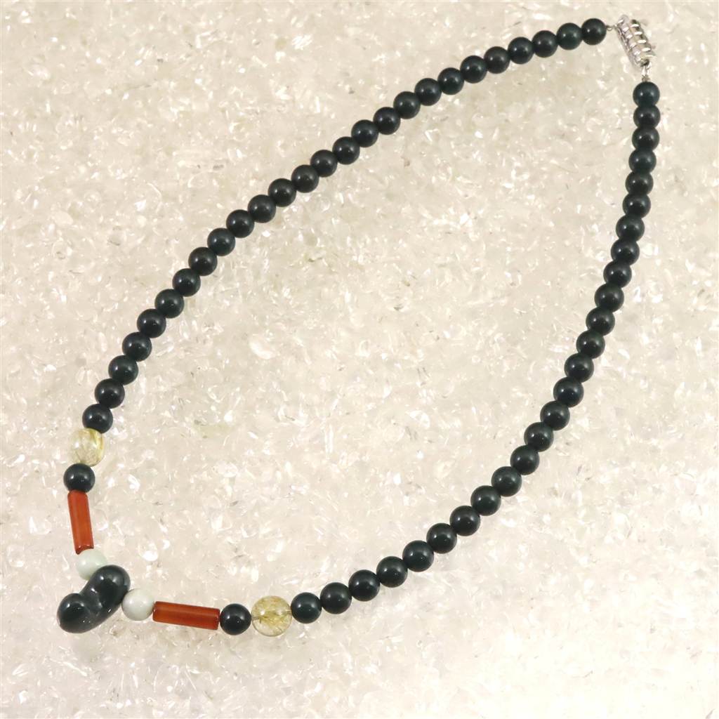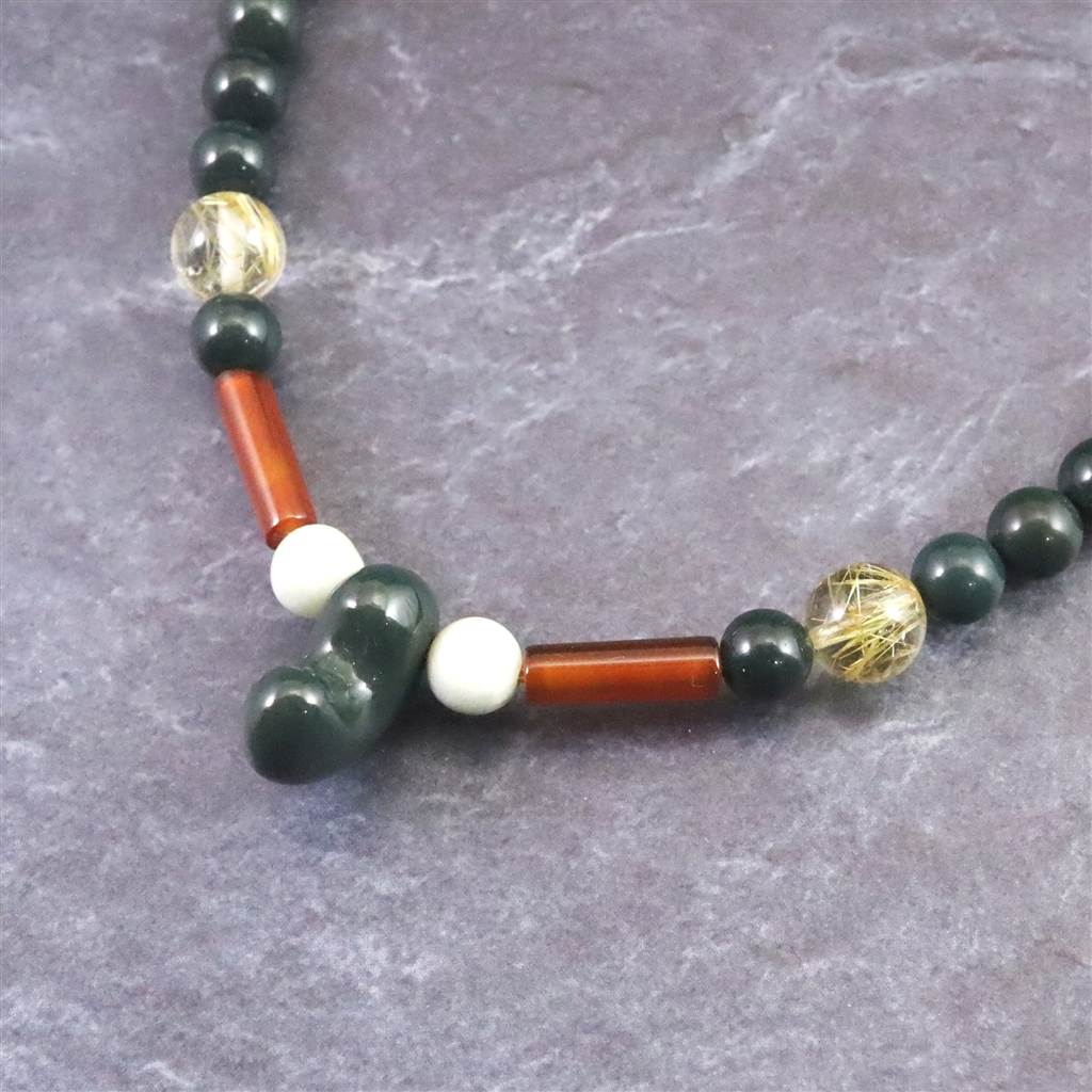 ・サイズ(mm) :出雲石勾玉18 X 15 X 7+カーネリアン管玉13mmX4mm +出雲石ビーズ6.5mm+ミャンマー産翡翠6.5mm+ゴールドルチル入り水晶ビーズ8mm /ネックレス長 約40cm