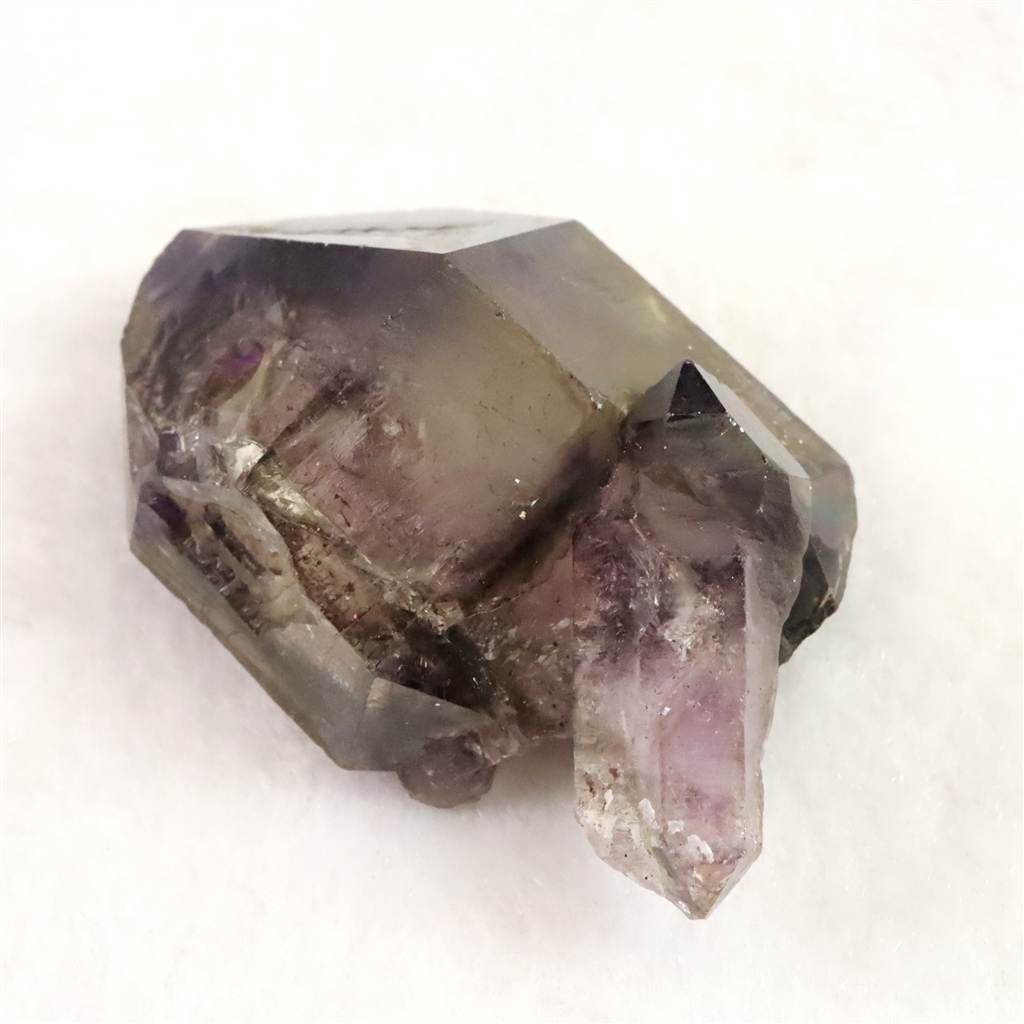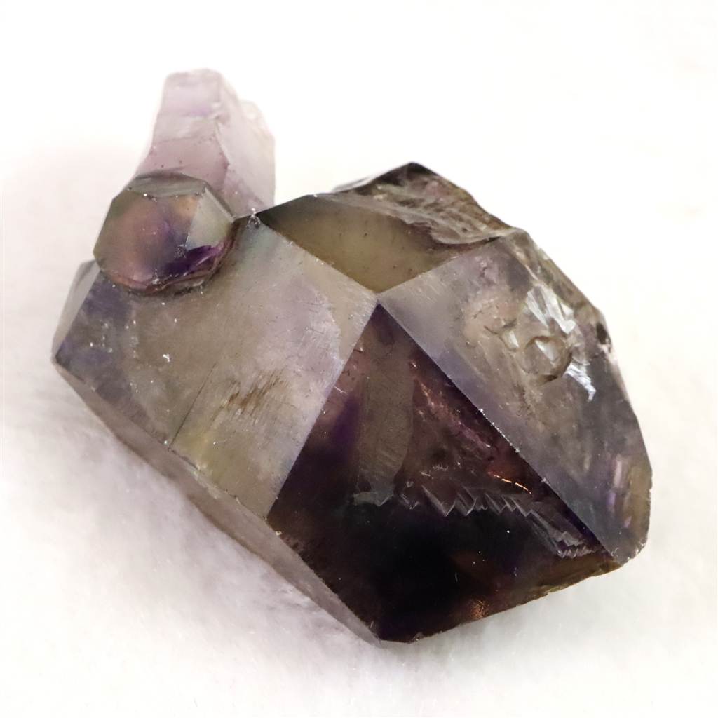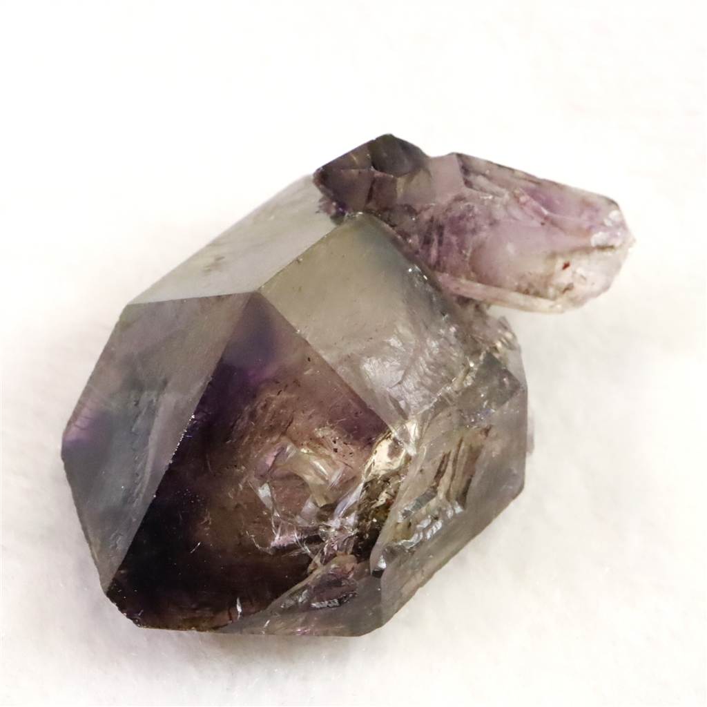 ◆ ブランドバーグ産アメジストのツイン・カテドラルです。光にかざすと、外側の輪郭は、スモーキー、内側にアメジストと白い雲のようなインクルージョンが混ざりあって美しい世界を作り出しています。