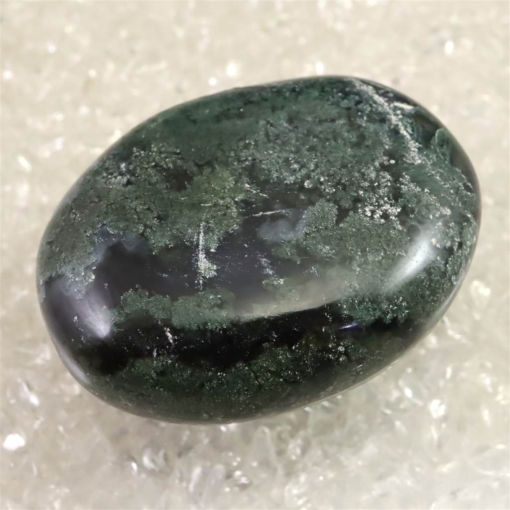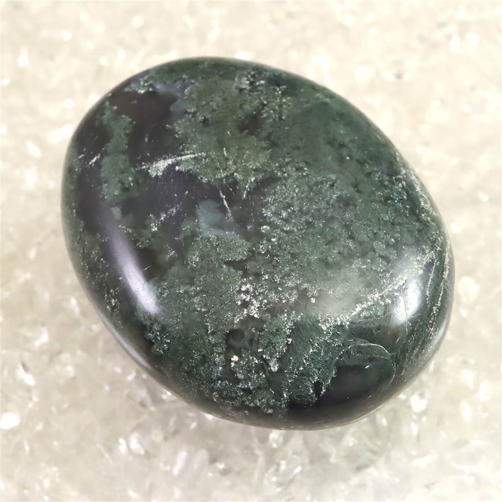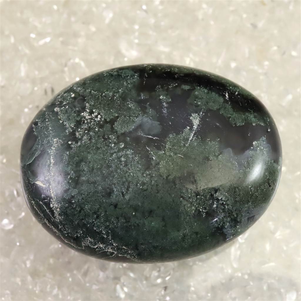 ◆ インド産モスアゲートは、カルセドニーの一種で、透明から乳白色の地にマンガンや鉄の酸化物が樹枝状に入り込み、苔のような模様を生み出すことからその名が付けられています。縞模様の乏しいカルセドニーでありながら、自然が描いた絵画のような景観を石の内部に宿す点が魅力です。インドではデカントラップス周辺、特にマハーラーシュトラ州アウランガーバードなどから産出が知られています。大地や自然とのつながりを象徴する石とされ、持つ人に安定感や安心感をもたらすといわれます。また、心を穏やかに整え、忍耐や調和を育む助けとなると伝えられてきました。鉱物学的な特性とともに、内包物が織りなす模様や精神的象徴性をあわせて楽しめる石です。