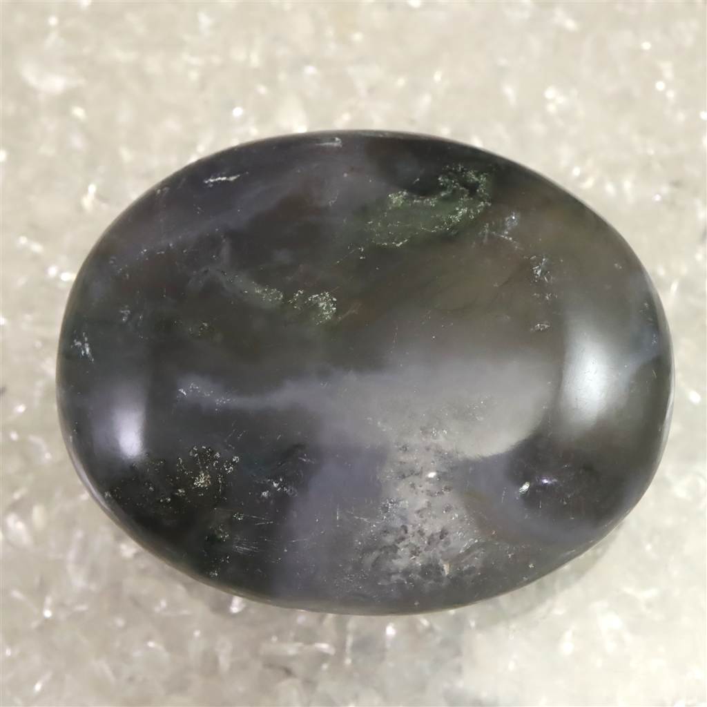 ◆ インド産モスアゲートは、カルセドニーの一種で、透明から乳白色の地にマンガンや鉄の酸化物が樹枝状に入り込み、苔のような模様を生み出すことからその名が付けられています。縞模様の乏しいカルセドニーでありながら、自然が描いた絵画のような景観を石の内部に宿す点が魅力です。インドではデカントラップス周辺、特にマハーラーシュトラ州アウランガーバードなどから産出が知られています。大地や自然とのつながりを象徴する石とされ、持つ人に安定感や安心感をもたらすといわれます。また、心を穏やかに整え、忍耐や調和を育む助けとなると伝えられてきました。鉱物学的な特性とともに、内包物が織りなす模様や精神的象徴性をあわせて楽しめる石です。