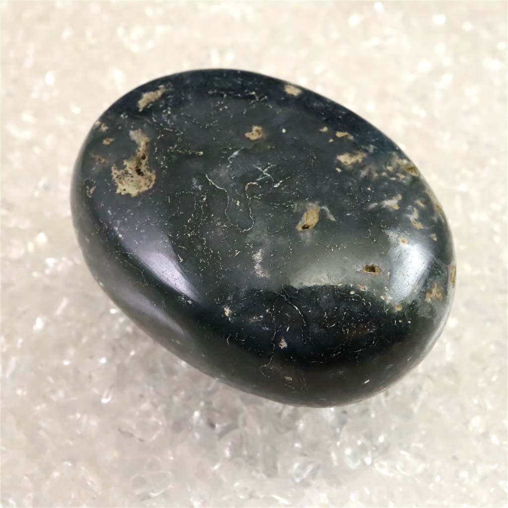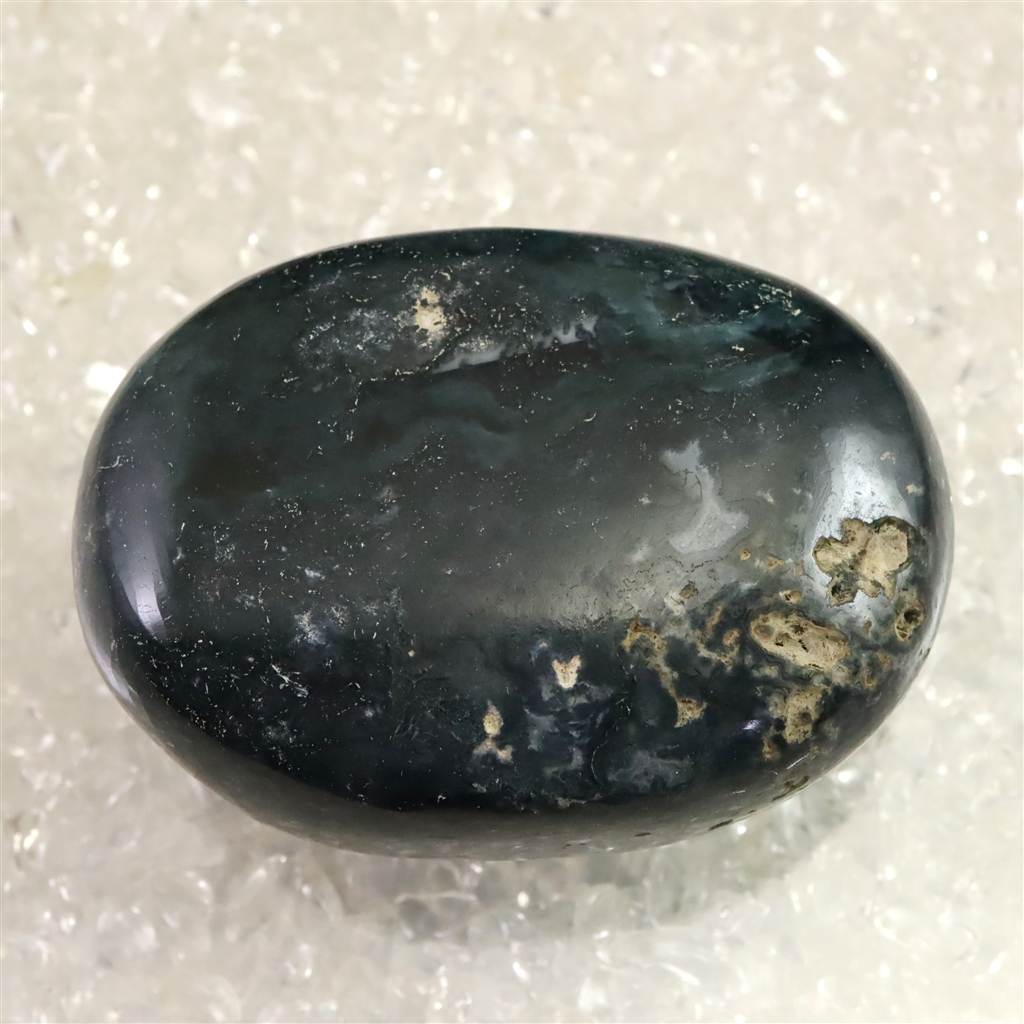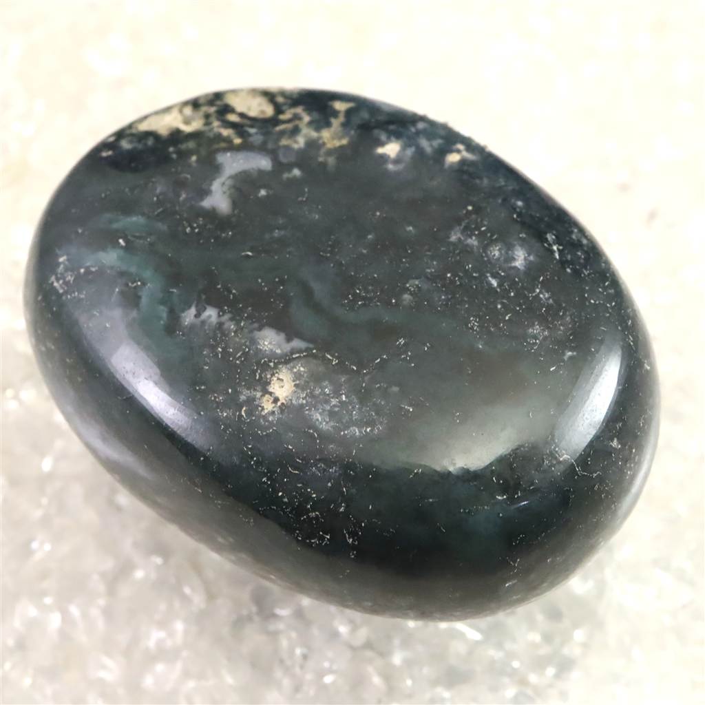 ◆ インド産モスアゲートは、カルセドニーの一種で、透明から乳白色の地にマンガンや鉄の酸化物が樹枝状に入り込み、苔のような模様を生み出すことからその名が付けられています。縞模様の乏しいカルセドニーでありながら、自然が描いた絵画のような景観を石の内部に宿す点が魅力です。インドではデカントラップス周辺、特にマハーラーシュトラ州アウランガーバードなどから産出が知られています。大地や自然とのつながりを象徴する石とされ、持つ人に安定感や安心感をもたらすといわれます。また、心を穏やかに整え、忍耐や調和を育む助けとなると伝えられてきました。鉱物学的な特性とともに、内包物が織りなす模様や精神的象徴性をあわせて楽しめる石です。