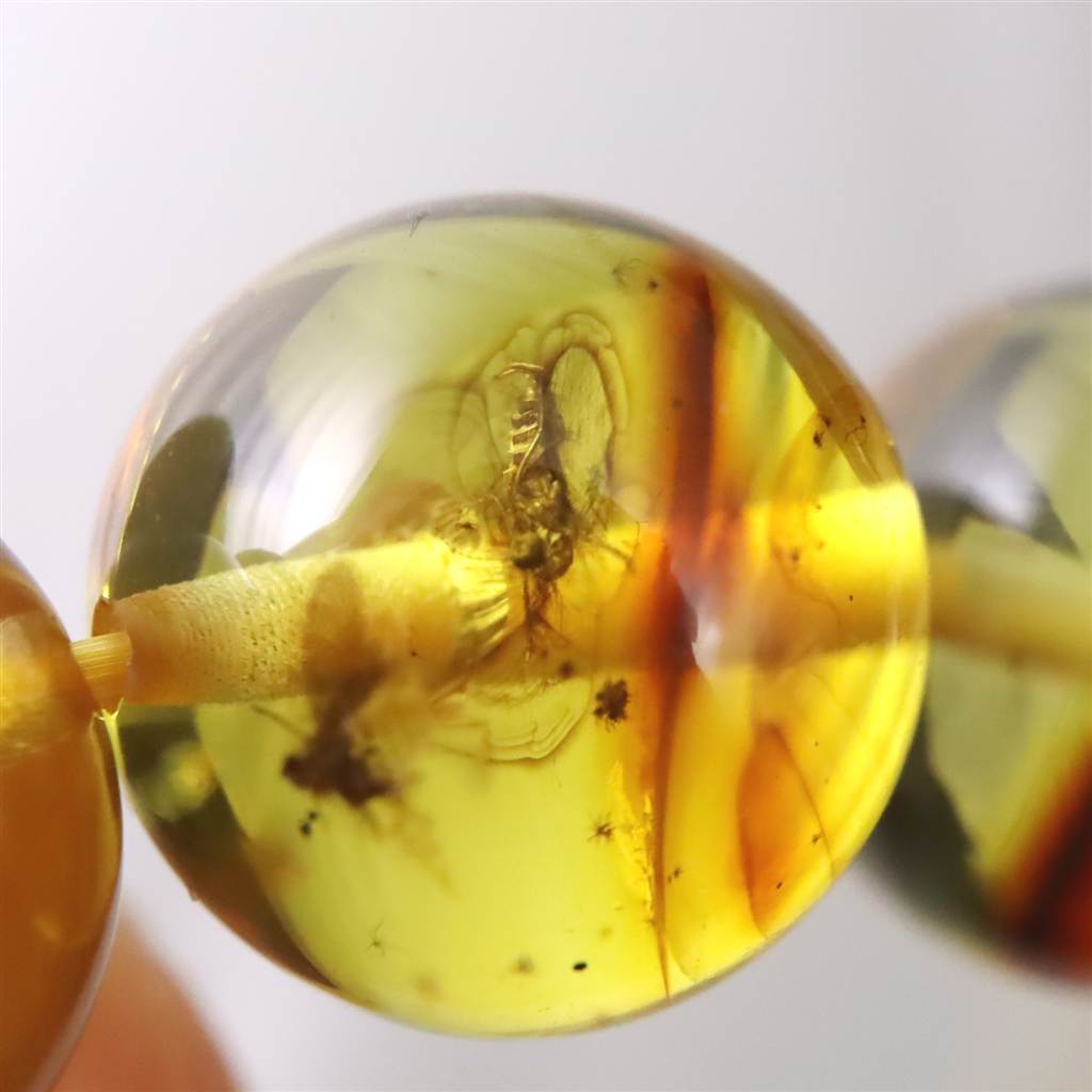 ◆ 本商品写真は現物のものです。写真の商品をお届けします。こちらの商品はブラウンの天然アンバー、天然琥珀です。 天然琥珀の粉を溶かして固めた加工入アンバー(プレストアンバー)ではありません。ほとんどのビーズにサイズ・種類も様々な昆虫が閉じ込められた貴重なブレスレットです。