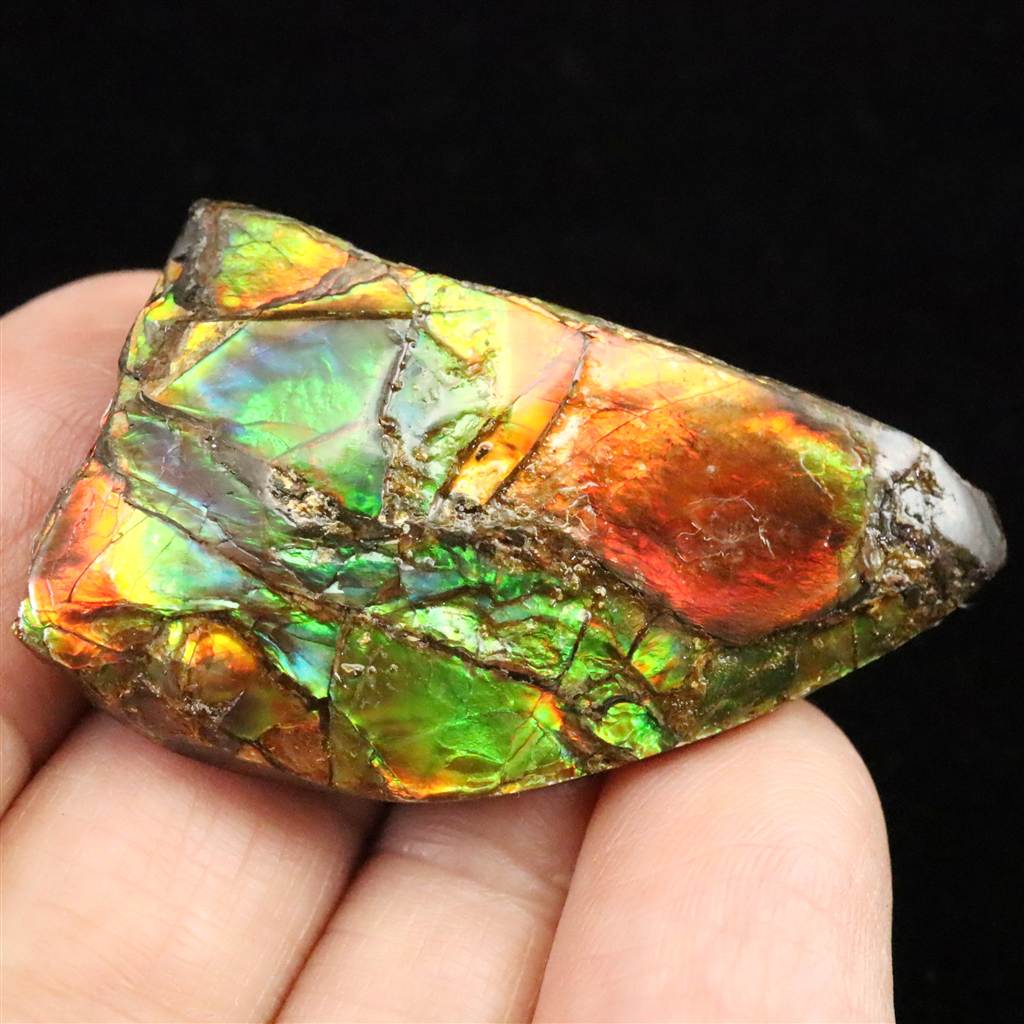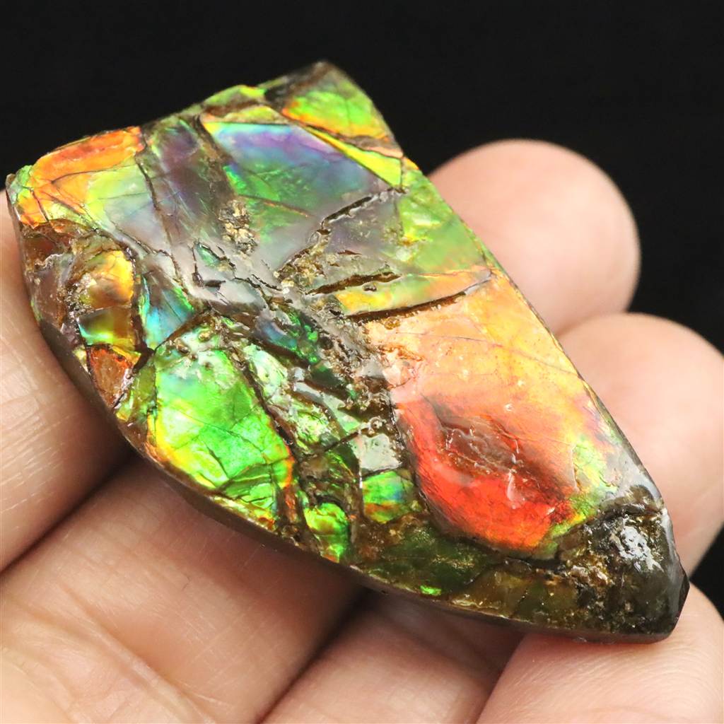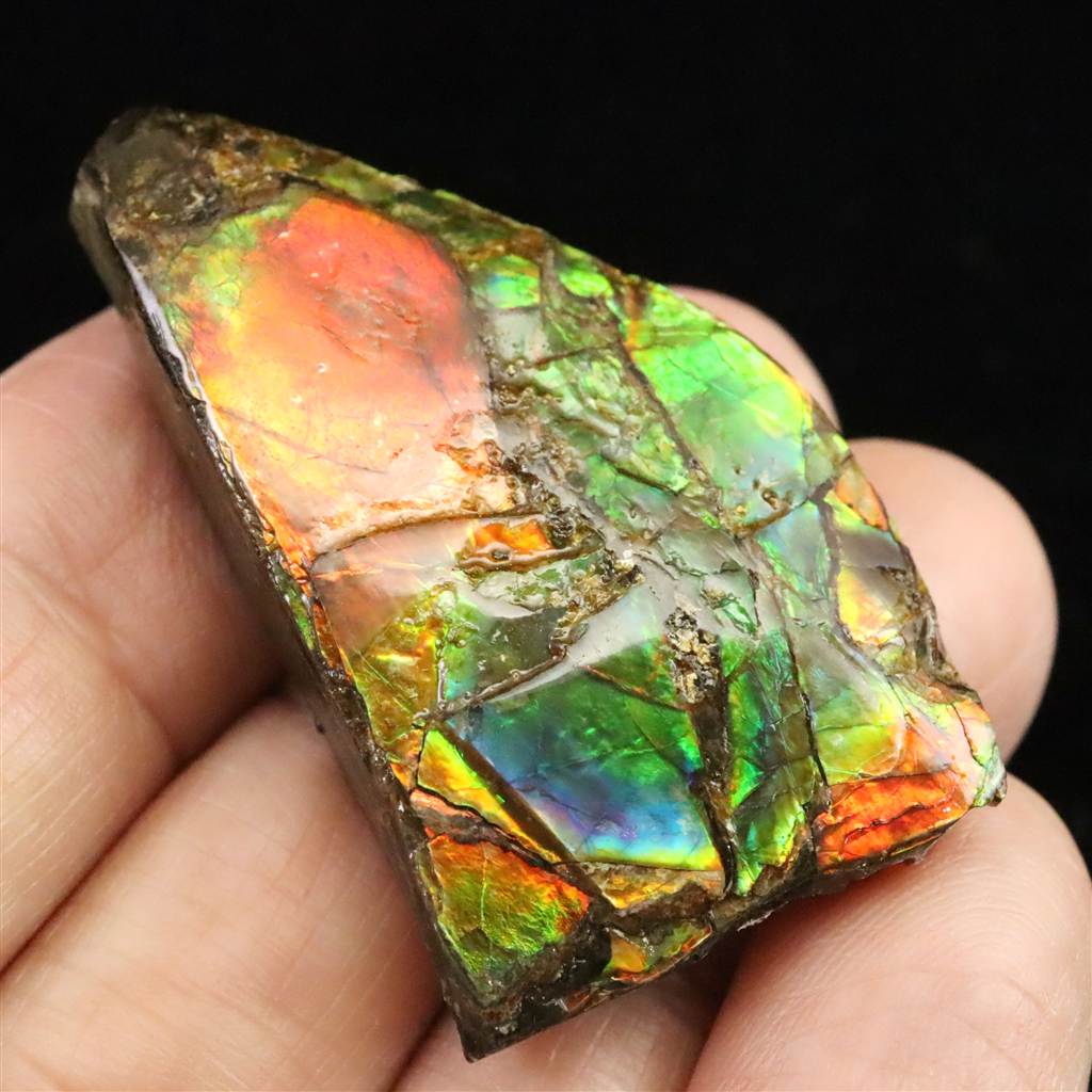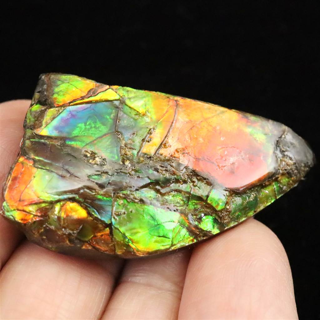 ◆ カナダ産のアンモライトは、化石化したアンモナイトの殻が多彩な色や模様で輝く希少な宝石や装飾品として知られています。アンモナイトは、約6,500万年前から約6,600万年前にかけての白亜紀後期から始新世初期にかけての時代に生息していた、古代の海生軟体動物の一種です。 アンモライトは、アンモナイトの外殻が鉱化する過程で、鮮やかな色や模様が形成されたものです。これらの色と模様は、鉱物や微小な結晶の配置によって生み出され、非常に美しい光沢を持っています。一般的な色には、緑、青、紫、黄、赤、オレンジなどがあります。 カナダでは、アルバータ州南部の一帯でアンモライトが採掘されています。特に有名なのは、カナダロッキーやバッドランズ地域で発見されるもので、その美しさから宝石やジュエリーとして利用されることがあります。アンモライトは、希少性と美しい色彩から、コレクターや宝飾愛好家に人気があります。