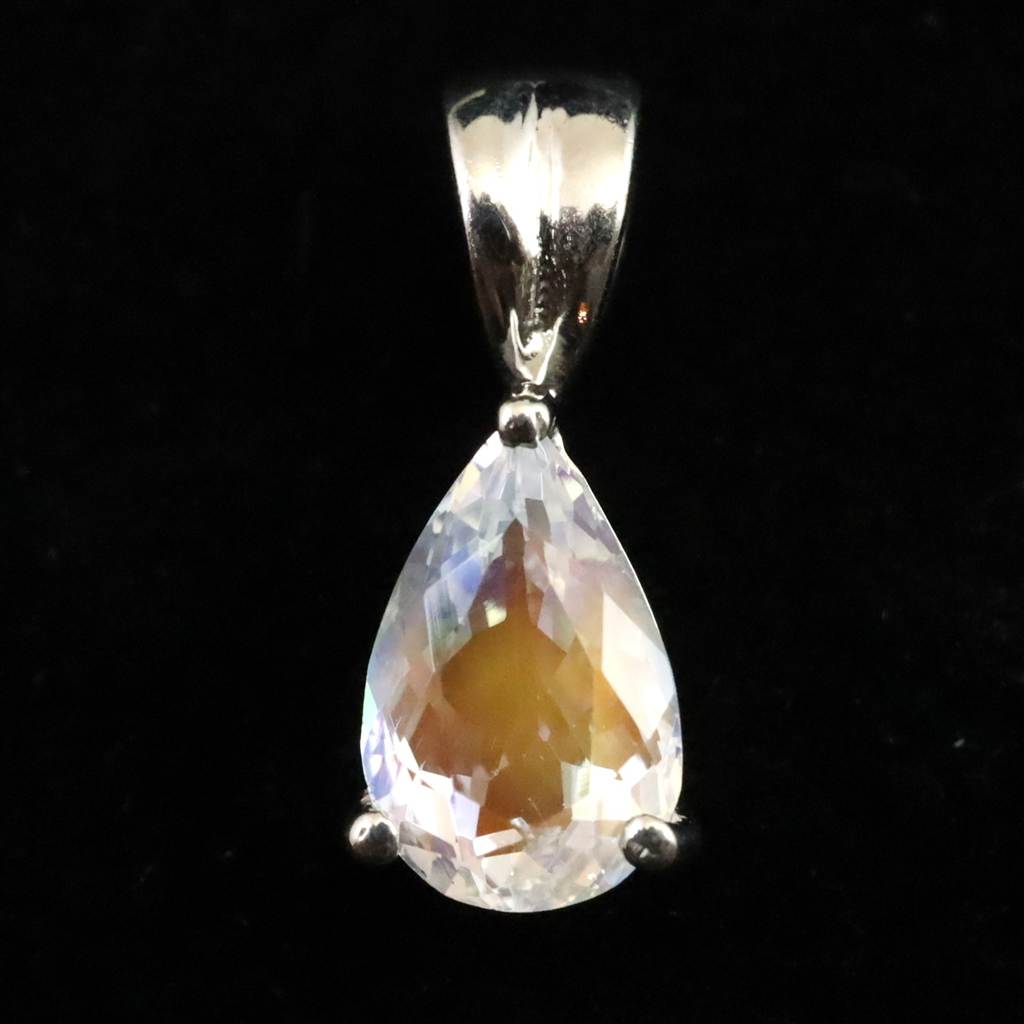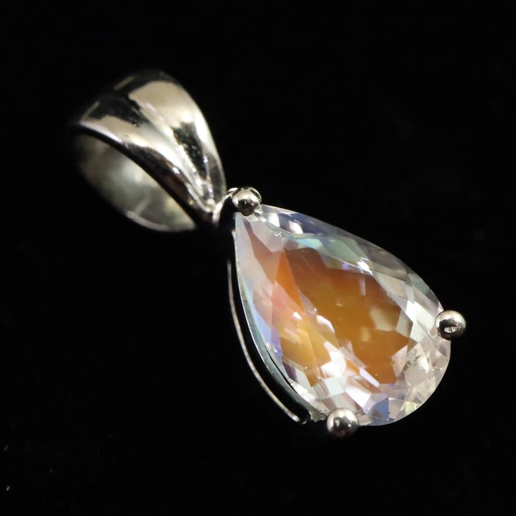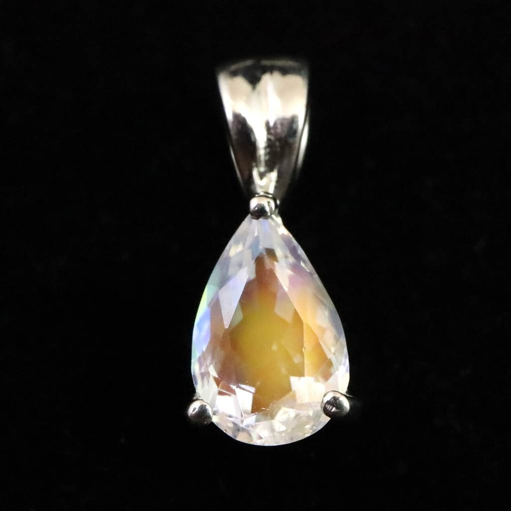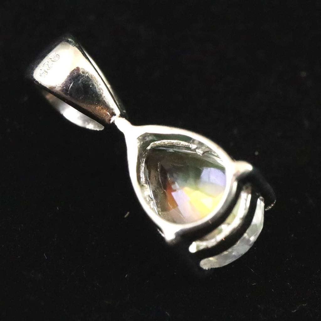 ◆ マダガスカル産アンデシンラブラドライト(レインボームーンストーン)のペンダントトップです。長石に属し、アンデシンとラブラドライトの中間組成をもつ鉱物で、透明度が高く、表面に虹色のシラーが広がる幻想的な美しさが魅力です。角度により青や緑、橙など多彩に変化する輝きは、まるでレインボーの光を映すように華やかさを添えます。インドやスリランカでは「月の石」として古くから親しまれ、ヨーロッパでも19世紀に人気を博しました。近年はマダガスカル産の高品質結晶が限られた鉱床から少量のみ産出するため流通量は少なく、希少性の高い天然石として注目されています。