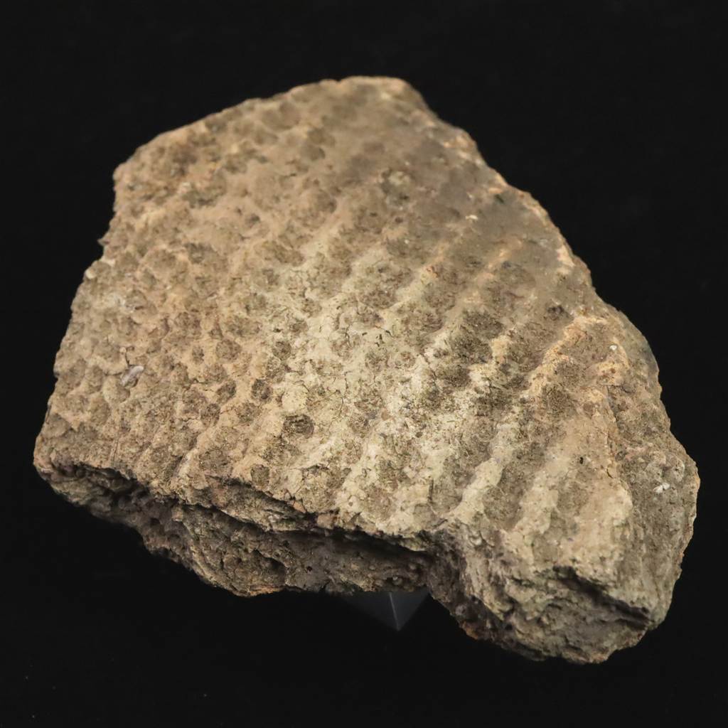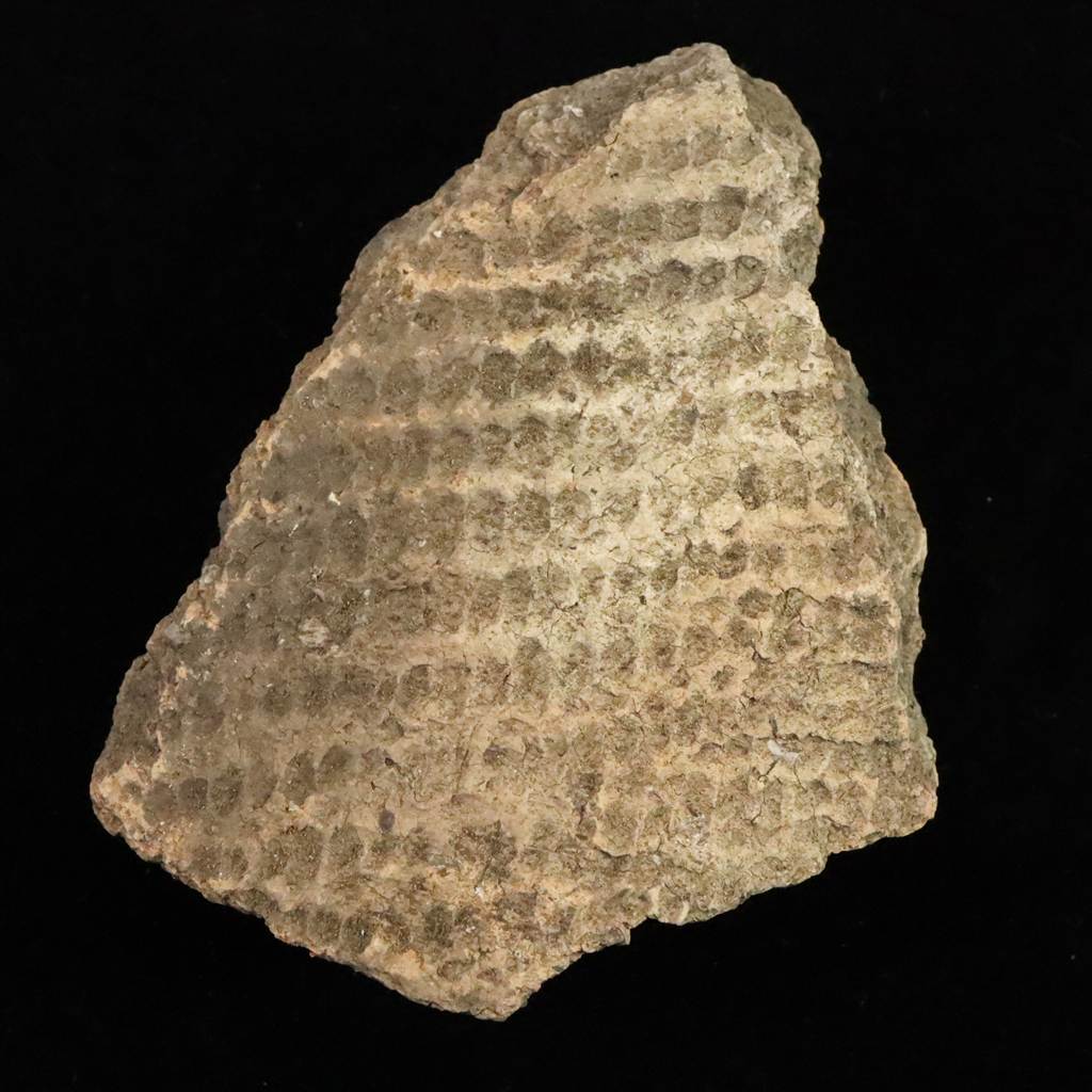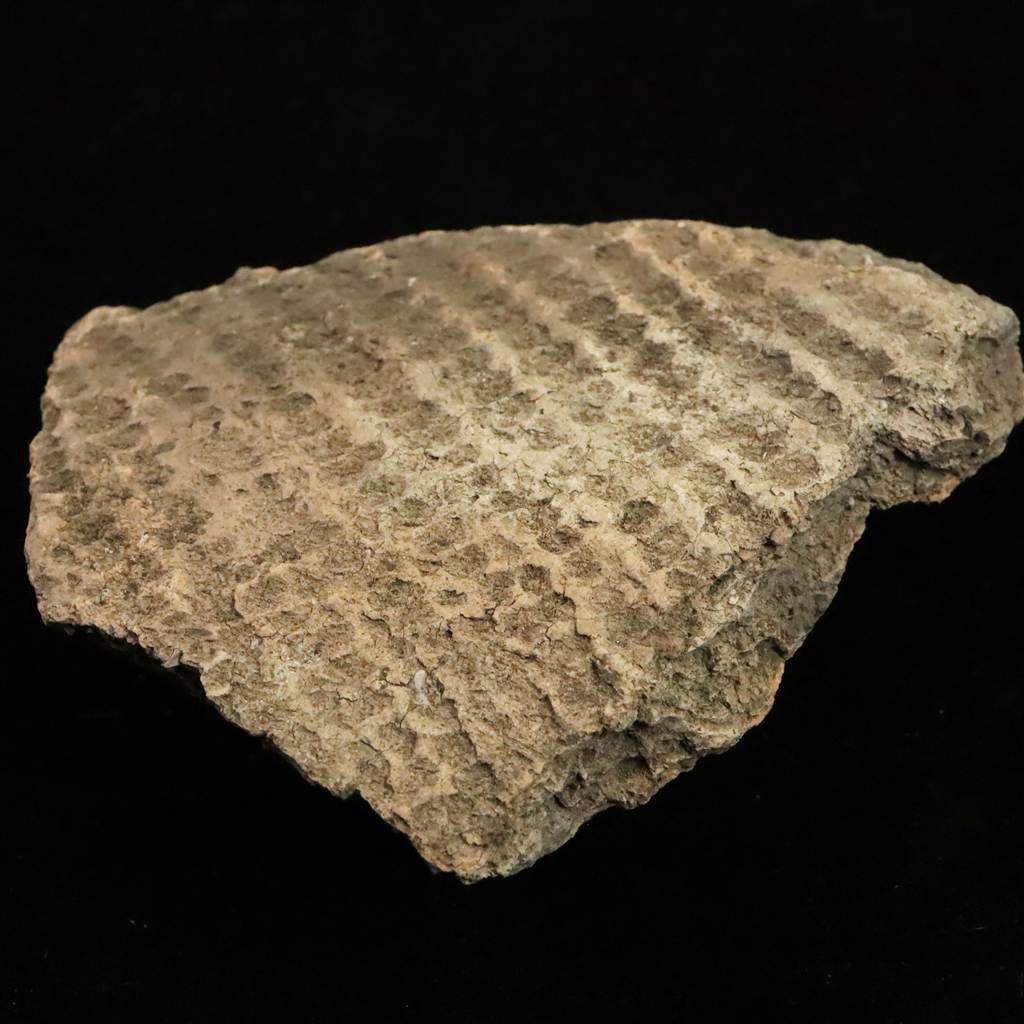 ◆ 本品は、東北・北海道地域にて出土したと伝わる縄文時代中期頃(紀元前4000年から紀元前3000年)に作られたと考えられる土器の一部です。本品の器面には細かな格子状の文様が全面に施されています。押し引きによる連続的な凹凸が残っており、当時の装飾技法をよく示す一片です。文様は規則的に並ぶ小さな窪みが網目状に広がり、光の当たり方によって凹凸が浮かび上がる質感が特徴です。断面には焼成時の土質や砂粒が見え、古い土器特有の素朴な風合いが感じられます。裏面の一部には、前コレクターが展示固定のために使用した接着材の跡が残っています。