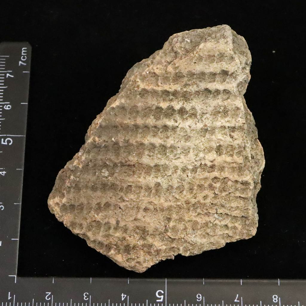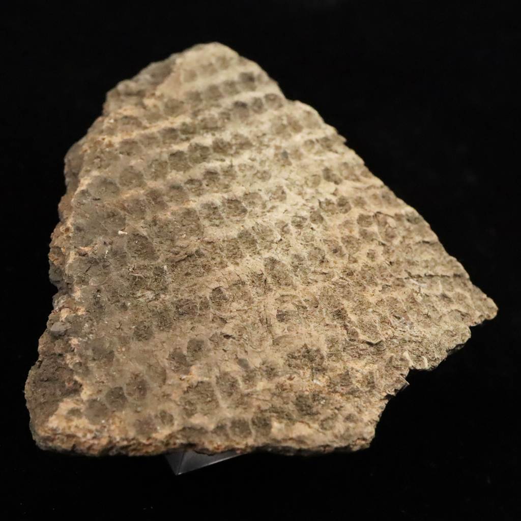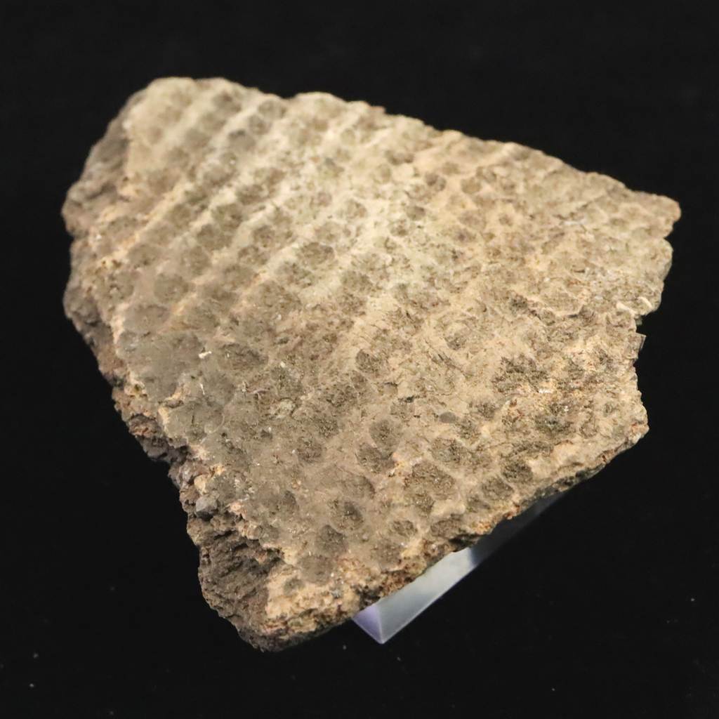 ◆ 本品は、東北・北海道地域にて出土したと伝わる縄文時代中期頃(紀元前4000年から紀元前3000年)に作られたと考えられる土器の一部です。本品の器面には細かな格子状の文様が全面に施されています。押し引きによる連続的な凹凸が残っており、当時の装飾技法をよく示す一片です。文様は規則的に並ぶ小さな窪みが網目状に広がり、光の当たり方によって凹凸が浮かび上がる質感が特徴です。断面には焼成時の土質や砂粒が見え、古い土器特有の素朴な風合いが感じられます。裏面の一部には、前コレクターが展示固定のために使用した接着材の跡が残っています。