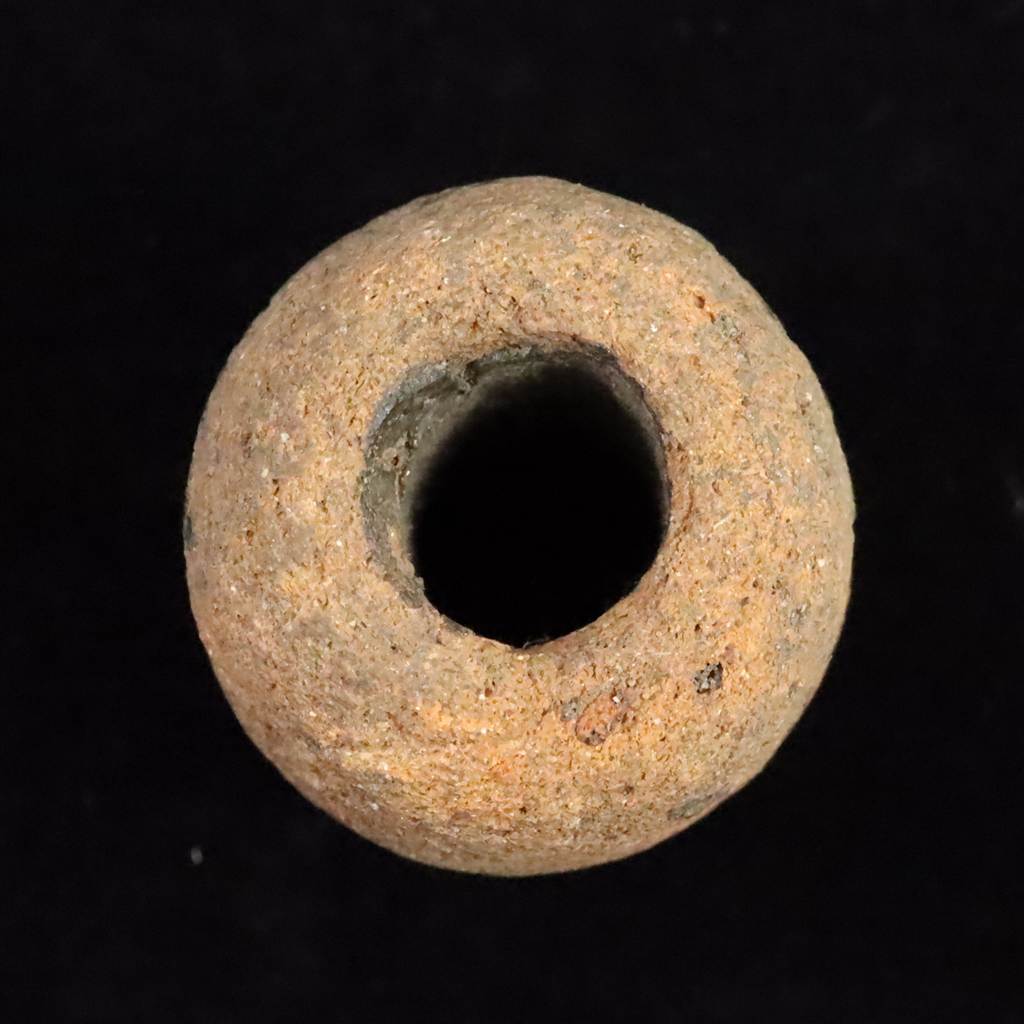 ◆ 本品は、縄文時代中期(おおむね紀元前4000年から紀元前3000年ごろ)の土製品で、漁具の一種である土錘(どすい)と考えられます。粘土に砂粒や植物片を混ぜて手で成形し、中央に太い貫通孔を開けて焼成されています。漁網の紐を通し、水中で網を沈めるための重りとして使われたとみられます。淡い黄土色の焼き肌とざらついた質感には、長い年月を経た古陶特有の風合いが残ります。丸みを帯びた樽状の形が美しく、縄文人の暮らしや自然との関わりを今に伝える資料的価値のある一点です。展示や鑑賞用として、縄文期の生活文化を身近に感じていただけます。