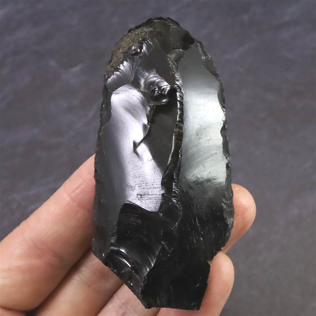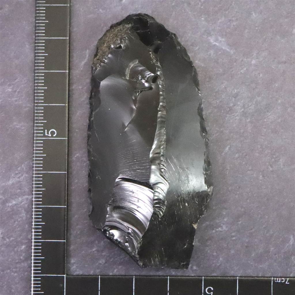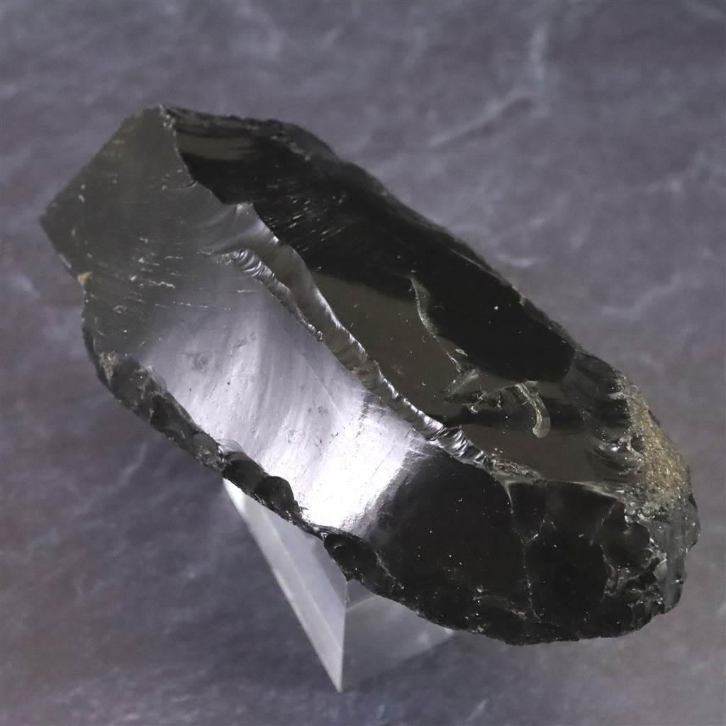 ◆ 本品は、東北・北海道地域にて出土したと伝わる後期旧石器時代(約3万8千~1万6千年前)に作られたと考えられる打製石器です。黒曜石は火山活動によって生成された天然ガラスで、割れた際に貝殻状の湾曲をともなう鋭利な断口が現れる性質があり、石刃づくりに適した素材として知られています。本品はその特性を利用し、原石から大きな剥片を剥離したうえで、縁部の一部に連続した打ち欠き痕が加えられています。片面には面積の大きい平滑面が残り、反対側には段差と放射状の痕跡が確認でき、剥離による破面の特徴がよく表れています。刃縁には湾曲した調整痕が残り、石を意図的に成形した痕跡を読み取ることができます。黒く透明感のある破面に、光の角度によって縞状の紋様が見られる点も特徴です。日本列島の後期旧石器時代には、黒曜石やチャートなど割れやすい石材を用いて多様な打製石器が作られました。細石刃、ナイフ形、槍先形、彫刻刀状など用途に合わせた形態が報告され、鋭い断口は切断や削りなどの作業に適した形状であることが知られています。本品は、剥離面と調整痕を観察しやすい黒曜石製の打製石器状標本です。