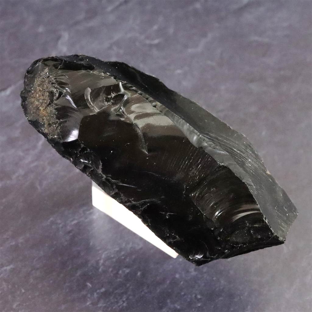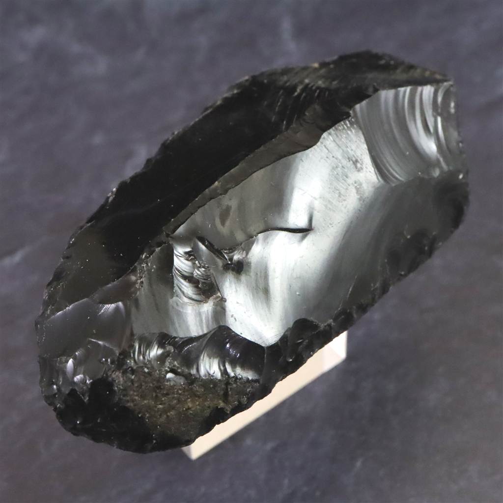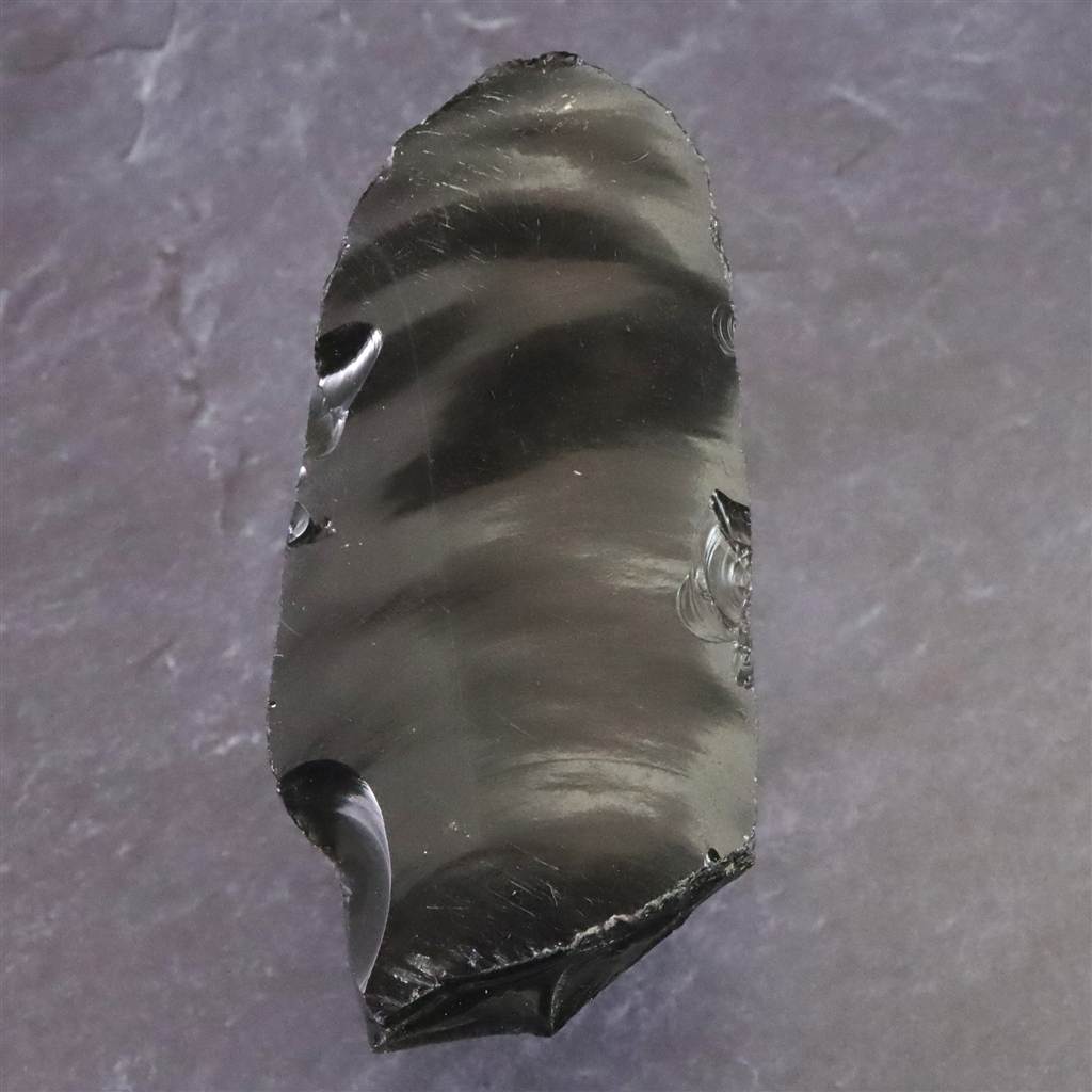 ◆ 本品は、東北・北海道地域にて出土したと伝わる後期旧石器時代(約3万8千~1万6千年前)に作られたと考えられる打製石器です。黒曜石は火山活動によって生成された天然ガラスで、割れた際に貝殻状の湾曲をともなう鋭利な断口が現れる性質があり、石刃づくりに適した素材として知られています。本品はその特性を利用し、原石から大きな剥片を剥離したうえで、縁部の一部に連続した打ち欠き痕が加えられています。片面には面積の大きい平滑面が残り、反対側には段差と放射状の痕跡が確認でき、剥離による破面の特徴がよく表れています。刃縁には湾曲した調整痕が残り、石を意図的に成形した痕跡を読み取ることができます。黒く透明感のある破面に、光の角度によって縞状の紋様が見られる点も特徴です。日本列島の後期旧石器時代には、黒曜石やチャートなど割れやすい石材を用いて多様な打製石器が作られました。細石刃、ナイフ形、槍先形、彫刻刀状など用途に合わせた形態が報告され、鋭い断口は切断や削りなどの作業に適した形状であることが知られています。本品は、剥離面と調整痕を観察しやすい黒曜石製の打製石器状標本です。