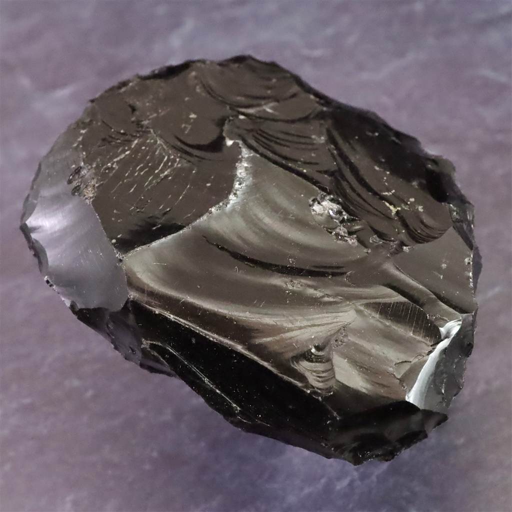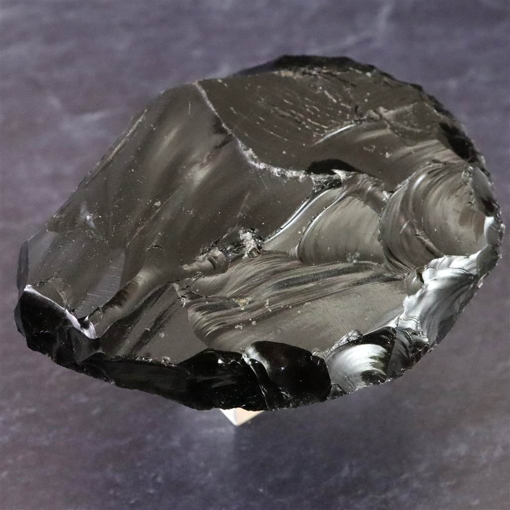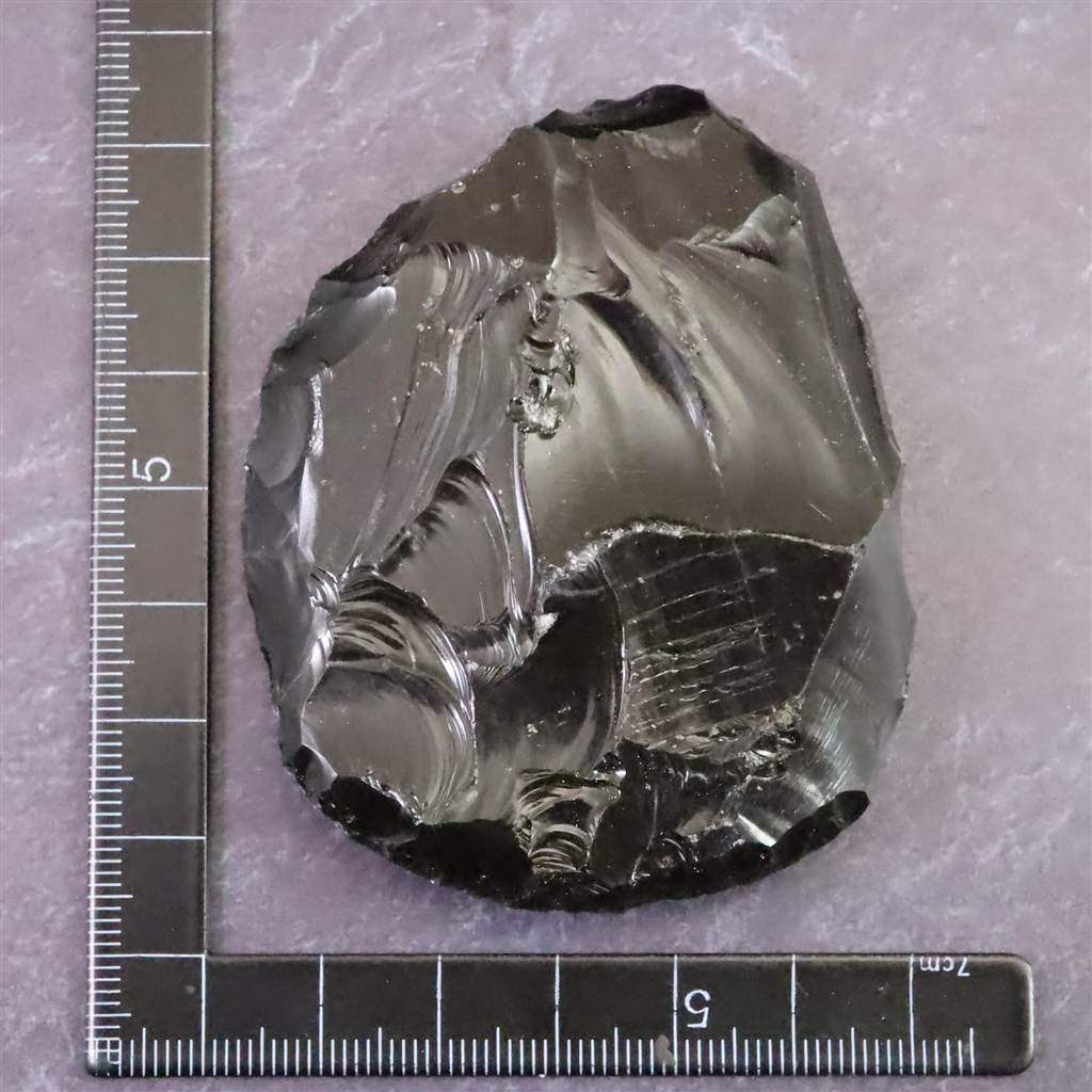 ◆ 本品は、東北・北海道地域にて出土したと伝わる後期旧石器時代(約3万8千~1万6千年前)に作られたと考えられる打製石器です。黒曜石は火山活動によって生成される天然ガラスで、割れる際に貝殻状の湾曲をともなう鋭い断口が現れる性質があり、古くから石刃や工具づくりに適した素材として知られています。本品は、その特性を利用して原石から石片を剥離し、縁部に連続した打ち欠き痕を加えることで、片手で持てる形状に調整された打製石器です。鏡面のように滑らかな剥離面と、衝撃で生じる半円状の痕が残る面との対比がはっきりしており、剥離方向や打点の位置が観察しやすい点が特徴です。片側には幅のある平坦面が形成されており、皮や木材のこすり・削りなど、道具としての使用が想定できる形状を備えています。日本の後期旧石器時代には、黒曜石を加工してスクレイパー状の石器が多数つくられ、生活用品の加工に用いられたことが知られています。加工痕の読み取り資料や、石器製作の理解を深める標本として適した一品です。