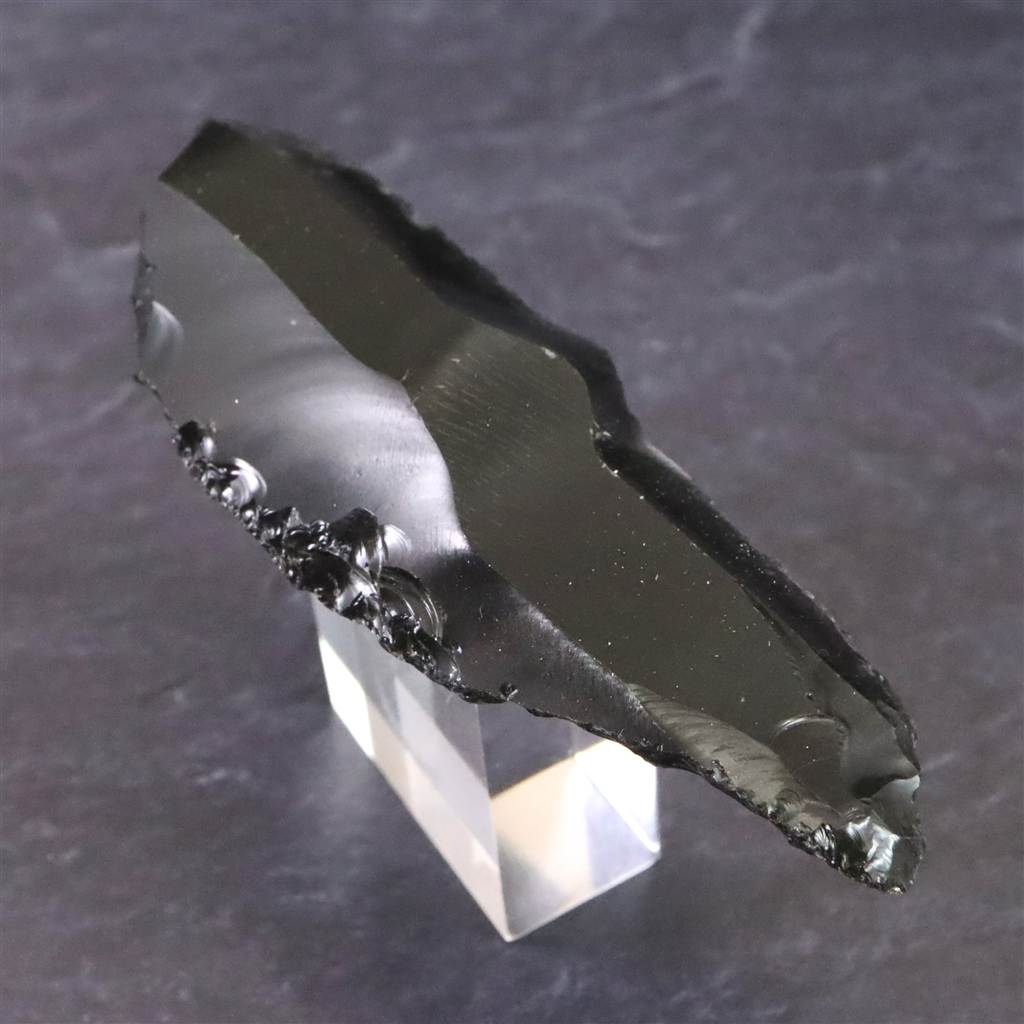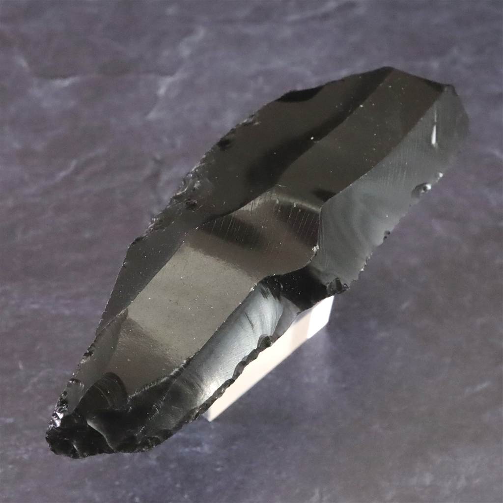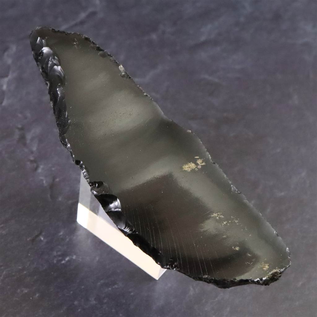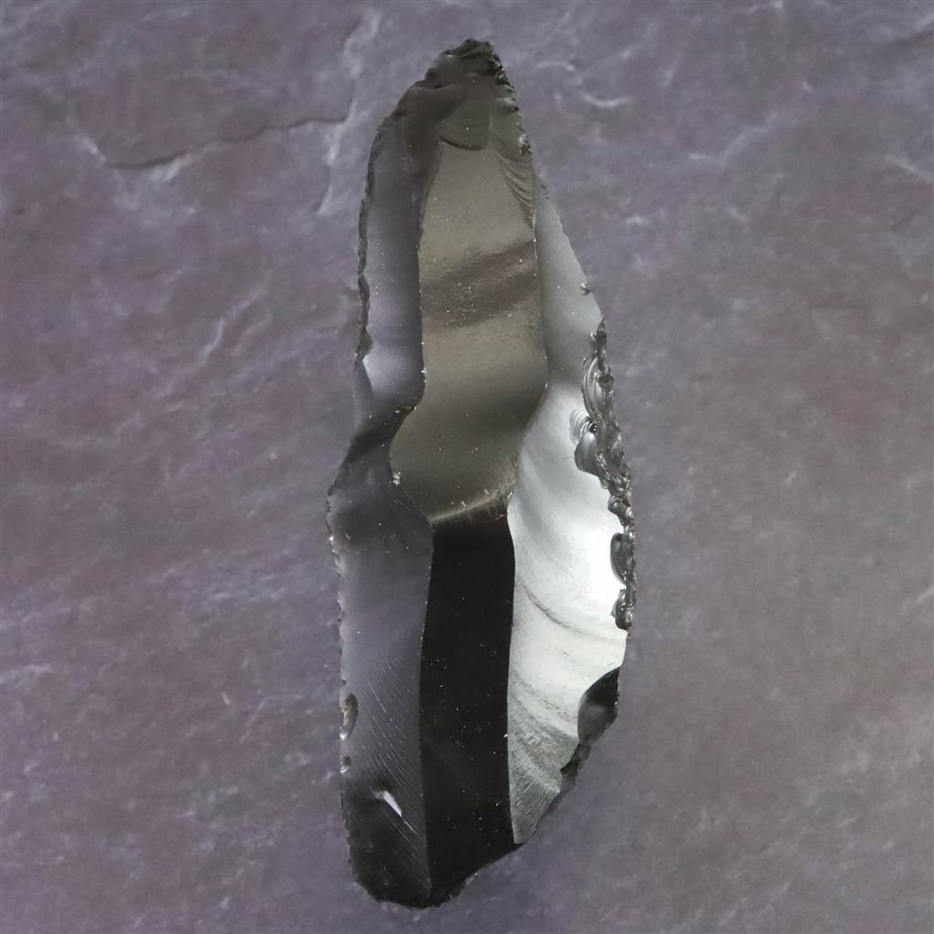 ◆ 本品は、東北・北海道地域にて出土したと伝わる後期旧石器時代(約3万8千~1万6千年前)に作られたと考えられる打製石器です。黒曜石は火山活動によって生成された天然ガラスで、割れた際に貝殻状の湾曲をともなう鋭利な断口が現れる性質があり、古くから石刃づくりに適した素材として知られています。本品はその性質を利用し、原石から薄い石片を剥離し、縁部に連続した打ち欠き痕を加えて細長い刃物状に成形されています。片面は大きな剥離による平滑面が残り、反対側には細かな凹凸と段差が連続し、剥離と調整の工程を確認できます。先端付近には衝撃点と放射状の痕跡が見られ、石片を剥がした際の特徴的な破面が残っています。刃縁には湾曲しながら微細な調整痕が続き、意図的な成形が行われた痕跡がはっきりしています。日本列島の後期旧石器時代には、黒曜石やチャートなど割れやすい石材を用いて多様な打製石器が作られました。細石刃、槍先形、ナイフ形、彫刻刀状など用途に応じた形態が報告され、鋭い刃は切断や削りなどの作業に適した形状であることも知られています。本品は、破面構造と加工痕を観察できる黒曜石製の打製石器状標本です。