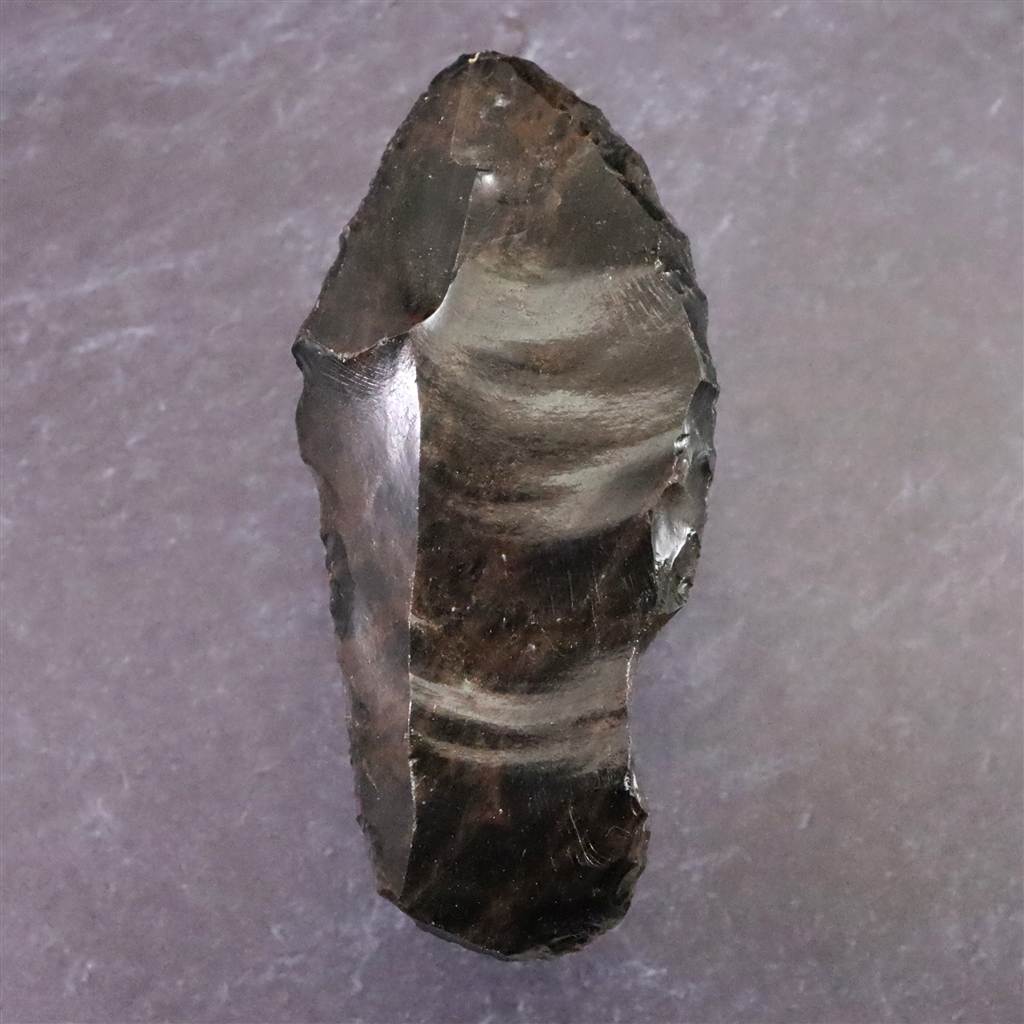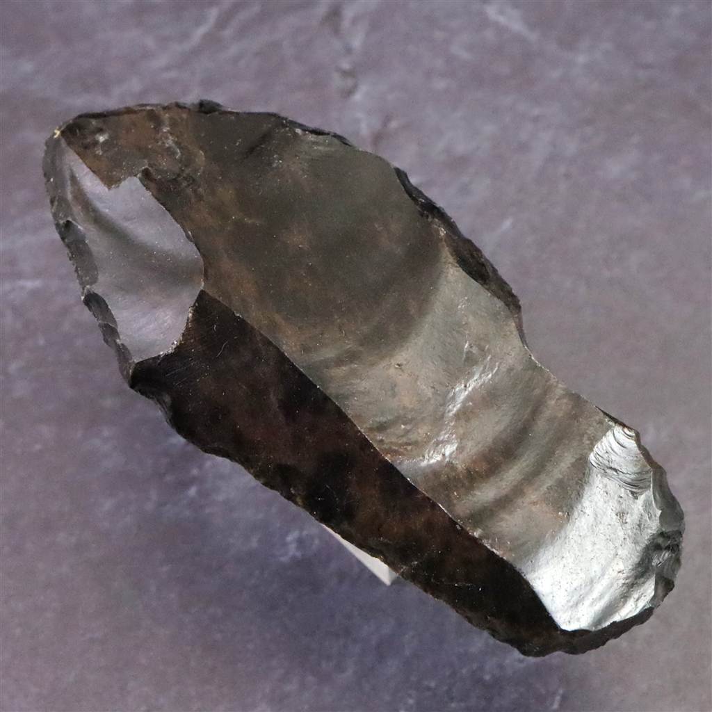 ◆ 本品は、東北・北海道地域にて出土したと伝わる後期旧石器時代(約3万8千~1万6千年前)に作られたと考えられる打製石器です。火山活動によって生じる黒曜石は、天然ガラス特有の貝殻状の割れ方を示し、鋭い断口を得やすいことから、旧石器時代より石刃製作に適した素材として利用されてきました。本品は、原石から薄い剥片を意図的にはぎ取り、縁部に連続した打ち欠き痕を施して細長い刃状へと整えられたものです。鏡面のように平滑な面と、段差や凹凸が残る打ち欠き面の対比がはっきりしており、剥離の際に生じた湾曲した波紋状の痕跡も確認できます。側縁部には小刻みな調整痕が連続しており、刃部を整形した際の加工工程を観察しやすい点が特徴です。このような石刃は、後期旧石器時代の日本列島各地で確認されており、切断・削りなど実用的な用途に適した形状とされています。黒曜石の石器製作技法を理解するうえで、観察価値の高い一点です。