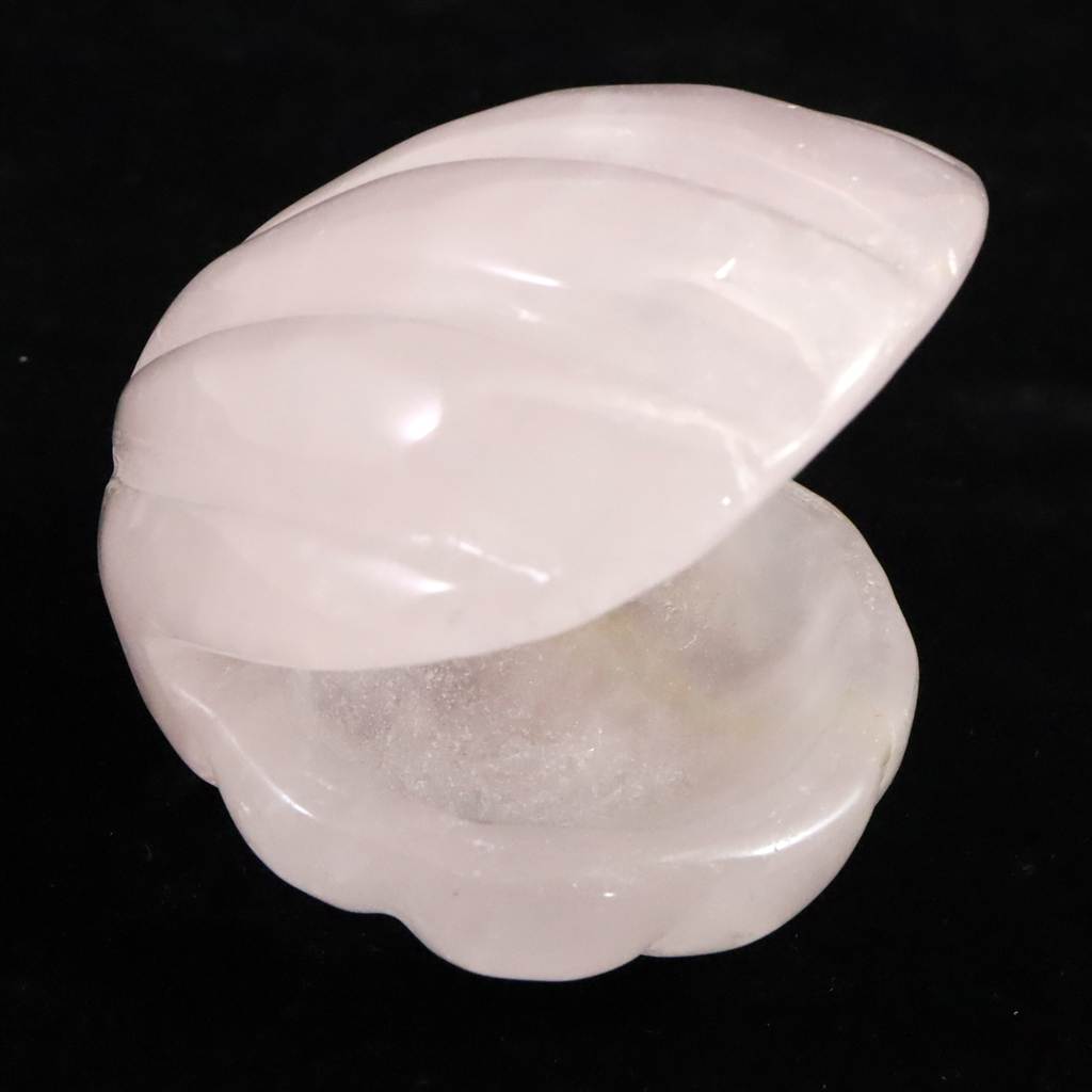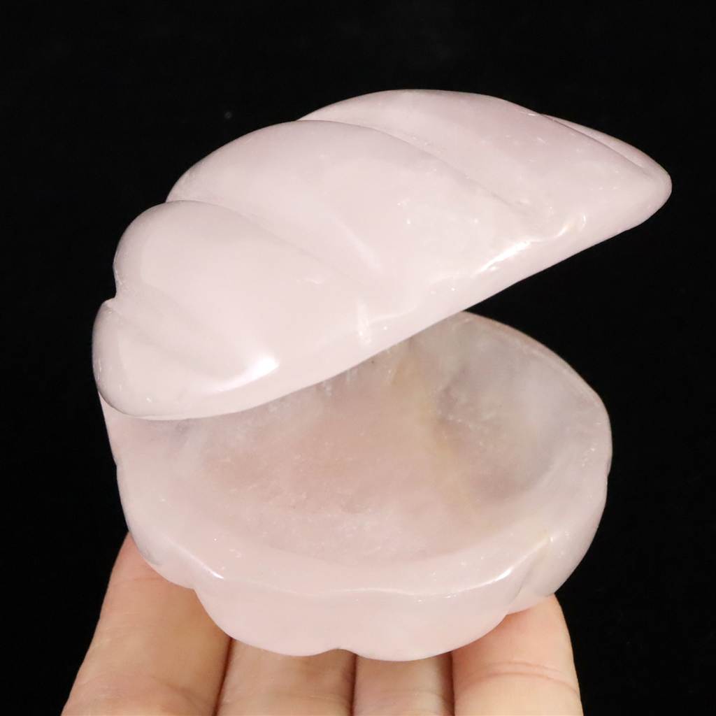 ◆ ローズクォーツ(紅水晶)を素材にした貝殻モチーフの彫刻置物です。淡い桜色の透明感が美しく、光の加減によって柔らかな艶を帯びます。滑らかな曲線と光沢を活かした彫刻は、ジュエリーボックスや小物入れとしても楽しめるデザインです。古来より愛と調和を象徴する石として親しまれ、穏やかな気持ちをもたらすといわれています。