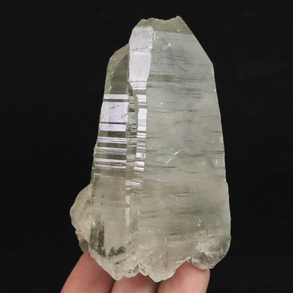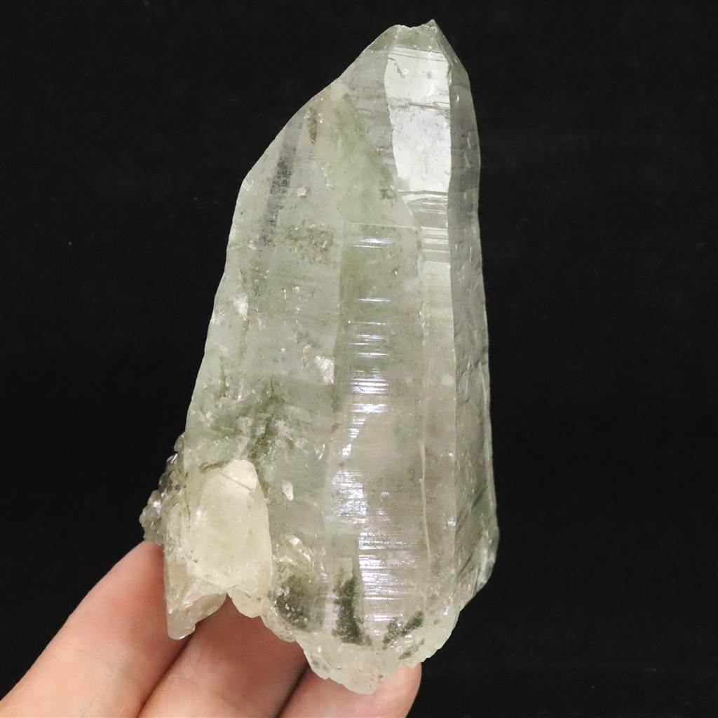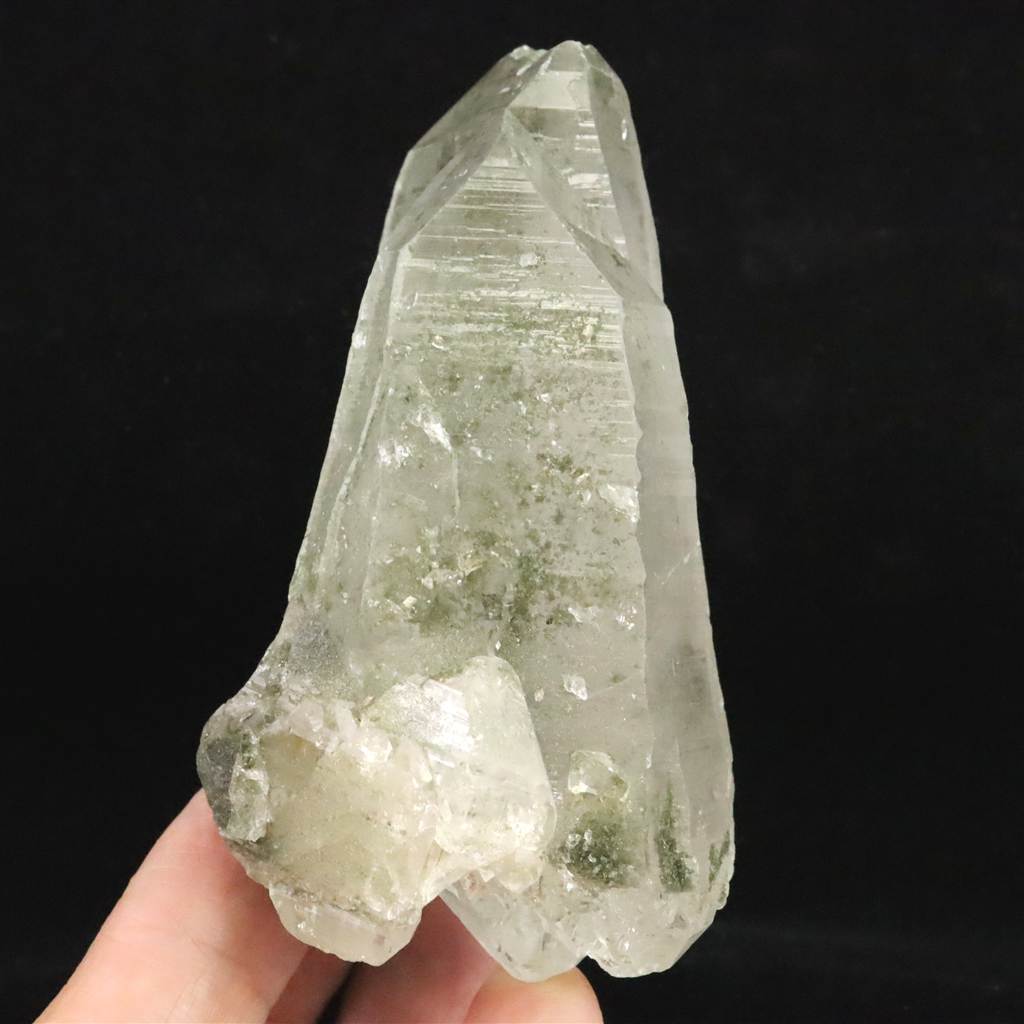 ◆ 本商品写真は現物のものです。写真の商品をお届けします。ガネーシュヒマールらしいクローライト入りの水晶です。根元がダイナミックにセルフヒールドされており、一部両剣になっています。ライト等で照らすと、内部の白い雲のようなインクルージョンも魅力的です。透明なところからルーペで覗くと、気泡が沢山入っており、水入りかもしれません。トップの欠けたところもセルフヒールドされており、クローライトが付着しています。沢山の特徴が魅力的な石です。