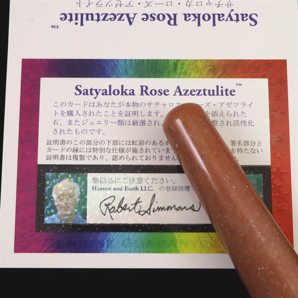 ◆ロバート・シモンズ氏より....サチャロカ・ローズ・アゼツライトは南インドで採掘される濃厚なサーモンピンク色の高波動の石です。ハートチャクラをパワフルに活性化し、ハートのエネルギーを脳に引き上げ、目覚めさせます。とても平和的で愛に満ちた波動でありながら、非常にパワフルで強力なエネルギーを備えています。意識の革命的変容を促し、メンタルの知性を鳩の英知へと開かせます。内なる真実との繋がりを高め、リキッドクリスタルボディをとても素晴らしい神聖な愛で満たします。