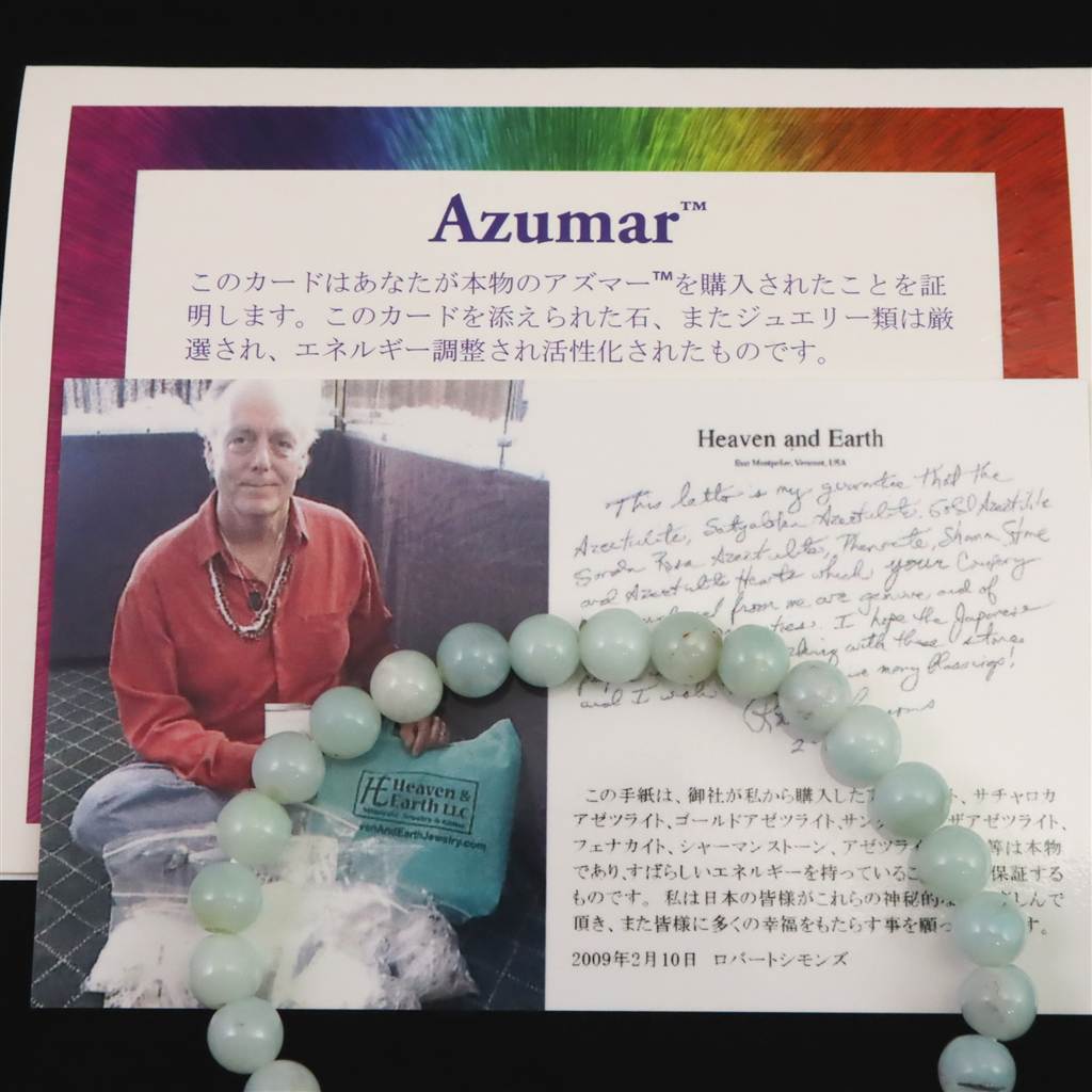 ◆ ロバート・シモンズ著書より...アズマーは新しく発見されたジェムストーンであり、ほぼ等しい割合のカオリナイトとクォーツ、そしてその他の微量元素が混じりあっています。コマドリの卵のような鮮やかなブルーのベースの部分のなかにスティブナイトが見られるものもあります。これらはごく最近、アリゾナ州で発見されました。アズマーという名称は、アズール(青)とマーレ(海)に由来しています。熱帯の海の鮮やかなターコイズプルーの色合いを思わせる美しい色合いの石で、水のエレメントと強く共鴫します。アズマーのエネルギーはすべての細胞をリフレッシュし、活性化し、再生させるようです。アズマールは素晴らしいヒーリングの石で、感情体に光をもたらし、安らかで歓びに満ちた力強い波動によってネガティブなしこりのようなものを難なく解放するでしょう。怒りや憎しみ、恐れやストレスを、神聖さや、喜び、そして確信と愛へと変容するのです。