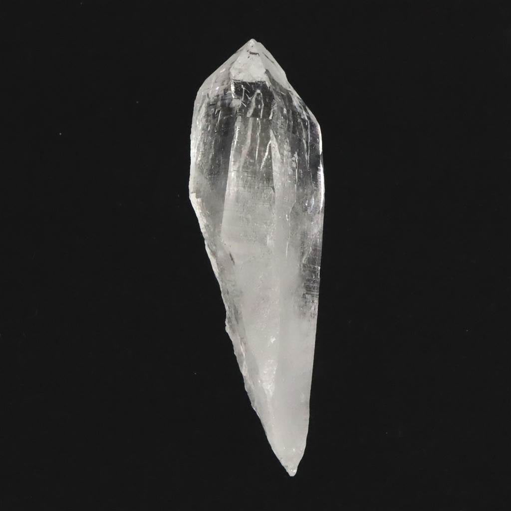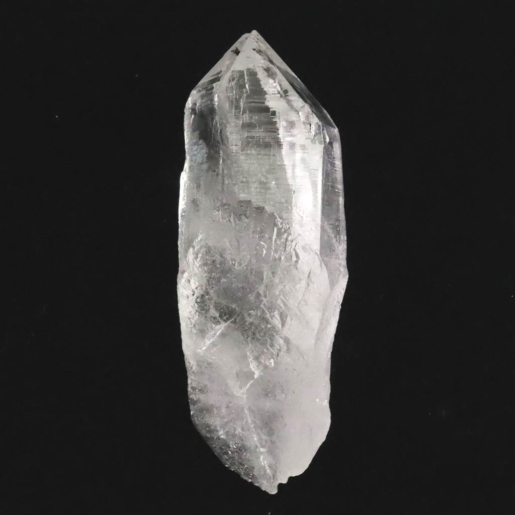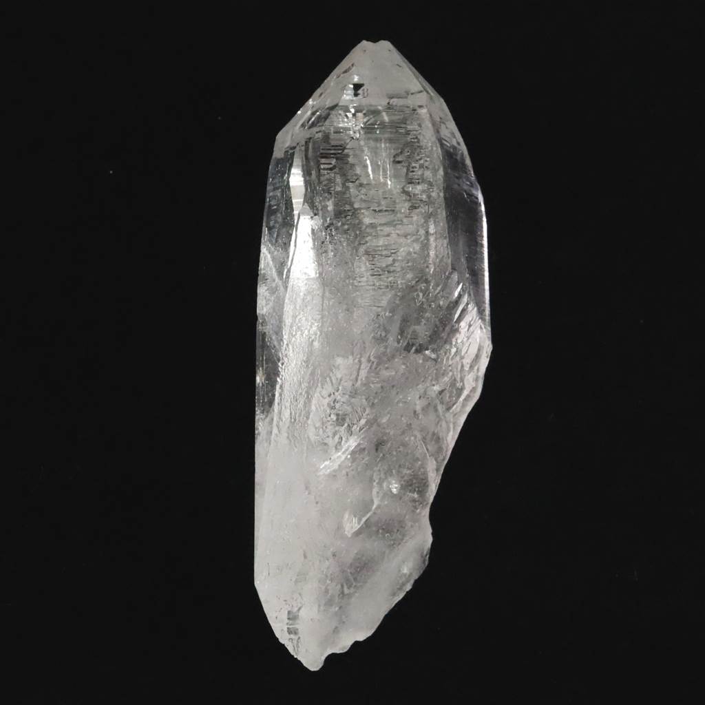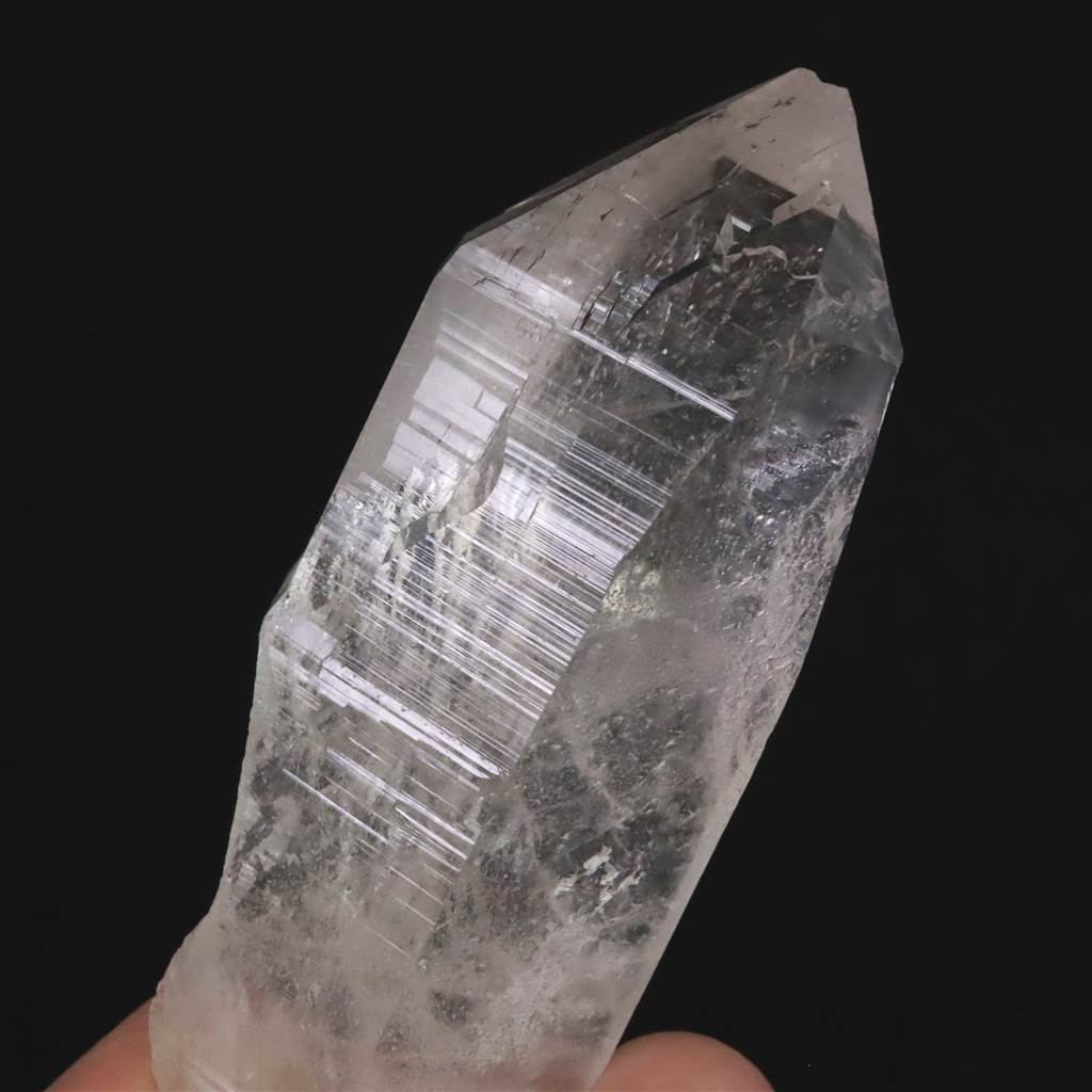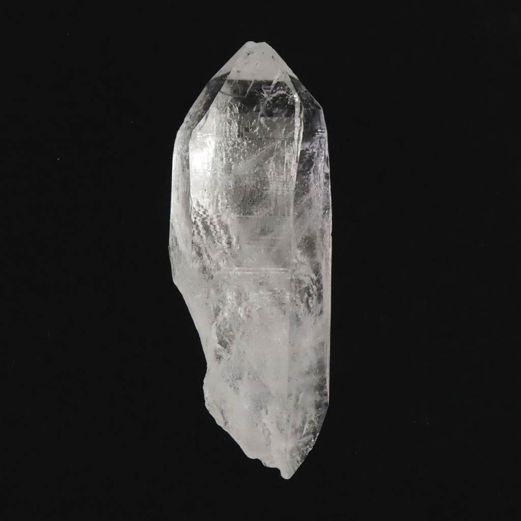 ◆ 内部に白い帯のようなインクルージョンが幾重にも入り(セレスティアル・ローブ)、銀河のようで美しいです。その中に気泡が見られます。(水入り)トップにも柱面にも沢山のエッチングが刻まれています。トップには、重なりあうレコードが見られます。