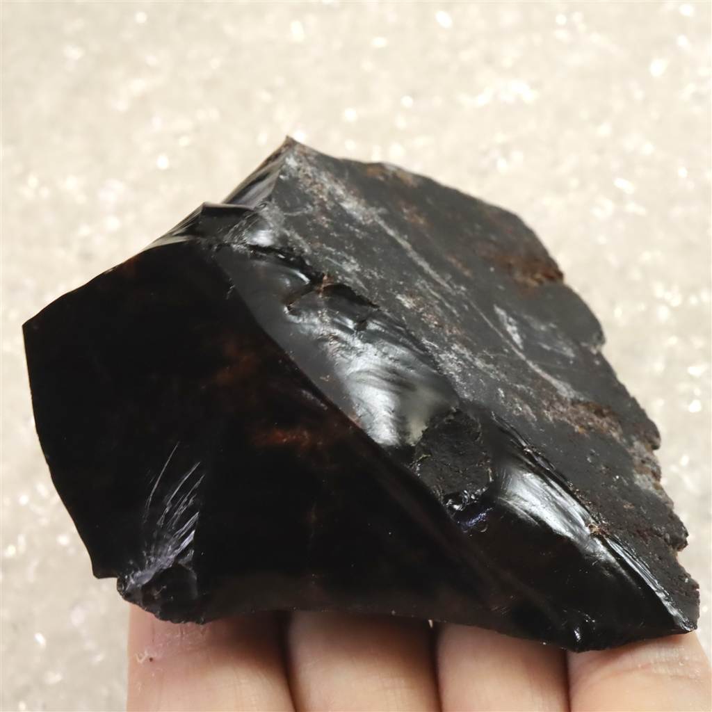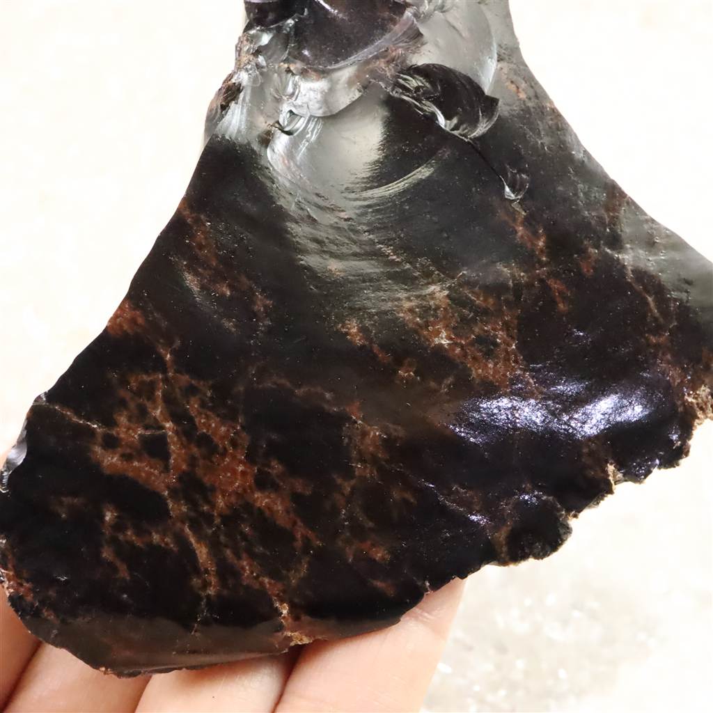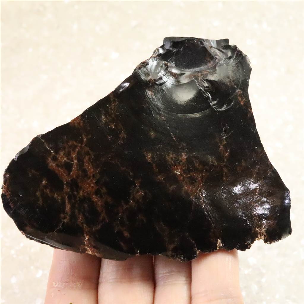 ◆ 北海道紋別郡遠軽町・赤石山(白滝地域)産の黒曜石は、約220万年前の火山活動に由来する天然ガラスです。二酸化ケイ素に富む流紋岩質マグマが急冷したため結晶化せず、鏡面の光沢と貝殻状の鋭い割れ口を示します。黒色を基調に、鉄成分の酸化により赤〜褐色を帯びる個体があり、地元では「花十勝」とも呼ばれます。赤石山山麓の白滝遺跡群からは黒曜石製石器が多数出土しており、先史時代の道具素材として重要であったことを物語ります。割れ口でケガをしないようにご注意を願います。