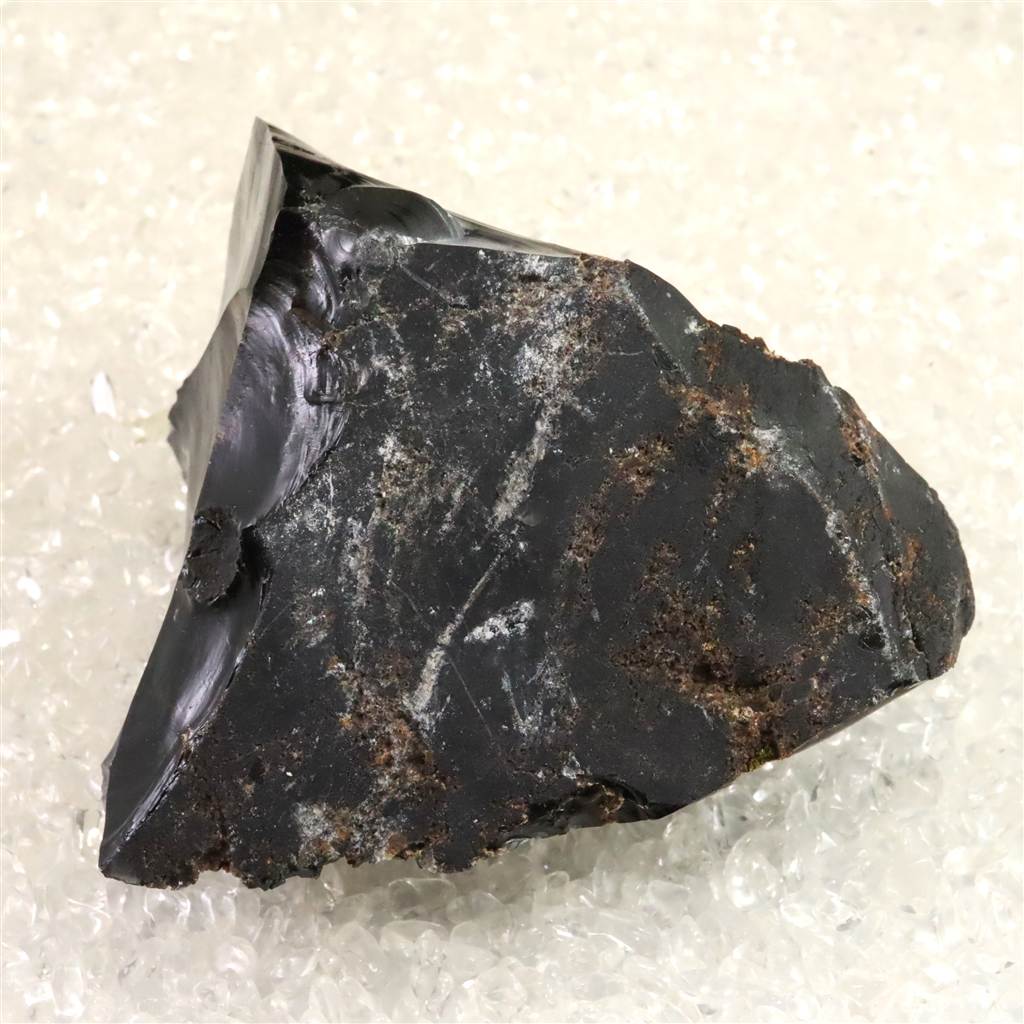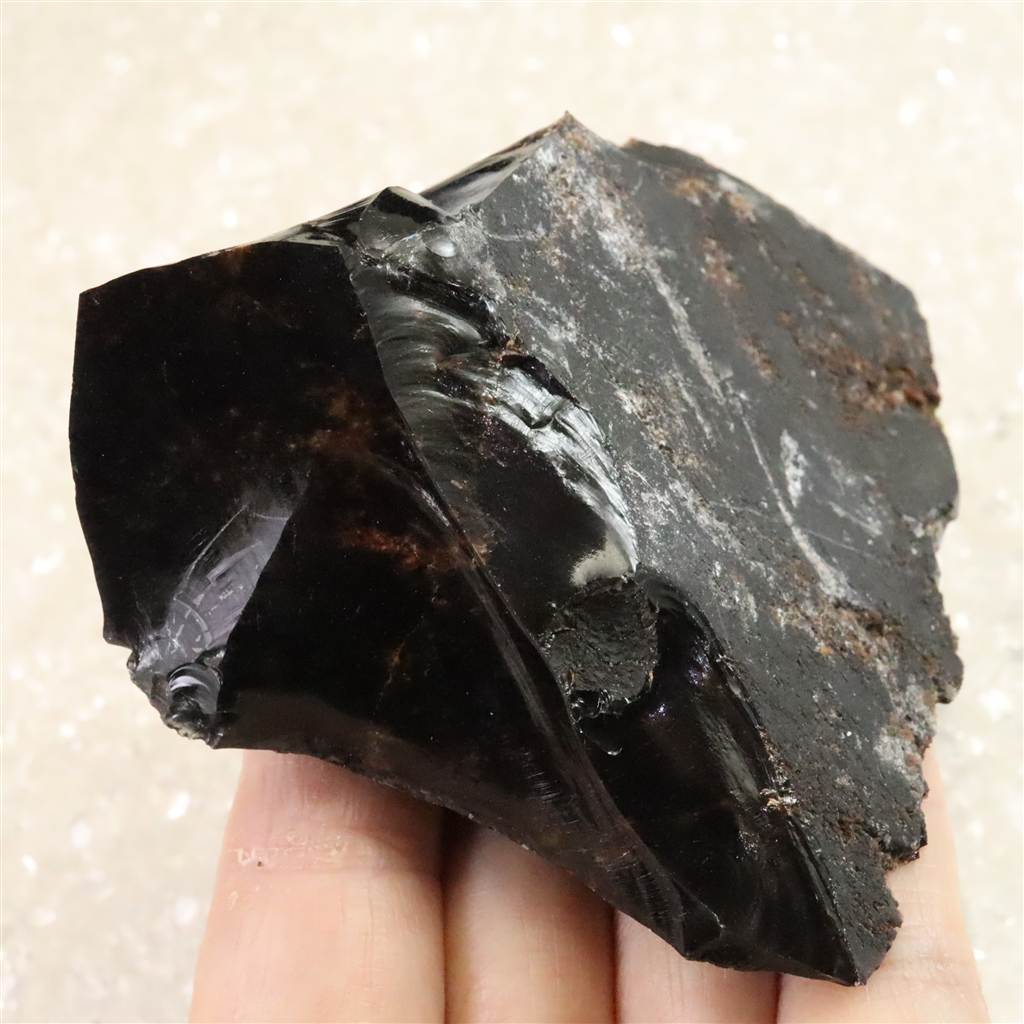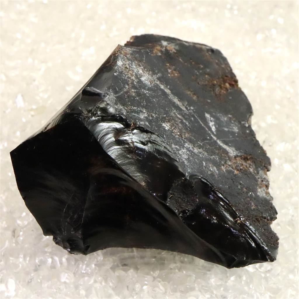 ◆ 北海道紋別郡遠軽町・赤石山(白滝地域)産の黒曜石は、約220万年前の火山活動に由来する天然ガラスです。二酸化ケイ素に富む流紋岩質マグマが急冷したため結晶化せず、鏡面の光沢と貝殻状の鋭い割れ口を示します。黒色を基調に、鉄成分の酸化により赤〜褐色を帯びる個体があり、地元では「花十勝」とも呼ばれます。赤石山山麓の白滝遺跡群からは黒曜石製石器が多数出土しており、先史時代の道具素材として重要であったことを物語ります。割れ口でケガをしないようにご注意を願います。