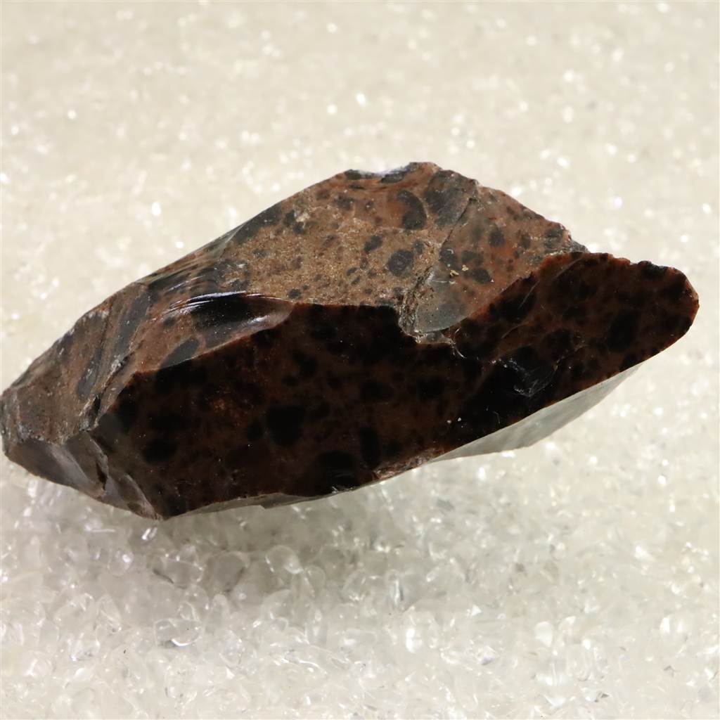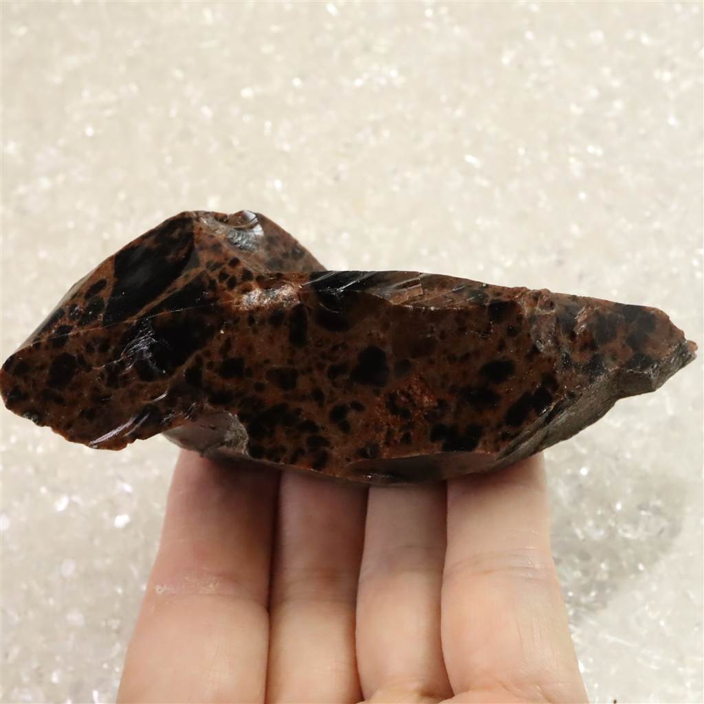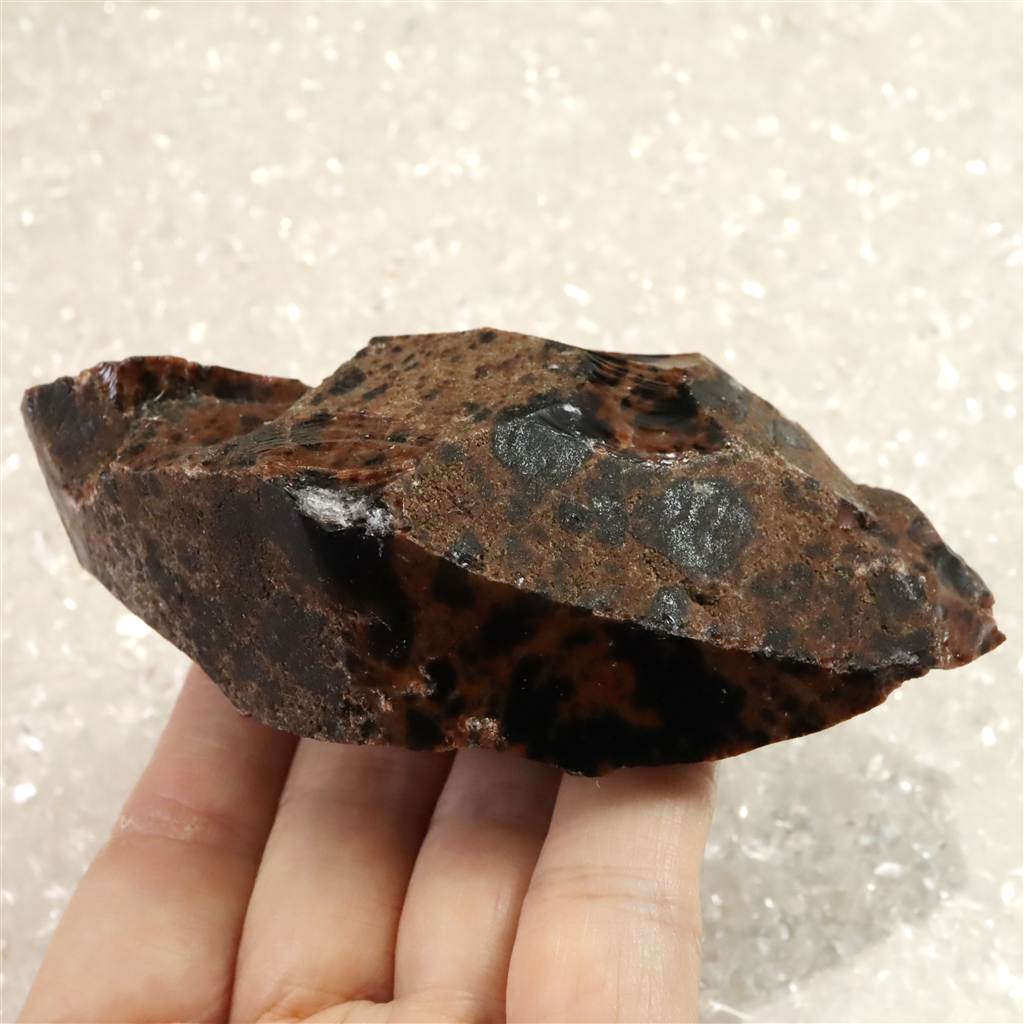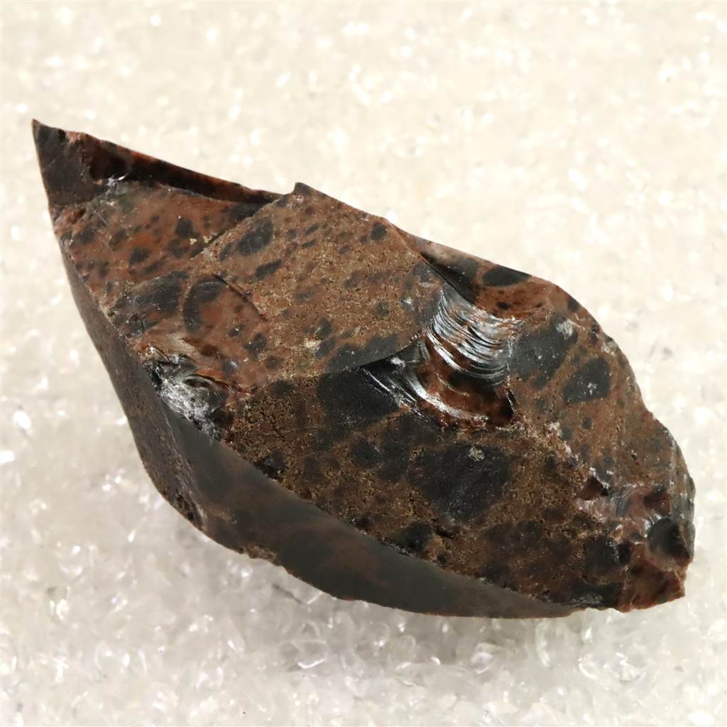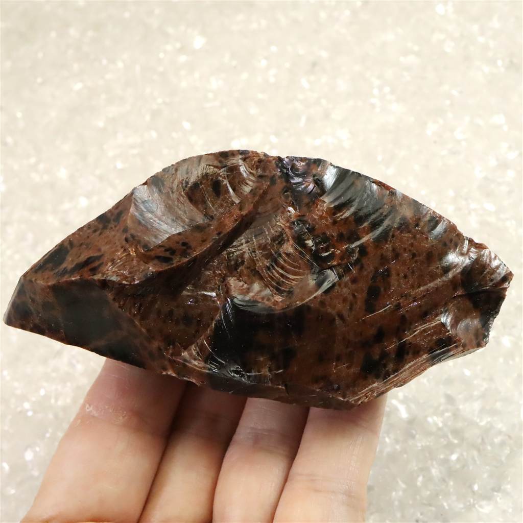 ◆ 北海道紋別郡遠軽町・赤石山(白滝地域)産の黒曜石は、約220万年前の火山活動に由来する天然ガラスです。二酸化ケイ素に富む流紋岩質マグマが急冷したため結晶化せず、鏡面の光沢と貝殻状の鋭い割れ口を示します。黒色を基調に、鉄成分の酸化により赤〜褐色を帯びる個体があり、地元では「花十勝」とも呼ばれます。赤石山山麓の白滝遺跡群からは黒曜石製石器が多数出土しており、先史時代の道具素材として重要であったことを物語ります。割れ口でケガをしないようにご注意を願います。