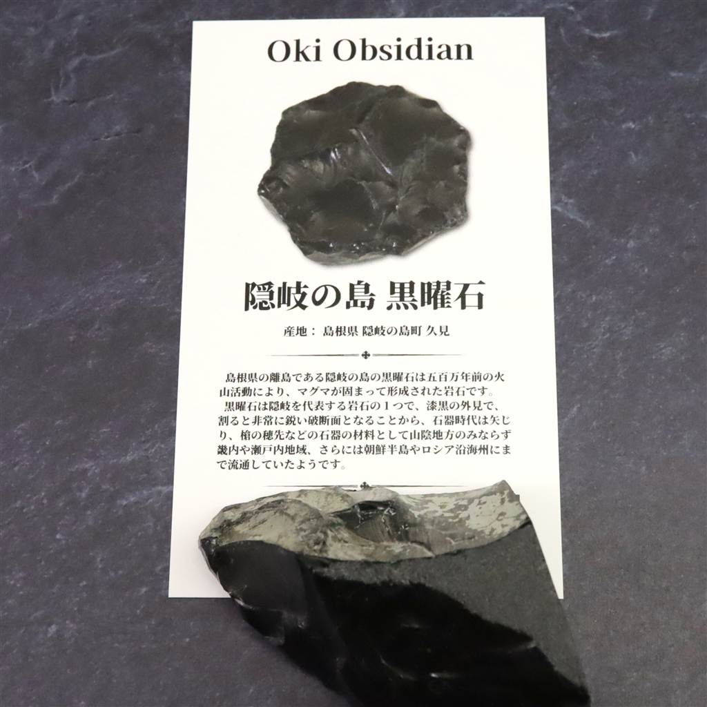 ◆ 今では採掘が出来ない希少な隠岐の島産黒曜石の原石です。 島根県の離島「隠岐」は、中国地方で唯一の黒曜石原産地。 隠岐の地質と環境が、この大変良質の黒曜石を生み出しました。 黒曜石とは500万年前の火山活動により流紋岩質のマグマが急冷してできた天然のガラスで、この隠岐産の黒曜石は中国四国地方や新潟県の遺跡からも出土しています。 隠岐の黒曜石が「良質」で古代の生活には 欠かせない石であったことが想像されます。