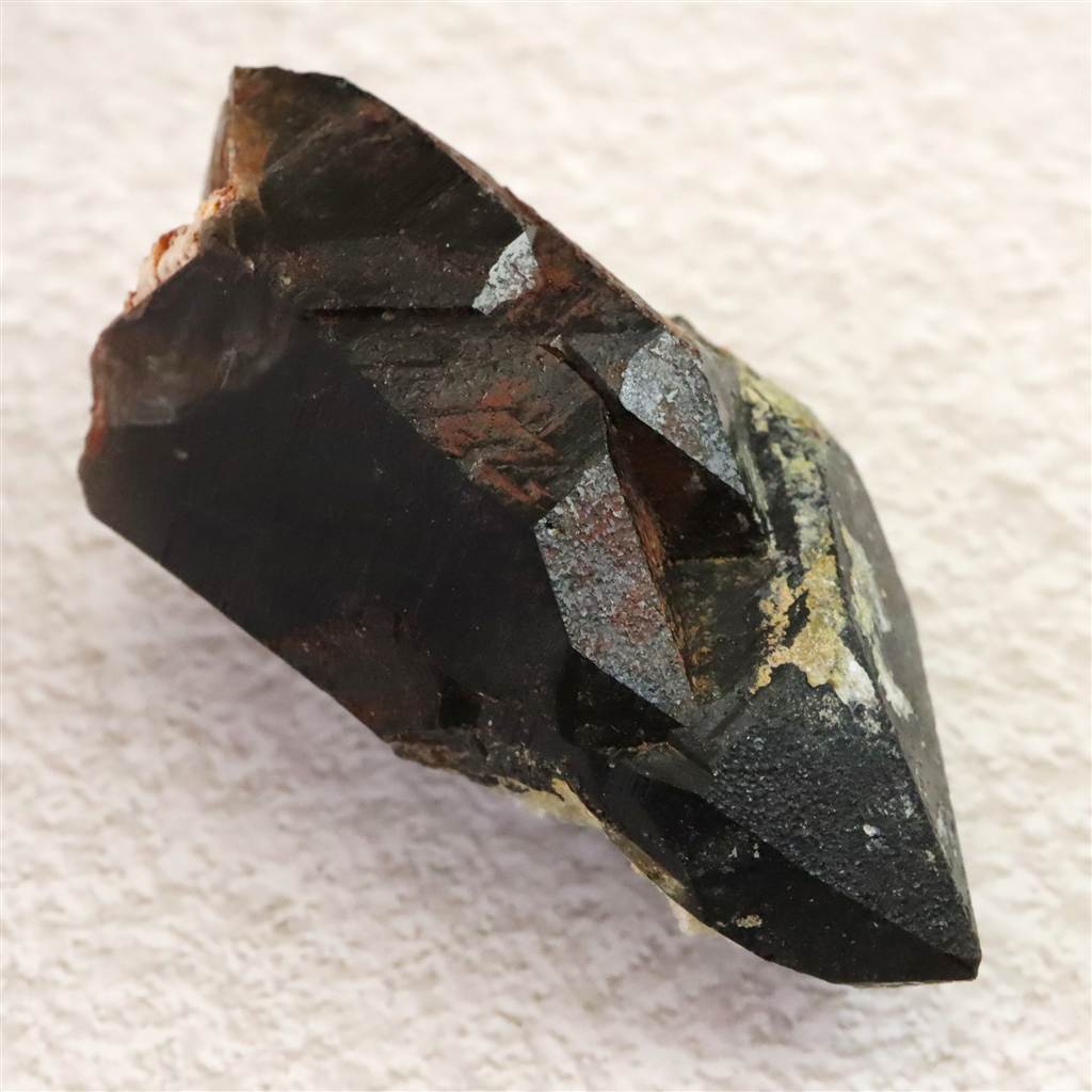 ◆ 岐阜県中津川市蛭川地区で産出される黒水晶(モリオン)は、日本国内でも特に知られる産地のひとつです。モリオンは石英グループに属し、透明な水晶に比べて深い黒色を呈するのが特徴です。この黒色は結晶中に取り込まれた微量元素や放射線の影響によるもので、光をほとんど通さない漆黒の外観を持ちます。蛭川の黒水晶は、結晶が比較的しっかりと発達し、稀に大きな結晶や美しい結晶面を備えるものも確認されています。産出量は限られており、国産モリオンの代表格として鉱物学的にも価値が高い存在です。