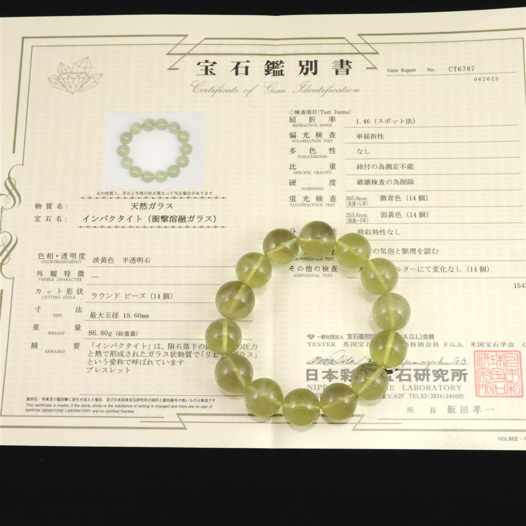 リビアングラス(AAA) 17mm玉 ブレスレット 鑑別書付 86.8g (ID:15431)