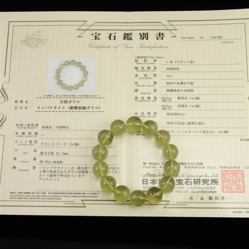 ◆ 透明度の高い高品質(AAA)の16mm玉リビアングラスです。日本彩珠宝石研究所の鑑別書付きです。