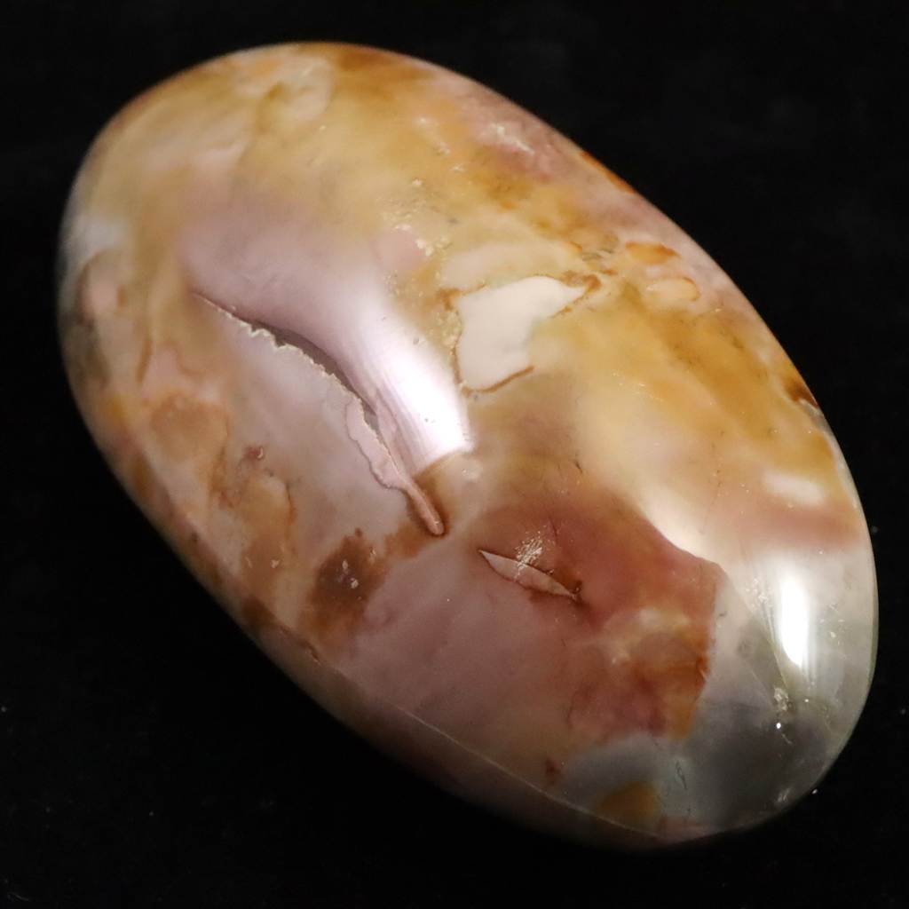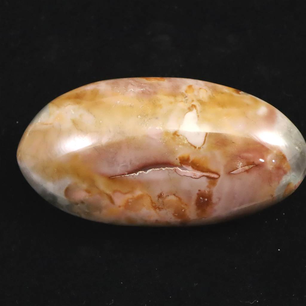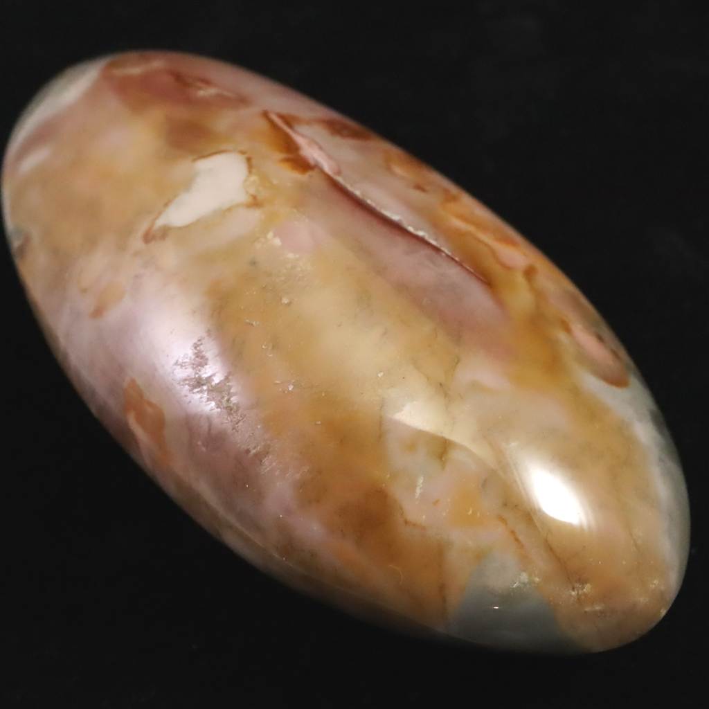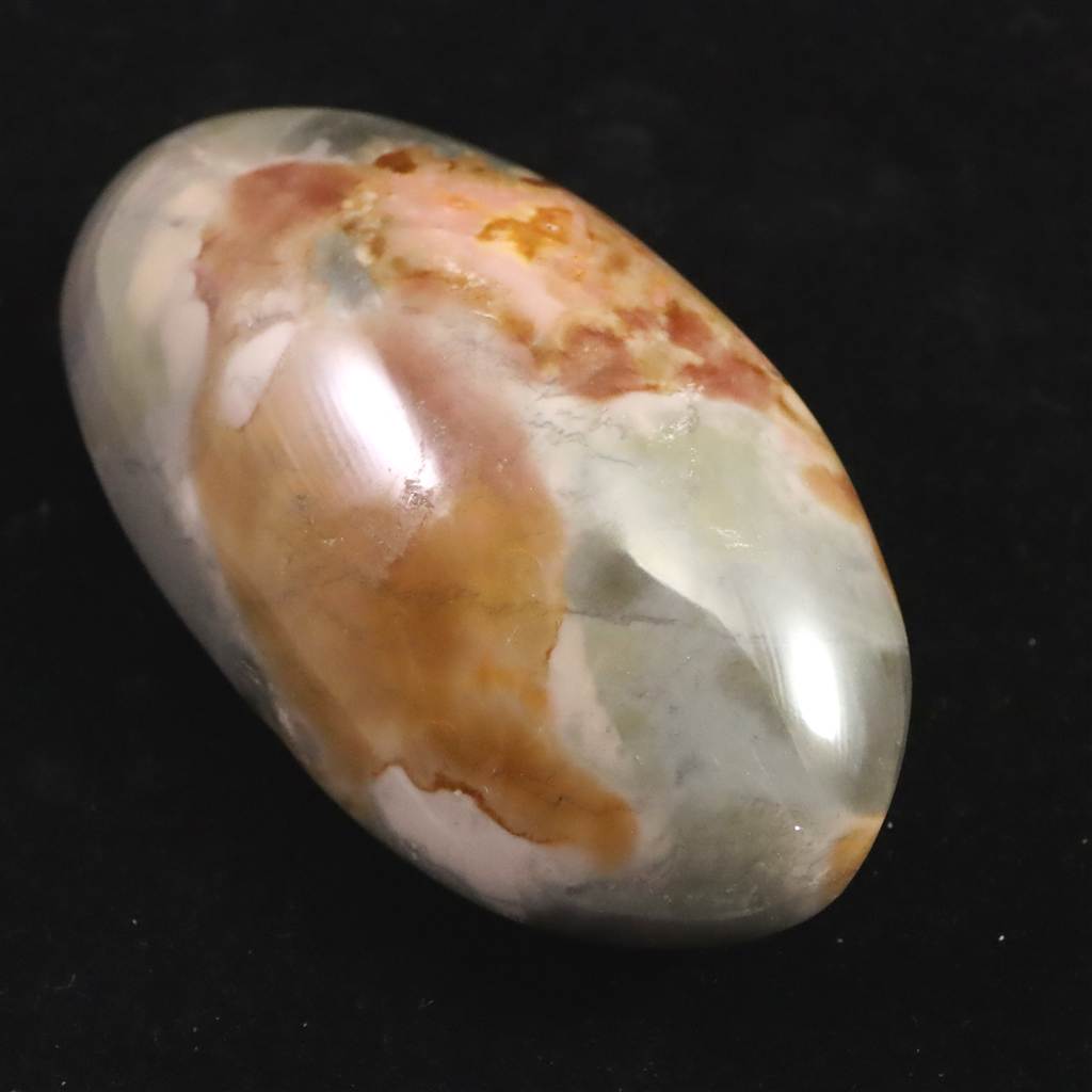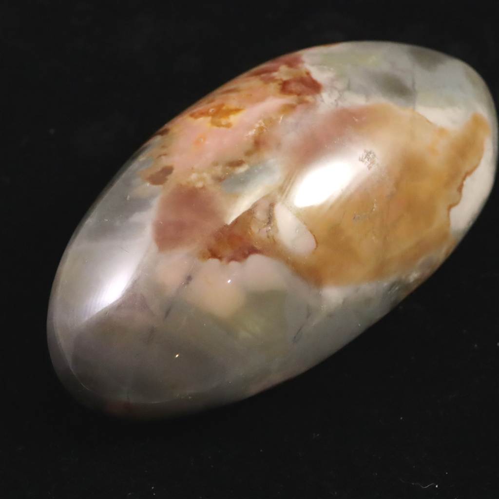 ◆ ムーアカイト(ムーカイト、モッカイト、モーカイトとも呼ばれています)は、珪化した堆積岩の一種で、微細な石英やオパール質シリカに鉄分や粘土鉱物が混ざり合って構成されています。赤や黄色、茶、白など多彩な色彩と模様が特徴で、モース硬度は6〜7と比較的硬く、美しく研磨される石です。力強い色合いから装飾や護符としても親しまれ、変化に順応し前向きに歩む象徴として大切にされてきました。