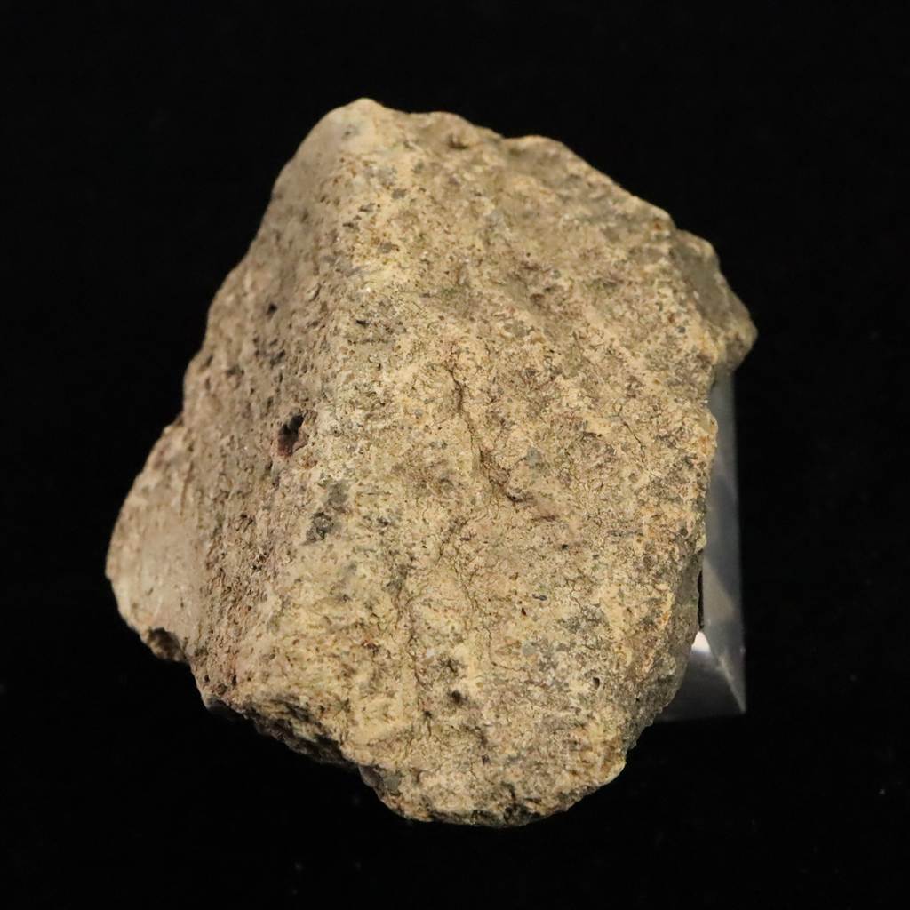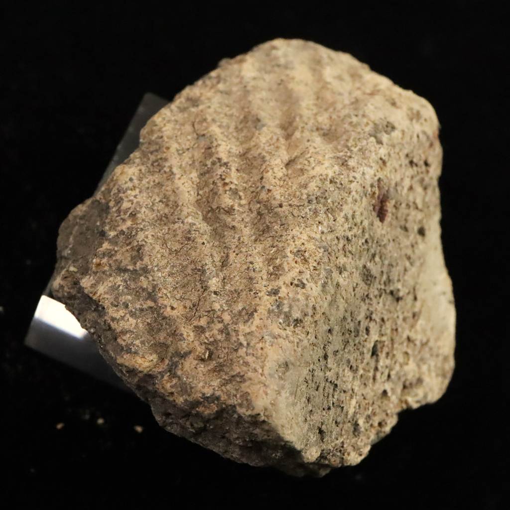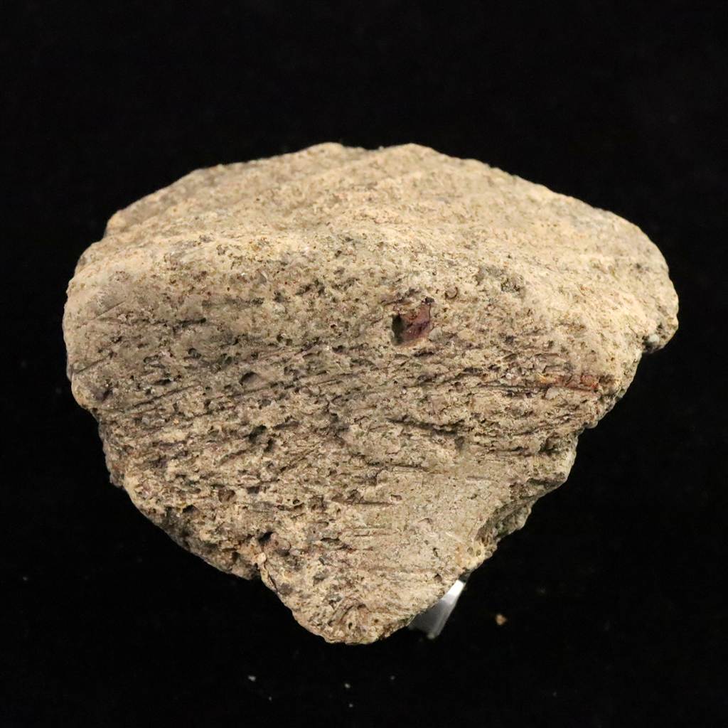 ◆ 本品は、東北・北海道地域にて出土したと伝わる縄文時代中期頃(紀元前4000年から紀元前3000年)に作られたと考えられる土器の一部です。縄文時代の土器の底部にあたる破片です。外側には指を滑らせたような細かな条線が残り、器成形の際についた手の動きがそのまま見て取れます。土質は砂粒を多く含む素地で、縄文土器らしいざらつきのある肌合いが特徴です。裏面には、以前の所有者が展示固定のために用いた接着剤の痕跡が一部残っています。実際に使用されていた器の一部であり、当時の生活や製作技法を身近に感じられる資料的価値の高い一点です。
