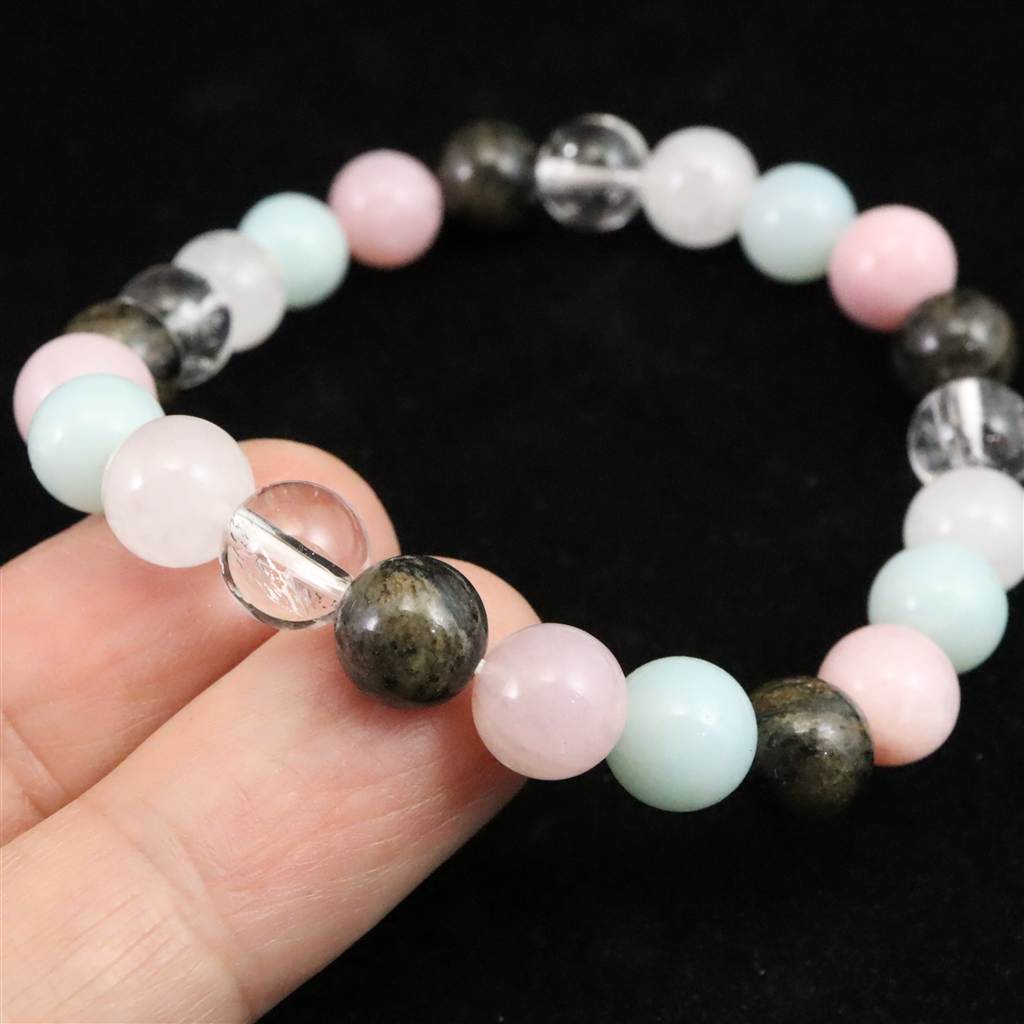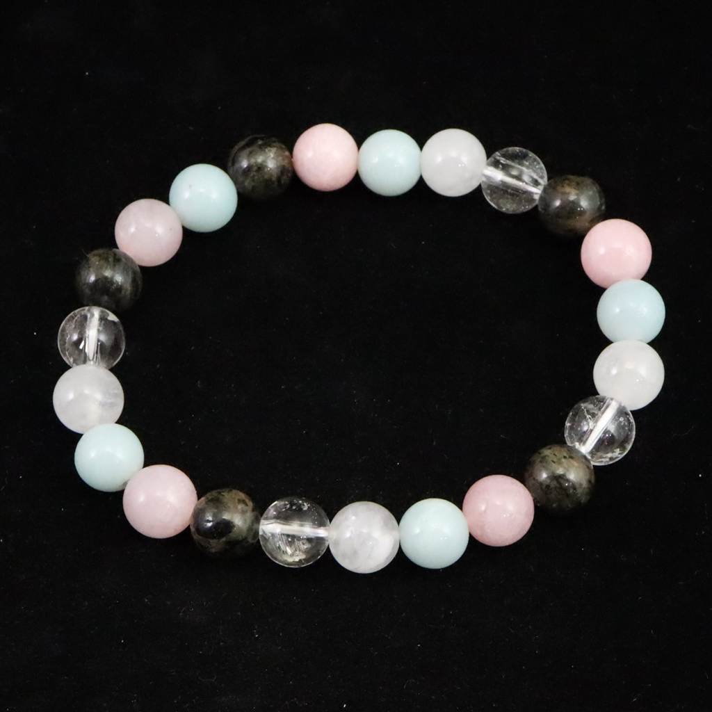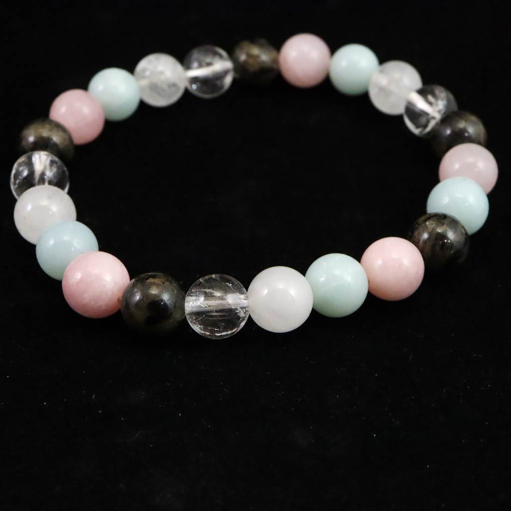 ◆ H&E社が提唱するシナジーブレスレットの【フェナカイト Joy, Love&Light (喜び、愛と光) 】です。ノルウェー産フェナカイト(黒)、サチャロカクリアアゼツライト(透明)、アゼツライト(白)、アズマー(青)、ピンクペタライトの5種類のパワーストーンを組み合わせとなります。