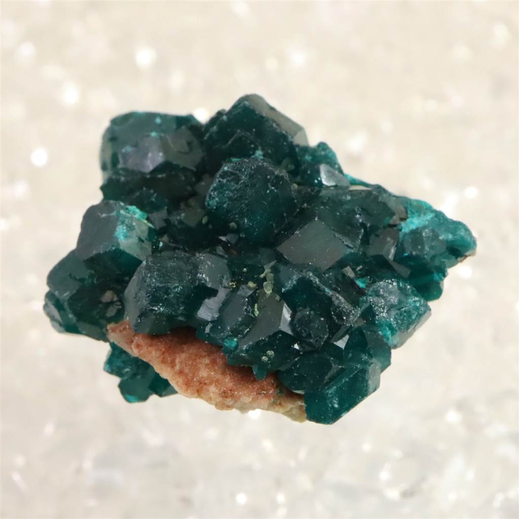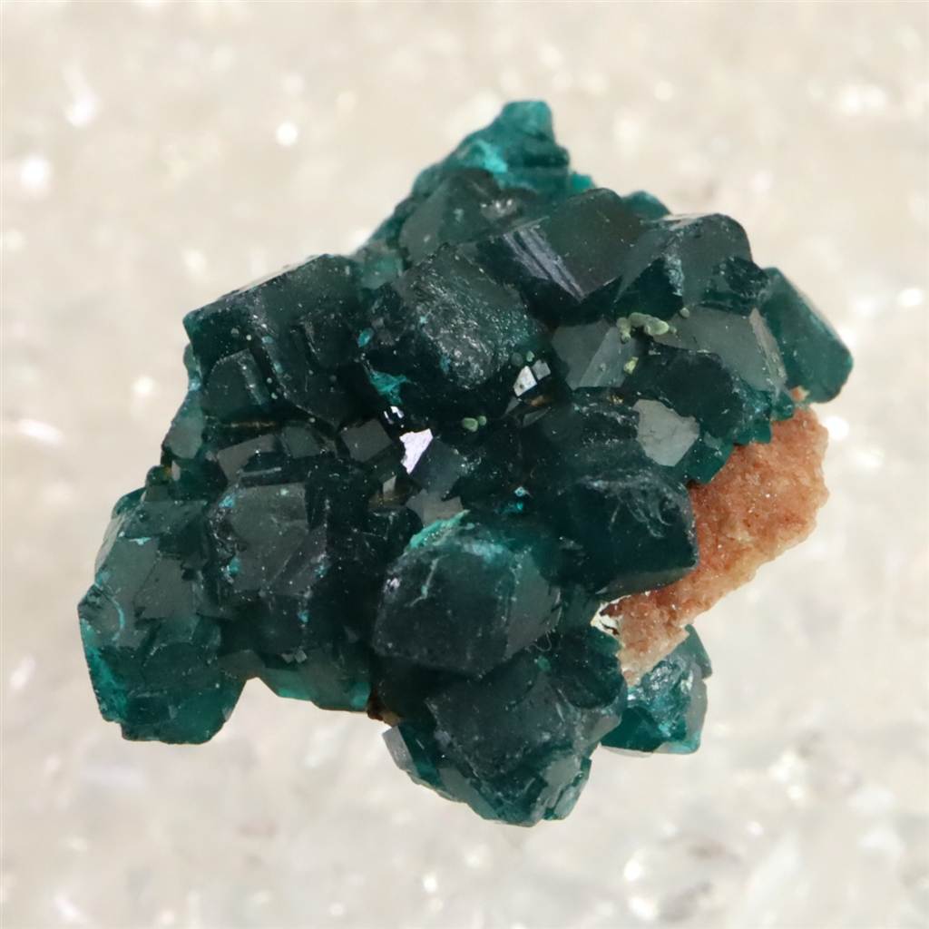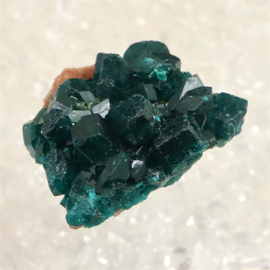◆ 銅を主成分とするケイ酸塩鉱物であり、その美しい緑色から、かつてはエメラルドと混同されていた歴史を持つダイオプテーズです。最大の特徴は、他の鉱物には見られないほどの深く濃い、彩度の高いグリーン(エメラルドグリーン)です。結晶は比較的小さなものが群生する形で産出されることが多く、光を受けると内部の劈開(へきかい)面が輝き、深遠な美しさを放ちます。硬度が低く非常に脆い性質を持つため、宝飾品として加工されることは稀で、その美しさをありのままに楽しむための観賞用標本として、世界中のコレクターから熱視線を浴びている鉱物です。