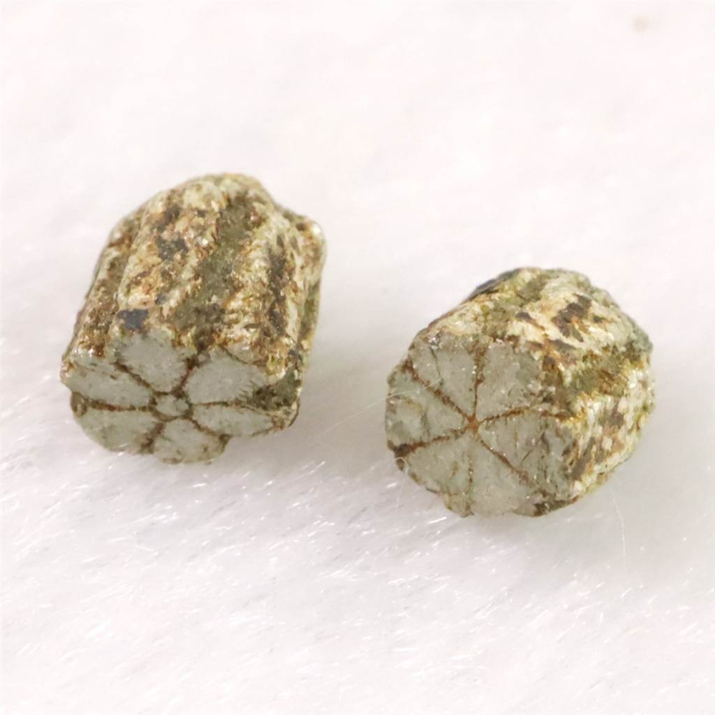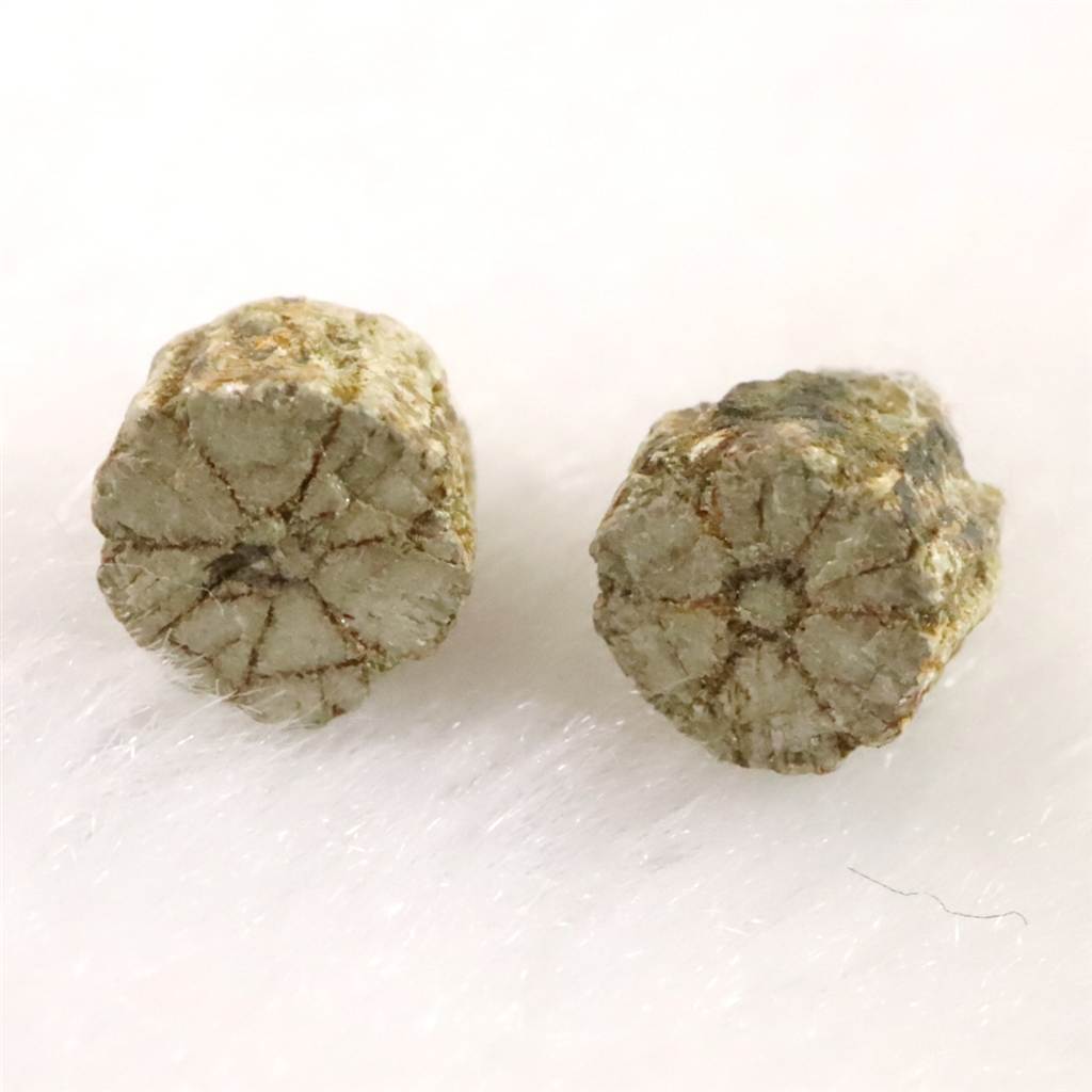 ◆ 京都府亀岡市にて産出される、日本を代表する鉱物「桜石」です。花崗閃緑岩の貫入による熱変成作用で生成された菫青石(きんせいせき)が、その後の熱水作用によって絹雲母や緑泥石(ピナイト)へと成分を変化させた「仮像(かぞう)」と呼ばれる状態の原石です。最大の特長は、3つの結晶が120度で交差する貫入双晶によって生み出される、断面の美しい6枚の花びら模様(擬六方結晶)です。亀岡産の桜石は適度に風化した母岩から結晶を分離しやすく、形状が明瞭に保存されていることから、近年では海外でも紹介される貴重な地質標本となっています。