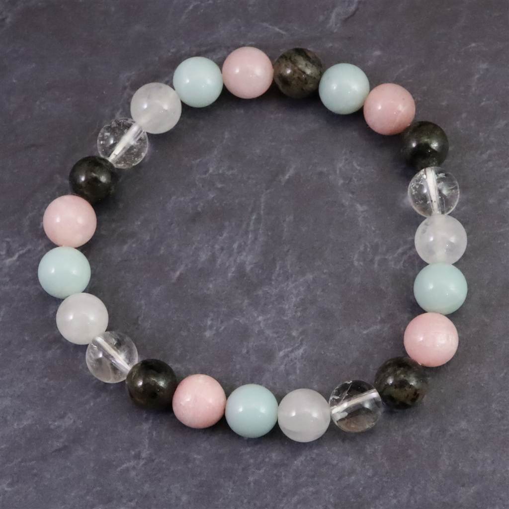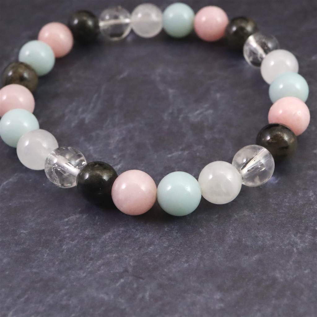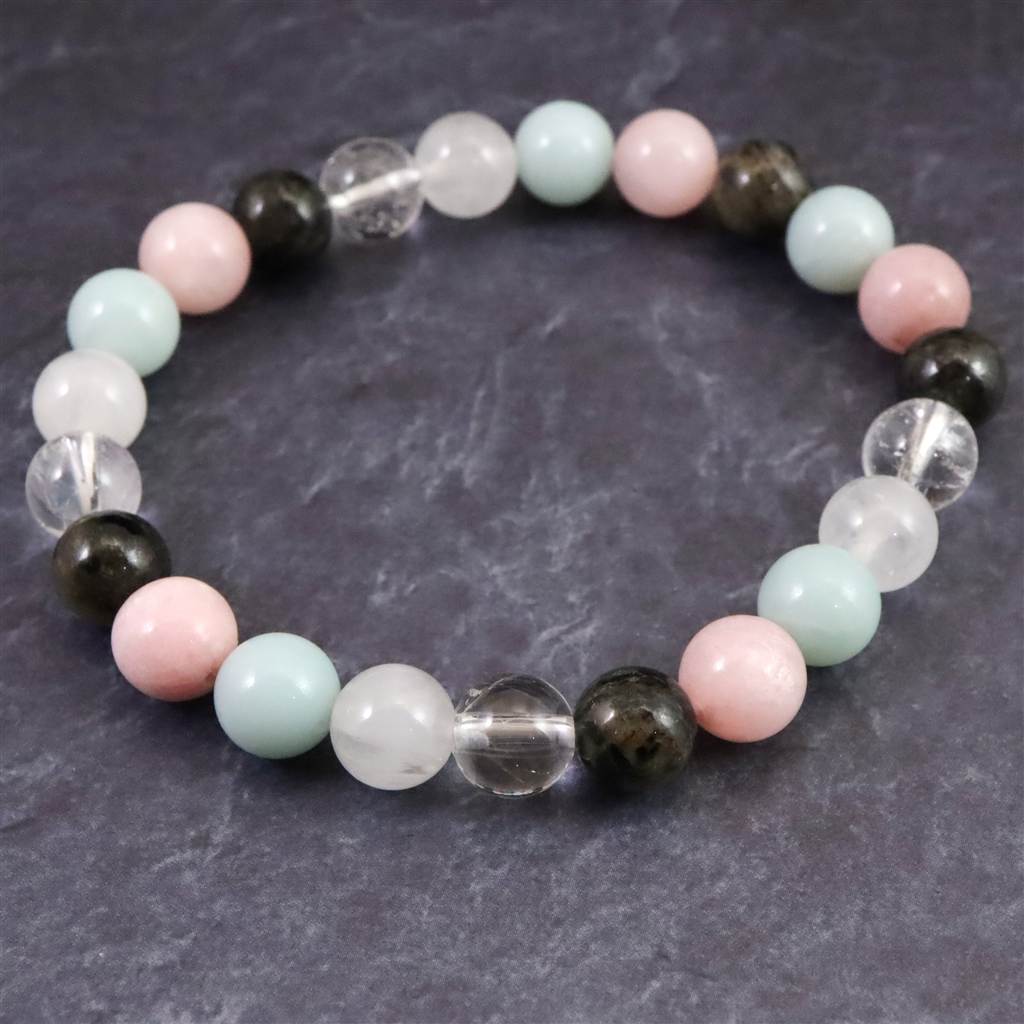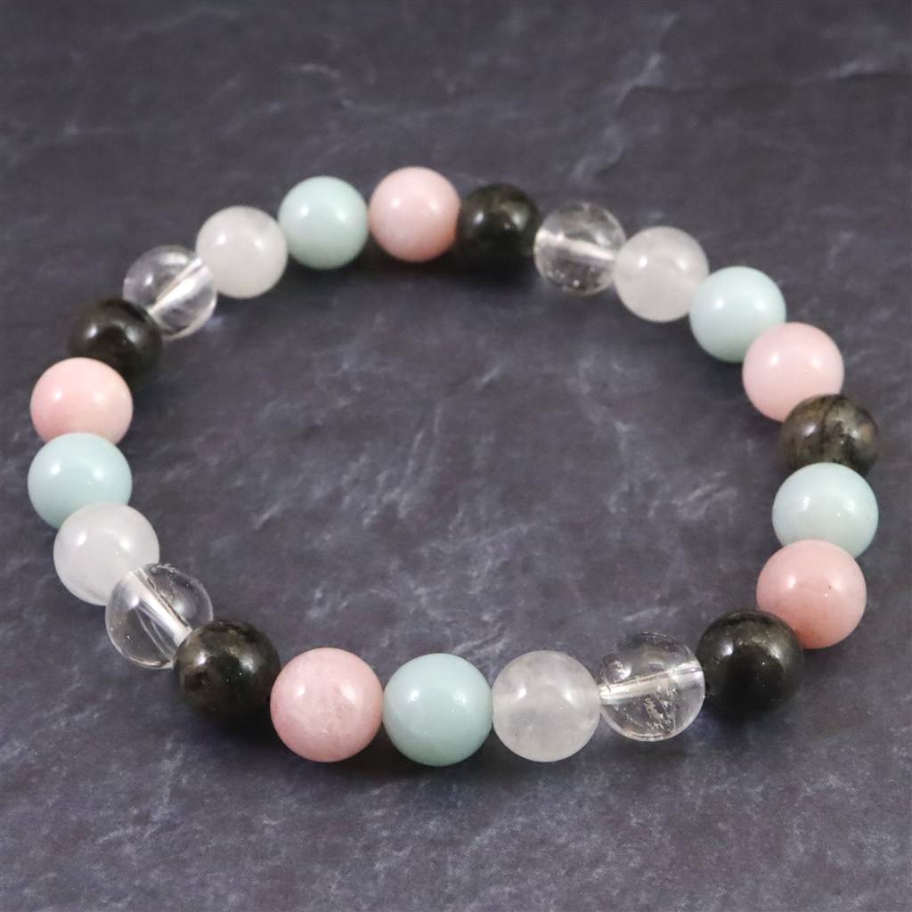 ◆ H&E社が提唱するシナジーブレスレットの【フェナカイト Joy, Love&Light (喜び、愛と光) 】です。ノルウェー産フェナカイト(黒)、サチャロカクリアアゼツライト(透明)、アゼツライト(白)、アズマー(青)、ピンクペタライトの5種類のパワーストーンを組み合わせとなります。