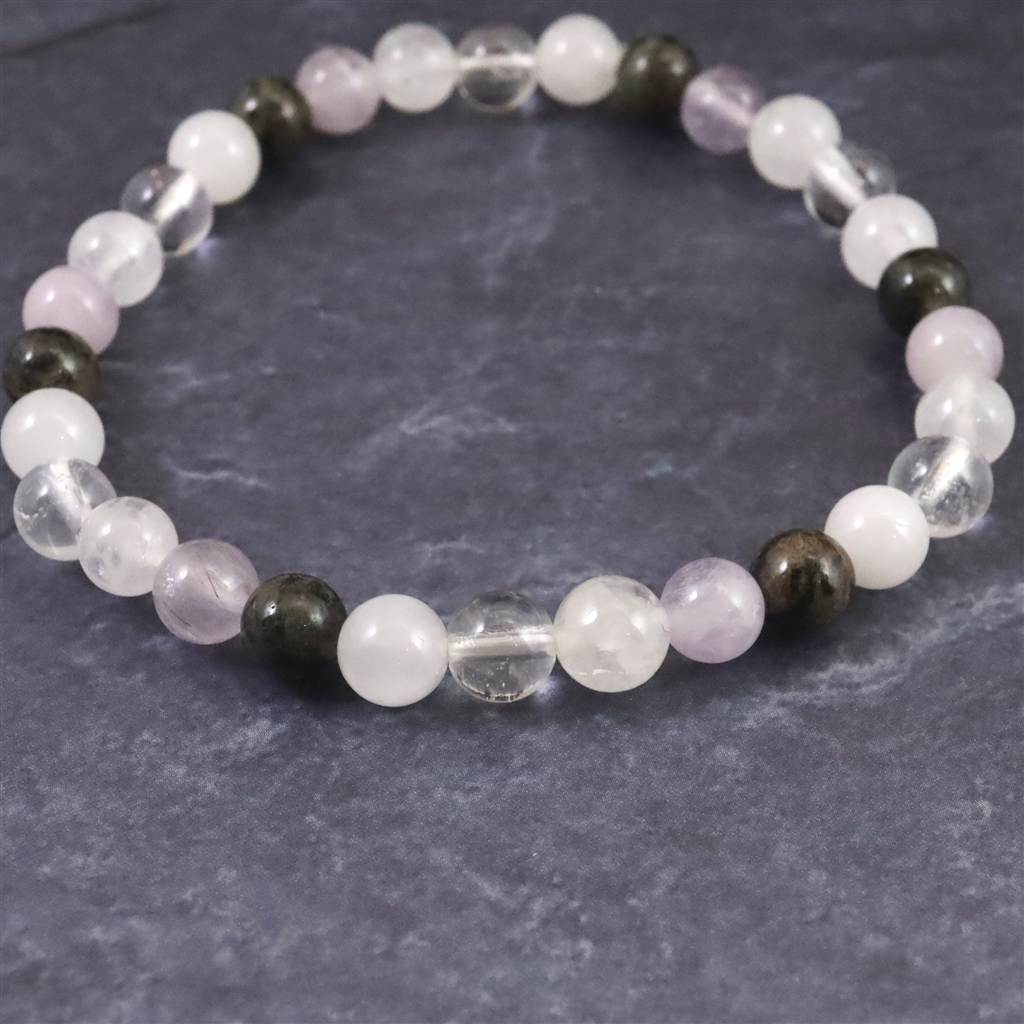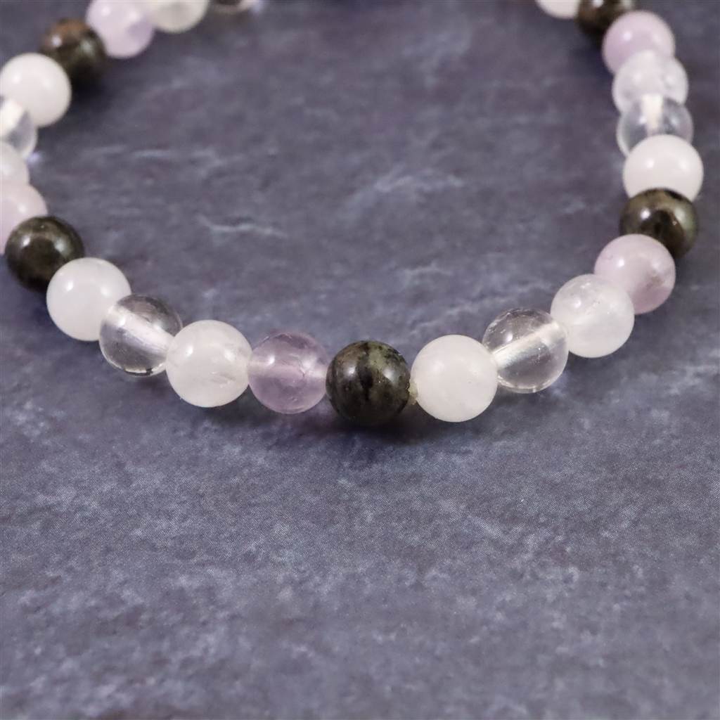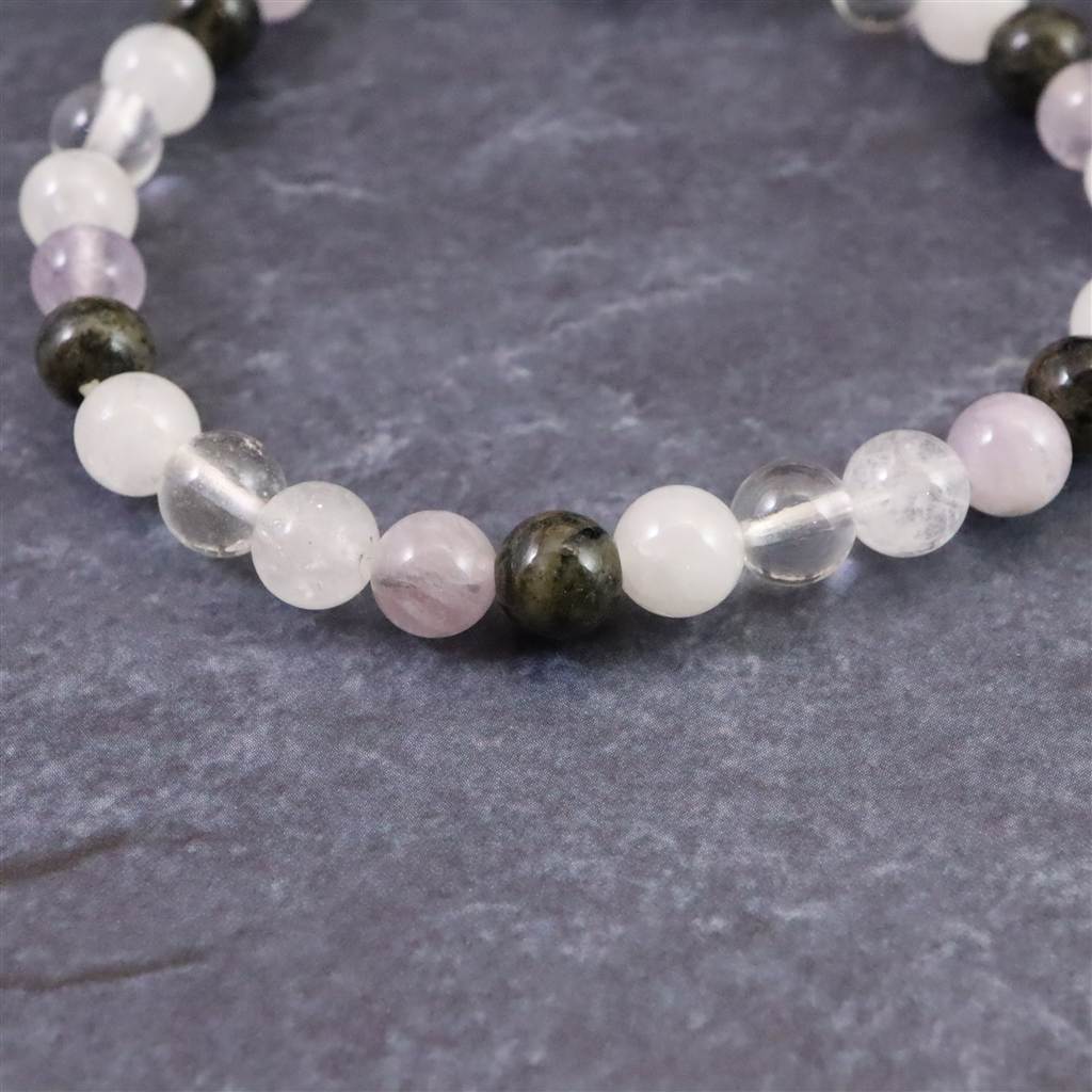 ◆ H&E社が提唱するシナジーブレスレットの【フェナカイトクリアライト(純粋な光) 】です。同社のノルウェー産フェナカイト(黒)、アマゼツ(紫)、アゼツライト(白)、NZアゼツライト(白)、サチャロカクリアアゼツライト(透明)の5種類のパワーストーンを組み合わせとなります。