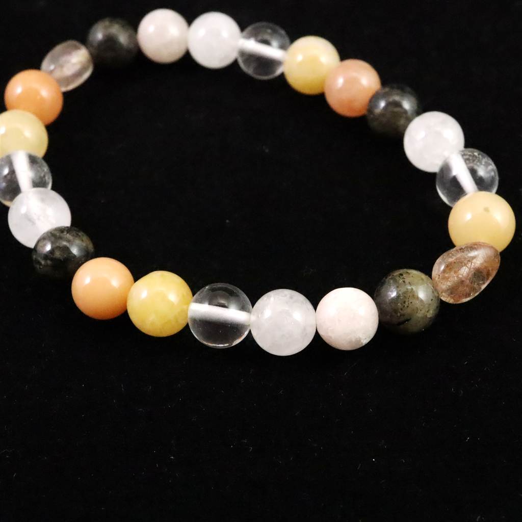 ◆ H&E社が提唱するシナジーブレスレットの【フェナカイトアセンション 】です。同社のノルウェー産フェナカイト(黒)、サチャロカクリアアゼツライト(透明)、アゼツライト(白)、ブルッカイト(フリーフォームビーズ)、ピンクペタライト、サチャロカイエローアゼツライト、サチャロカローズアゼツライトの7種類のパワーストーンを組み合わせとなります。
