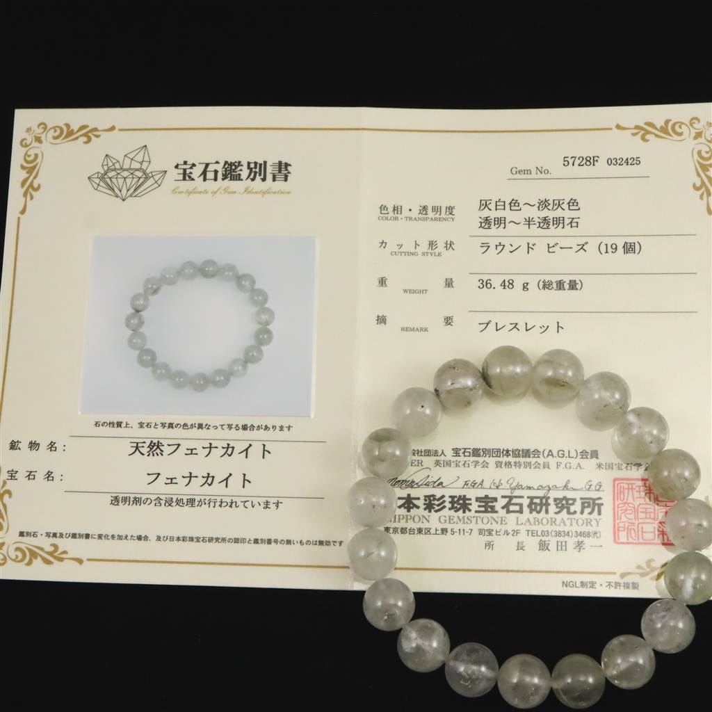 ◆ 本商品写真は現物のものです。写真の商品をお届けします。透明度の高いブラジル産のフェナカイトブレスレットです。日本彩珠宝石研究所の鑑別書付です。