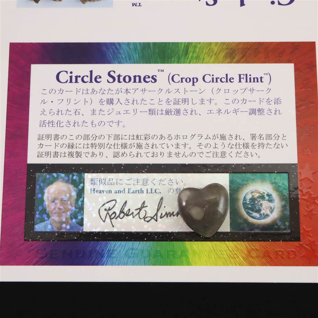 ◆ ロバート・シモンズ氏より....サークルストーン(クロップサークル・フリント)はイギリスのミステリーサークル内で見つかった天然のフリント(火打石)です。この高くチャージされたほぼ純粋なシリカ(水晶)は、ミステリーサークル(ミステリークロップサークル)内で発見されました。この石は、クロップサークル内で感じるのと同じエコーを発しており、霊的目覚め、サークルを作った存在との内的交流への道を開く助けとなる進化のお守りとなるでしょう。
