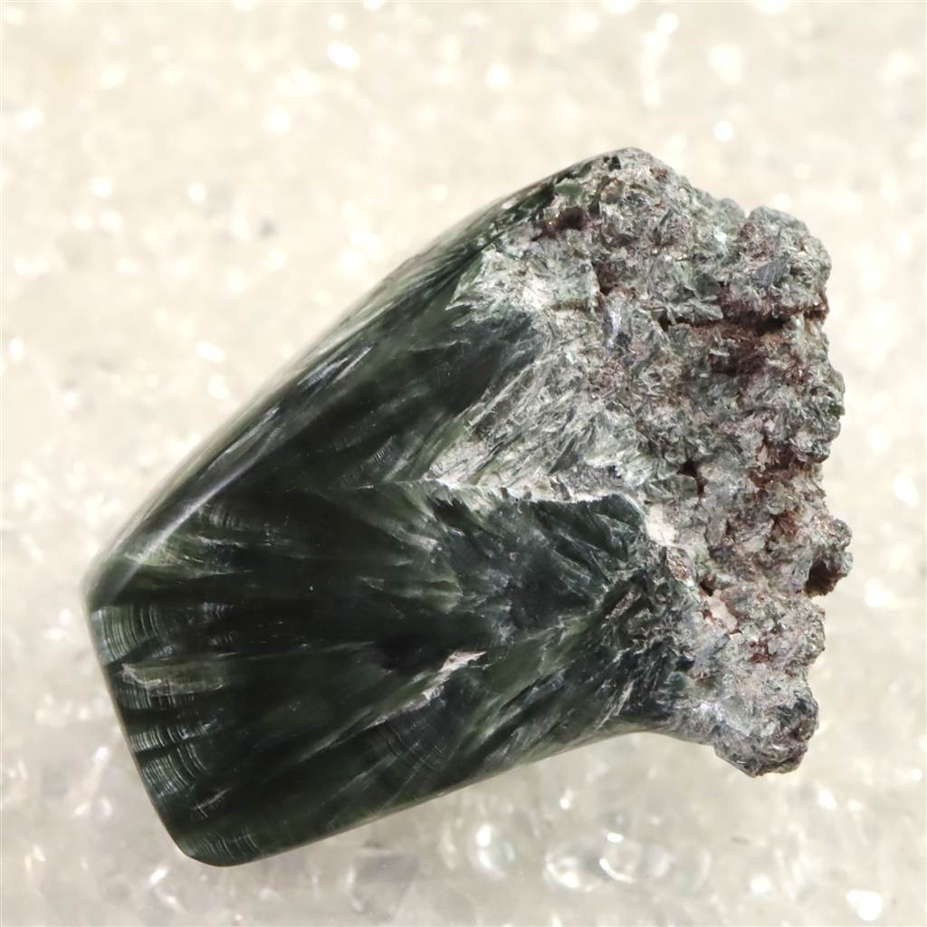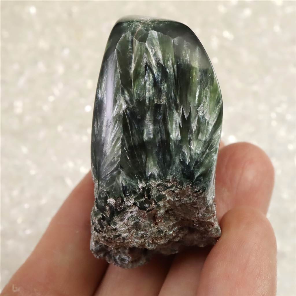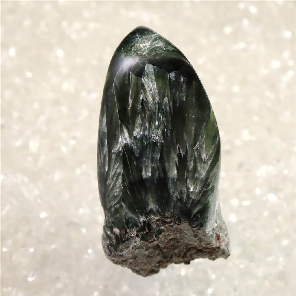 ◆ ロバートシモンズ氏より....セラフィナイトは濃緑色の基質全体に黄麗な銀色の光の羽を呈するクリノクロアの宝石の一種です。この石は天使界に共鳴し、特に地球と人類に健全でバフンスの取れた状態を取り戻させることに関わっている天使の領域に共鳴しています。この石の高い周波数のエネルギーはクンダリーニを剌激して脊柱を上昇させ、その途中にある各チャクラを次第に活性化します。セラフィナイトはすべての時代遅れのパターンや傾向の遺伝子の鋳型を除去するのを援助することができます。セラフィナイトは、私か感じてきた中で細胞の再生のために戻も効果的な石です。物質レベルにおいては、草に与える肥料のように作用し、純粋なヒーリングエネルギーをほとばしらせるようです。